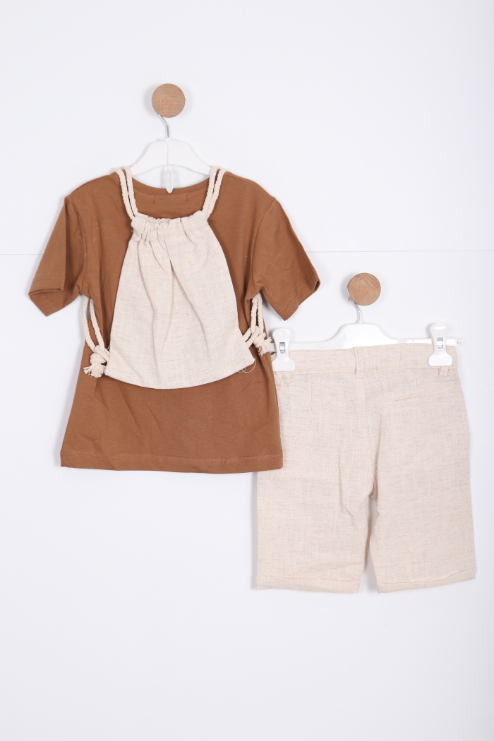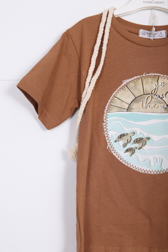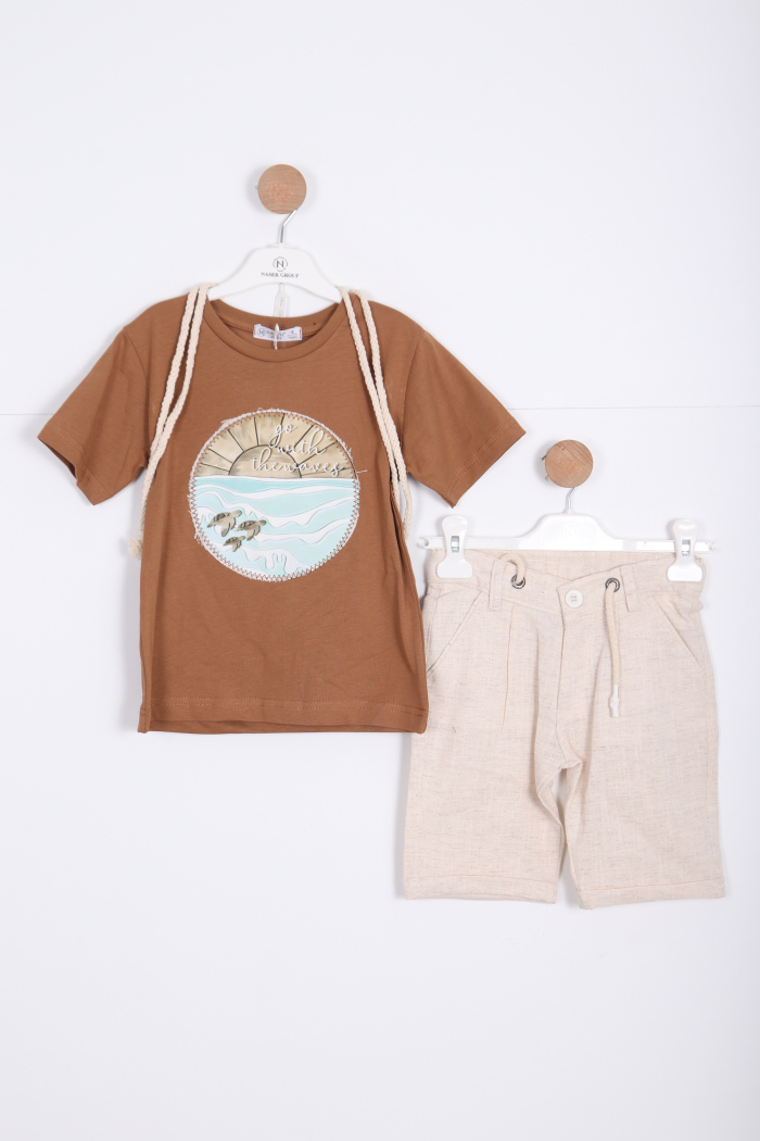 Bu erkek çocuk alt üst takımı, yaz ve bahar ayları için ideal bir seçimdir. Takım, turkuaz renkli, kısa kollu ve bisiklet yaka bir tişört ile doğal bej tonlarında, diz hizasında rahat kesimli şorttan oluşmaktadır. Tişörtün ön kısmında deniz ve güneş temalı, üzerinde "go with the waves" yazan şık ve eğlenceli bir baskı yer almaktadır. Şortta ise bel kısmında kordonlu bağlama detayı bulunmaktadır. Ayrıca, takımın sırtında uyumlu renginde ve kumaşında ip detaylı sade bir sırt çantası bulunmaktadır. Günlük kullanım için hem rahat hem şık bir kombin sunan bu set, çocukların hareket özgürlüğünü kısıtlamadan konfor sağlar.