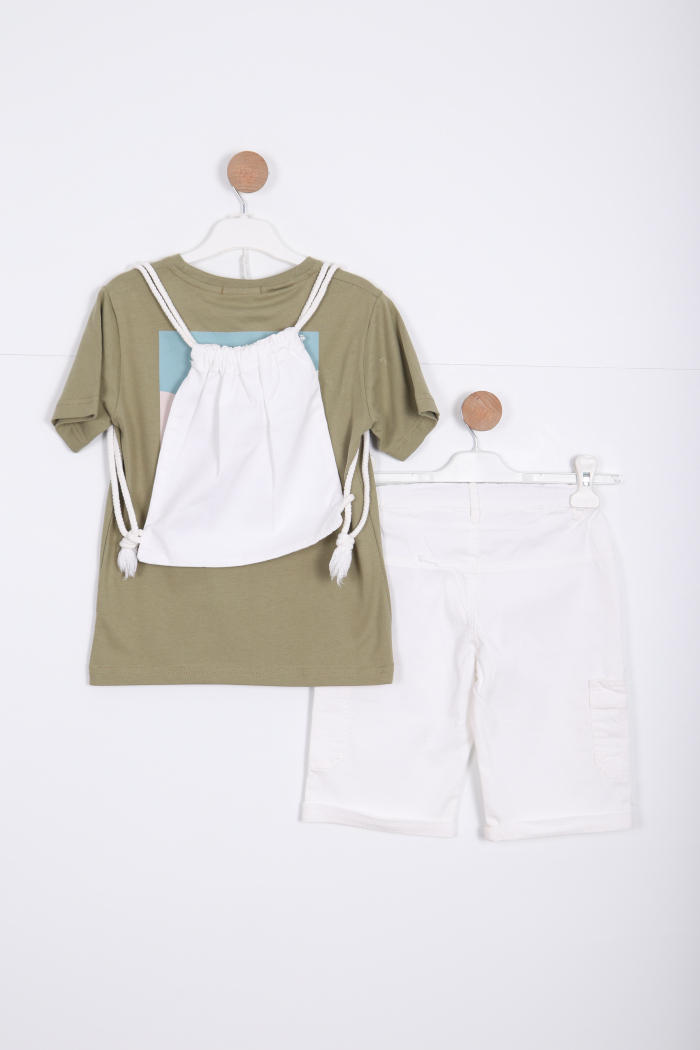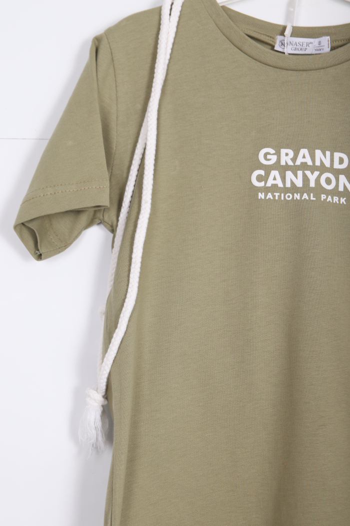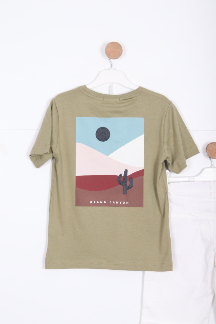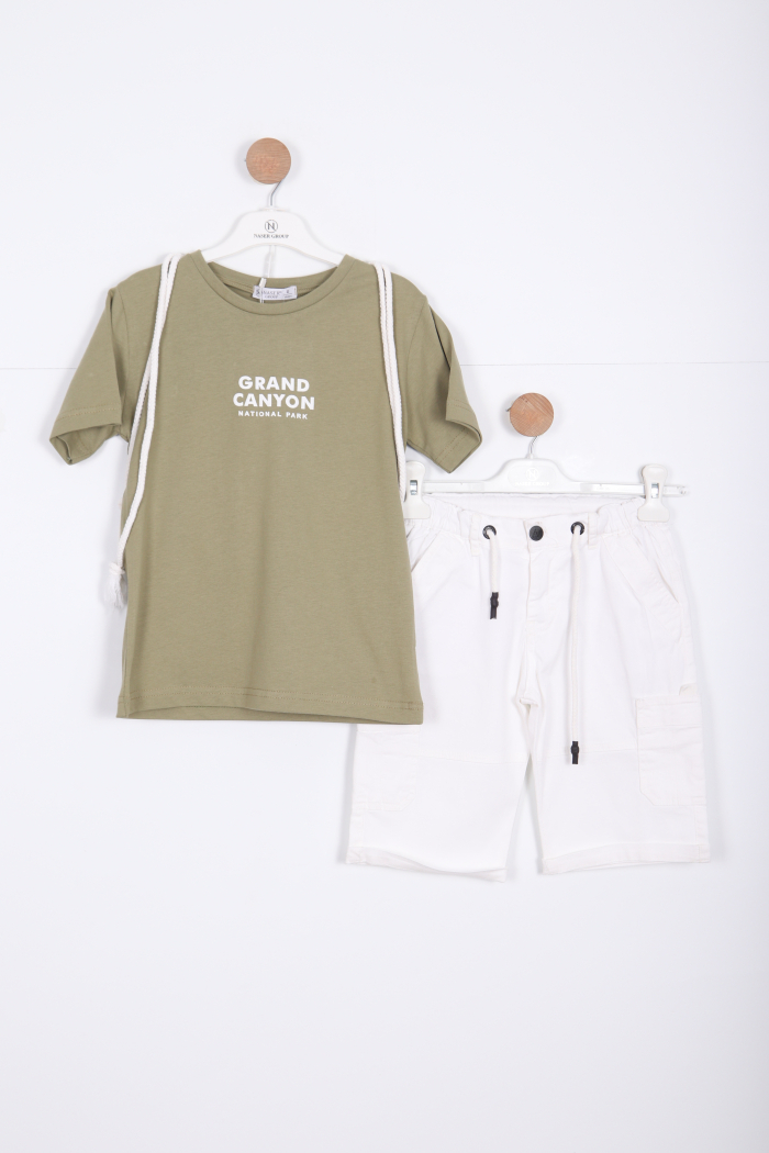Bu erkek çocuk alt üst takımı, rahat ve şık tasarımıyla günlük kullanıma uygundur. Kısa kollu, haki renkli tişört, bisiklet yaka ve göğüs kısmında "Grand Canyon National Park" baskısı ile dikkat çekiyor. Alt kısmında ise beyaz, diz hizasında kesime sahip şort, elastik bel ve kordon detaylarıyla konfor sağlıyor. Şort cepli ve sportif bir görünüme sahiptir. Yaz ayları için ideal, hareket özgürlüğü sunan hafif kumaştan üretilmiştir.