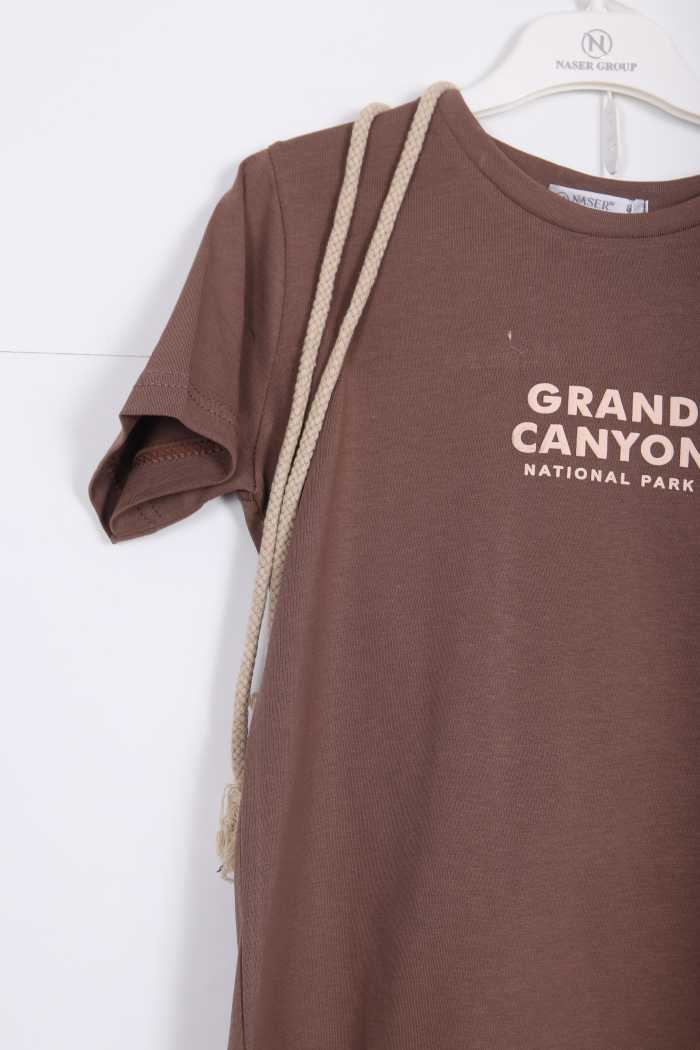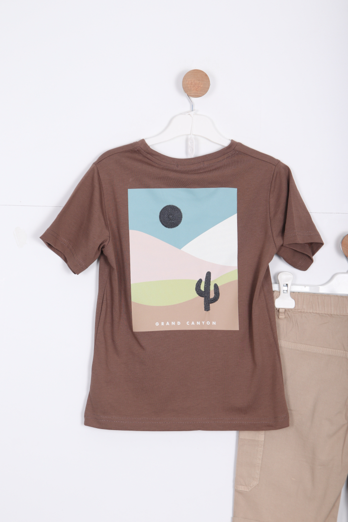 Bu erkek çocuk alt üst takımı, rahat ve şık tasarımıyla günlük kullanıma uygundur. Kısa kollu, haki renkli tişört, bisiklet yaka ve göğüs kısmında "Grand Canyon National Park" baskısı ile dikkat çekiyor. Alt kısmında ise beyaz, diz hizasında kesime sahip şort, elastik bel ve kordon detaylarıyla konfor sağlıyor. Şort cepli ve sportif bir görünüme sahiptir. Yaz ayları için ideal, hareket özgürlüğü sunan hafif kumaştan üretilmiştir.