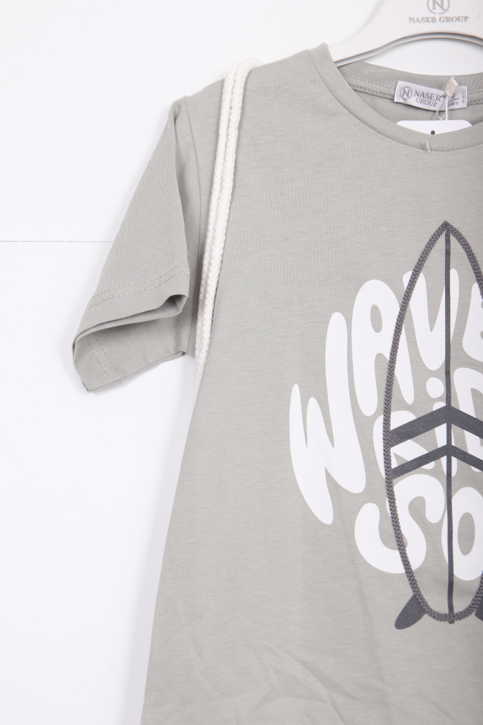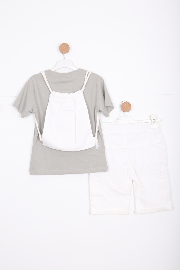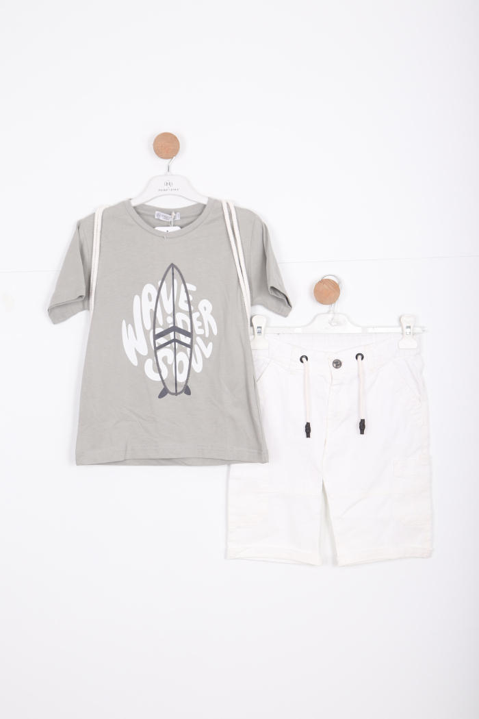 Bu erkek çocuk alt üst takımı, rahat ve şık tasarımı ile günlük kullanıma uygundur. Üst kısmı kısa kollu ve bisiklet yaka olup, ön yüzünde büyük bir sörf tahtası baskısı ve "Wave Surfer Soul" yazısı bulunmaktadır. Takımın üstünde ayrıca beyaz renkli, sırt çantası tarzında bir kordonlu aksesuar yer almaktadır. Alt kısmı ise diz altında biten beyaz renkli şort şeklindedir ve bel kısmında bağcıklı lastik detayı vardır. Şort cepli, rahat kesimdir. Takım, yaz ve bahar ayları için idealdir ve sportif, casual bir görünüm sunar.