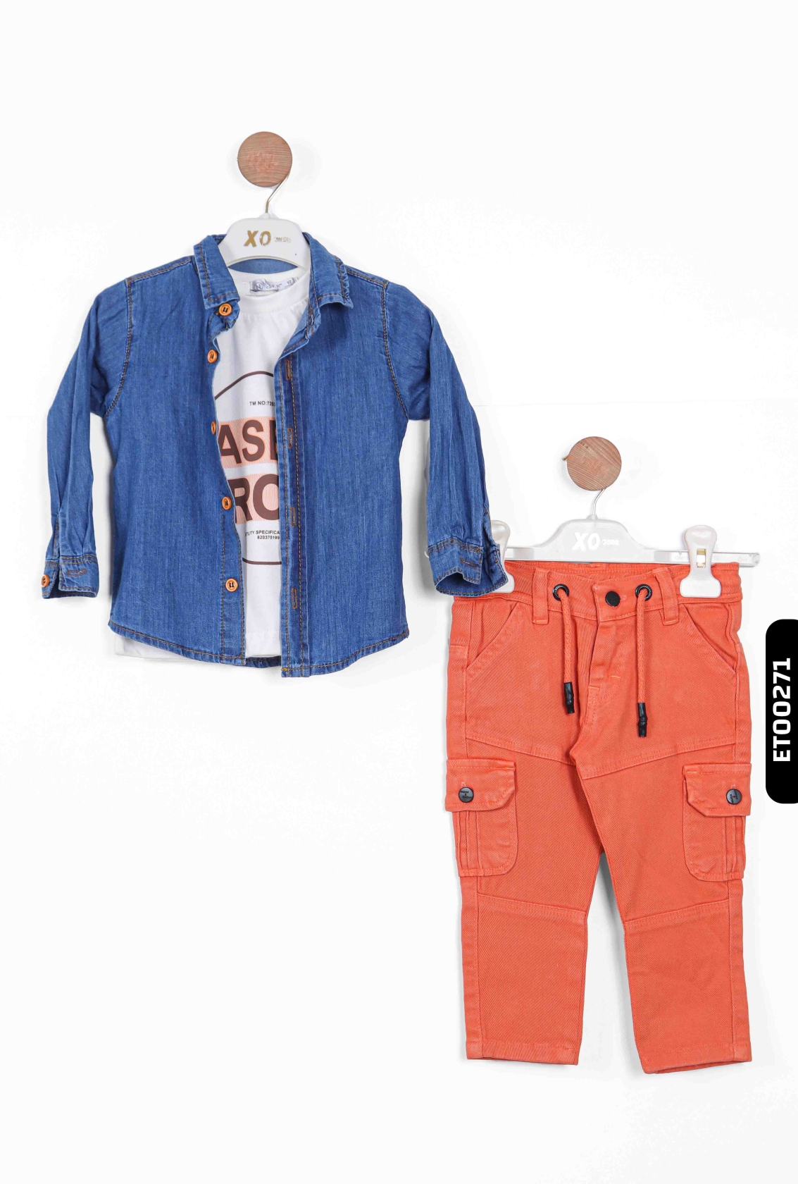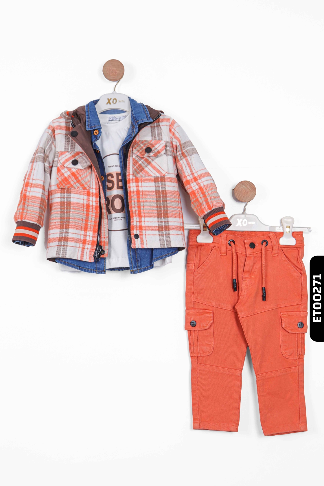 Bu erkek çocuk alt üst takımı, şıklığı ve fonksiyonelliği bir arada sunar. Takım, içi ekose desenli kapüşonlu ve fermuarlı bir ceket, altında kot görünümlü gömlek ve baskılı tişört ile tamamlanıyor. Keten kahverengi renkli pantolon, cepli ve kordonlu detayıyla rahatlık ve tarz sağlar. Ceket uzun kollu olup, manşetlerinde renkli çizgiler vardır. Takım, günlük kullanıma uygun, rahat ve modern bir stil sunar.