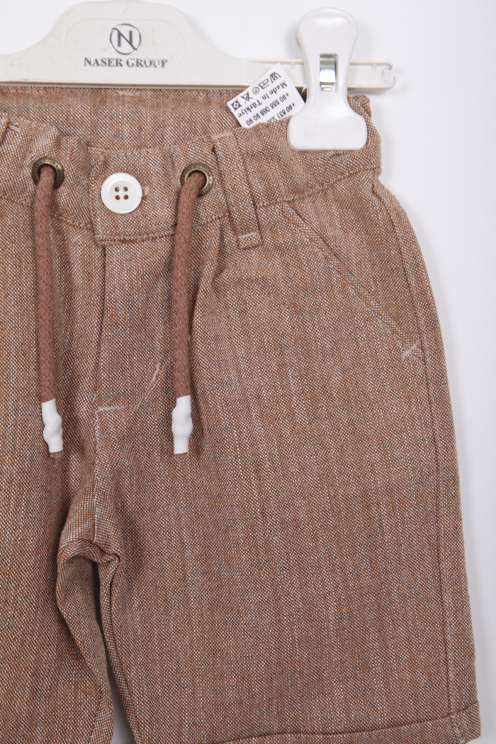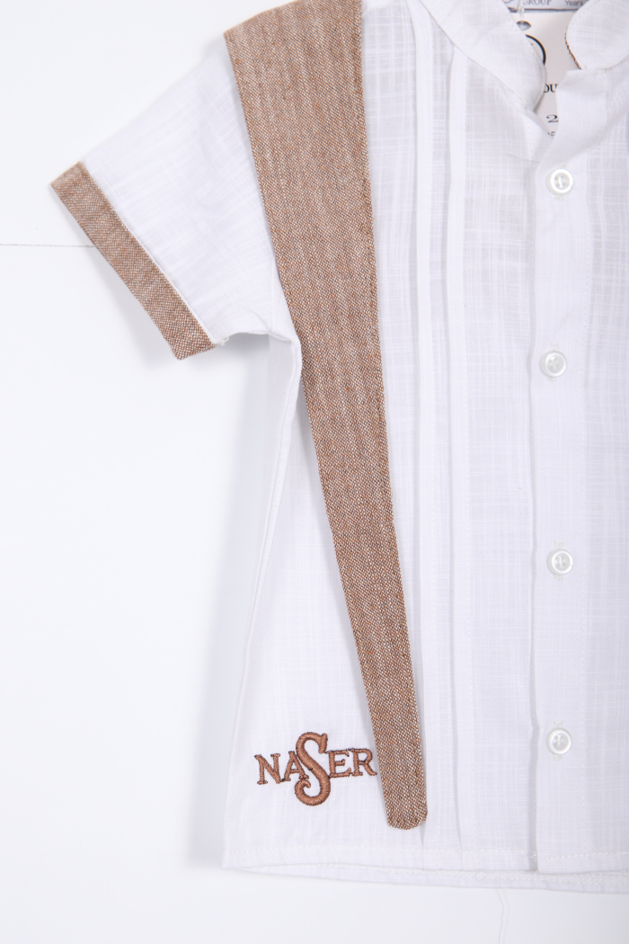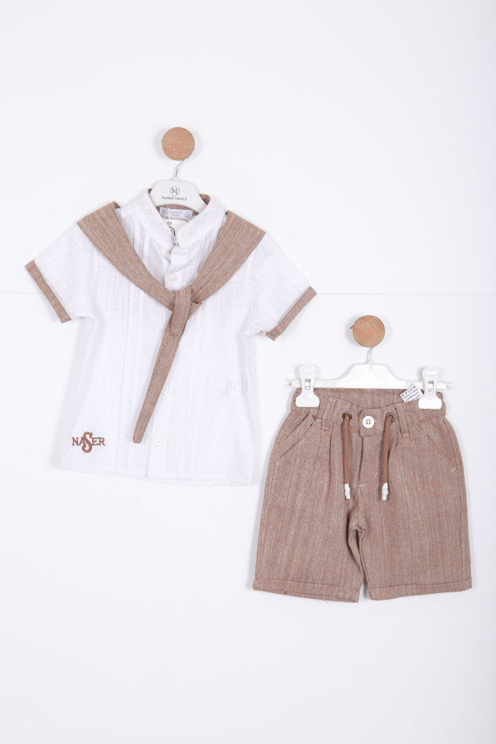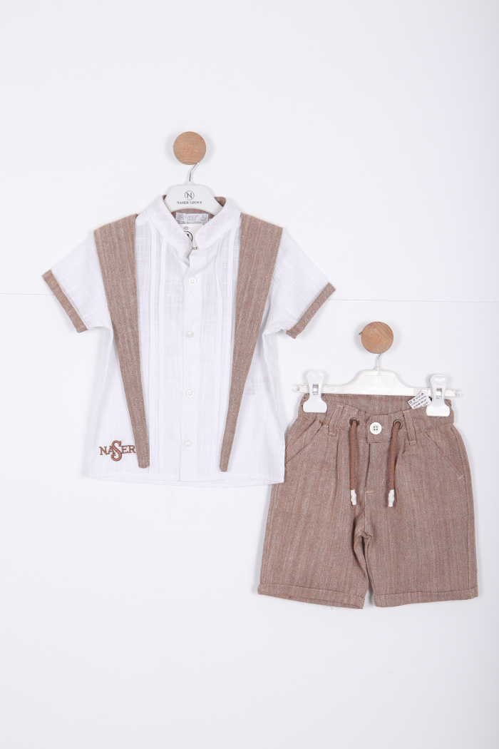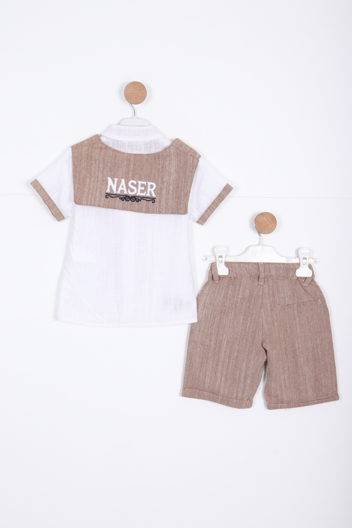 Bu erkek çocuk alt üst takımı, rahatlığı ve şıklığı bir arada sunuyor. Beyaz kısa kollu gömlek, bisiklet yaka ve önünde düğmelerle tasarlanmıştır. Gömlek üzerinde kahverengi tonlarında, süveter görünümü veren detaylar ve kol uçlarında aynı renkte şeritler bulunur. Ayrıca gömleğin sırtında "NASER" yazısı işlenmiştir. Alt ise diz hizasında, kahverengi çizgili, kordonlu ve cepli şort şeklindedir. Hem günlük kullanım hem de özel günler için uygundur.