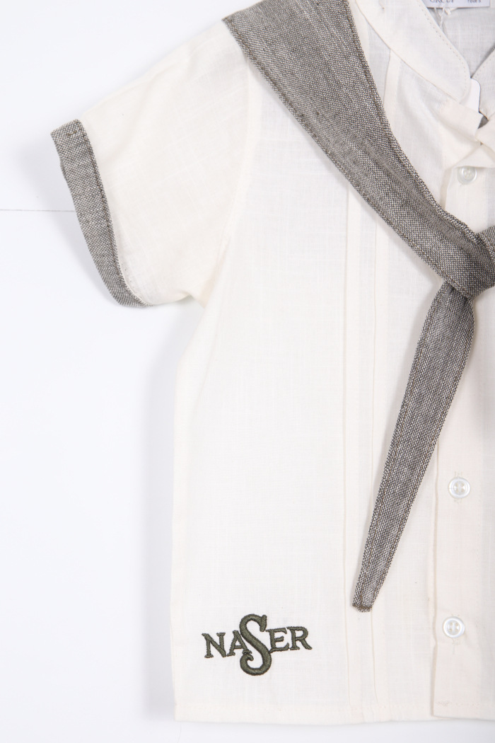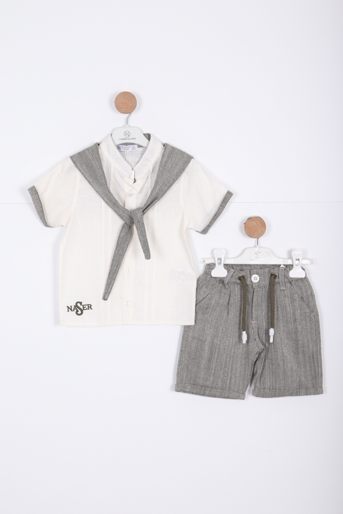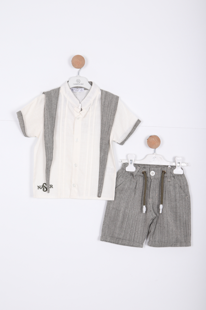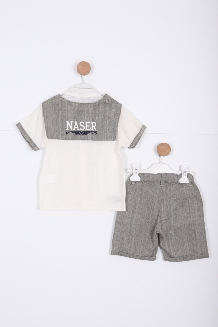 Bu erkek çocuk alt üst takımı, rahatlığı ve şıklığı bir arada sunuyor. Beyaz kısa kollu gömlek, bisiklet yaka ve önünde düğmelerle tasarlanmıştır. Gömlek üzerinde kahverengi tonlarında, süveter görünümü veren detaylar ve kol uçlarında aynı renkte şeritler bulunur. Ayrıca gömleğin sırtında "NASER" yazısı işlenmiştir. Alt ise diz hizasında, kahverengi çizgili, kordonlu ve cepli şort şeklindedir. Hem günlük kullanım hem de özel günler için uygundur.