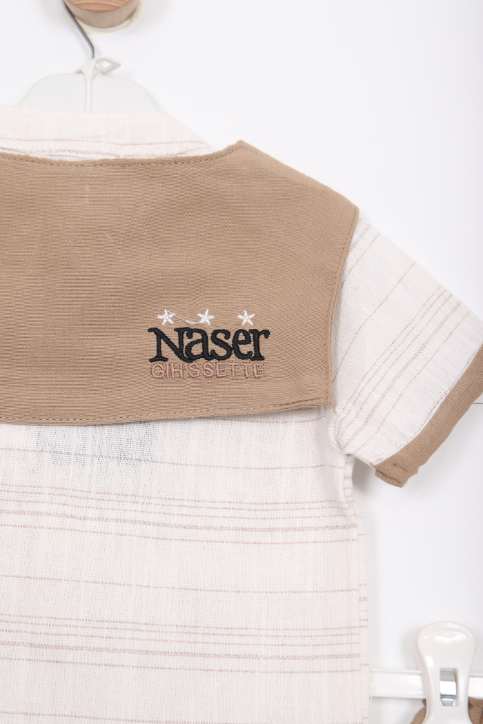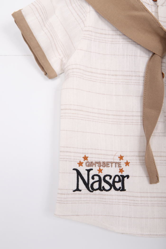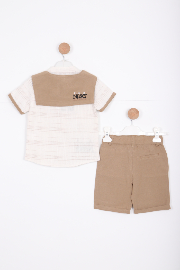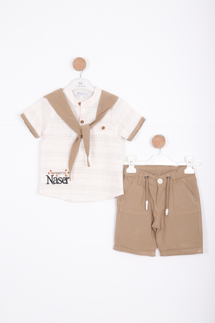 Erkek çocuklar için tasarlanmış bu alt üst takımı, hem şık hem de rahat bir yaz kombinidir. Kısa kollu, bisiklet yaka gömlek, bej rengi detaylarla ve hafif çizgili deseniyle sade bir görünüm sunar. Gömleğin ön kısmında düğmeler ve küçük bir cep detayı bulunur. Üstteki bej rengi fular detayı, kıyafete ayrı bir sevimlilik ve özgünlük katar. Alt kısmı ise, kordonlu ve cepli şort modeliyle hareket özgürlüğü sağlar. Takımın renk uyumu ve minimalist tasarımı ile günlük kullanımda rahatlıkla tercih edilebilir.