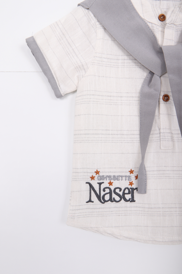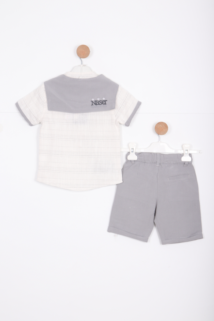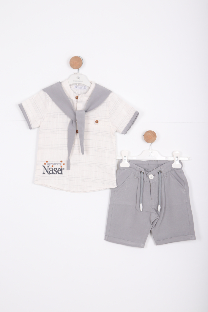Erkek çocuklar için tasarlanmış bu alt üst takımı, hem şık hem de rahat bir yaz kombinidir. Kısa kollu, bisiklet yaka gömlek, bej rengi detaylarla ve hafif çizgili deseniyle sade bir görünüm sunar. Gömleğin ön kısmında düğmeler ve küçük bir cep detayı bulunur. Üstteki bej rengi fular detayı, kıyafete ayrı bir sevimlilik ve özgünlük katar. Alt kısmı ise, kordonlu ve cepli şort modeliyle hareket özgürlüğü sağlar. Takımın renk uyumu ve minimalist tasarımı ile günlük kullanımda rahatlıkla tercih edilebilir.