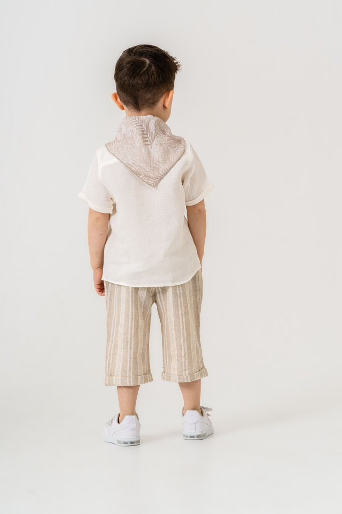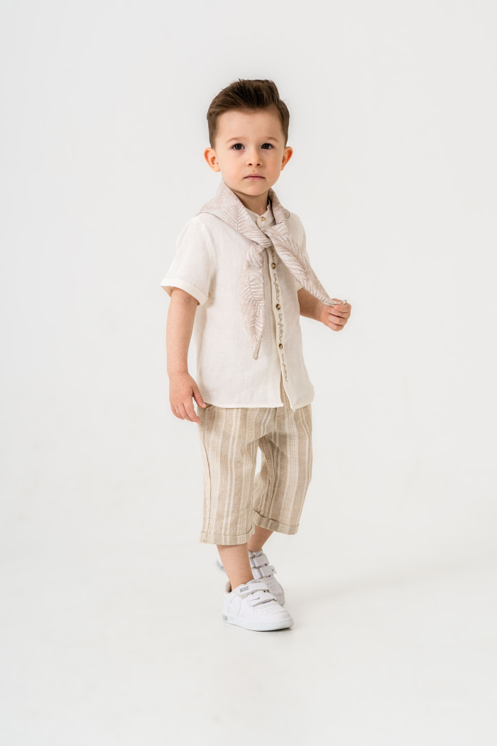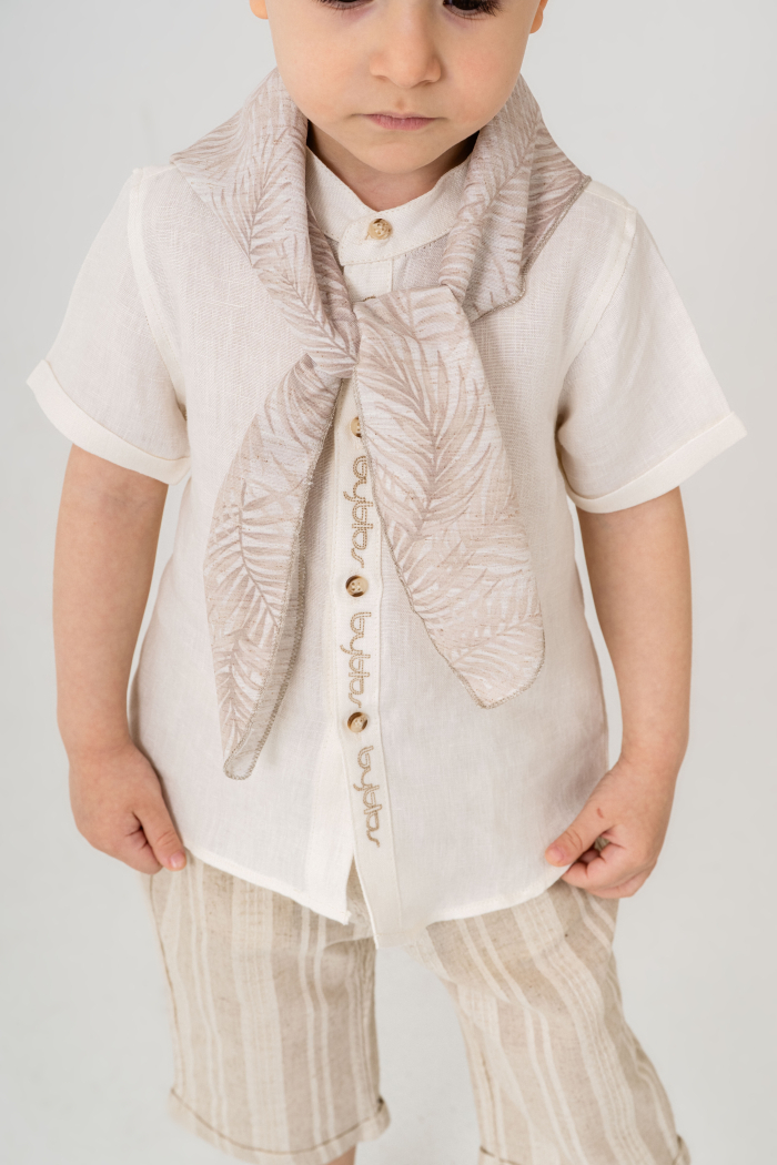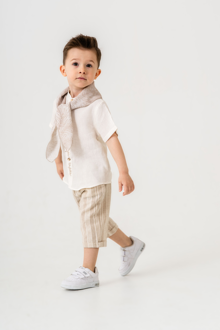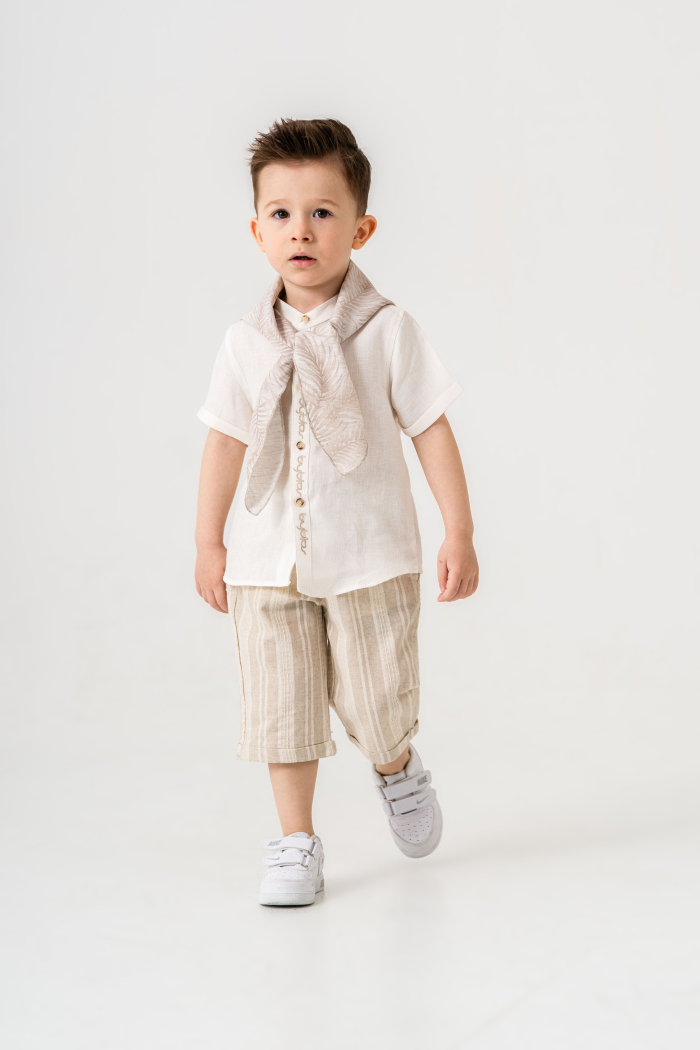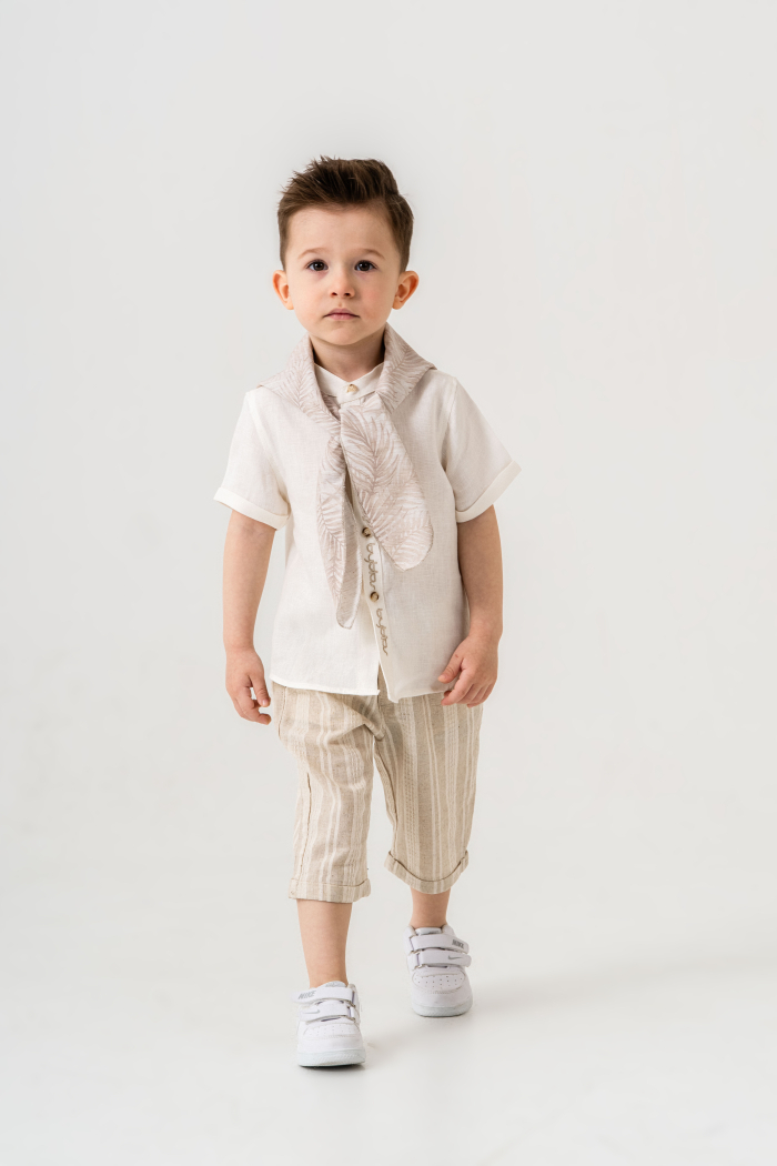 Bu erkek çocuk alt üst takımı, rahat ve şık tasarımıyla çocukların günlük kullanımına uygundur. Üstü kısa kollu ve düğmeli gömlek tarzında olup, yakasına bağlanmış ince, yaprak desenli şal detayı bulunmaktadır. Alt ise diz boyu, bej tonlarında, ince çizgili, rahat kesim pantolondur. Takım, doğal ve hafif renkleriyle özellikle yaz aylarında tercih edilebilir. Spor ayakkabılarla kombinlenerek hem rahat hem de şık bir görünüm sağlar.