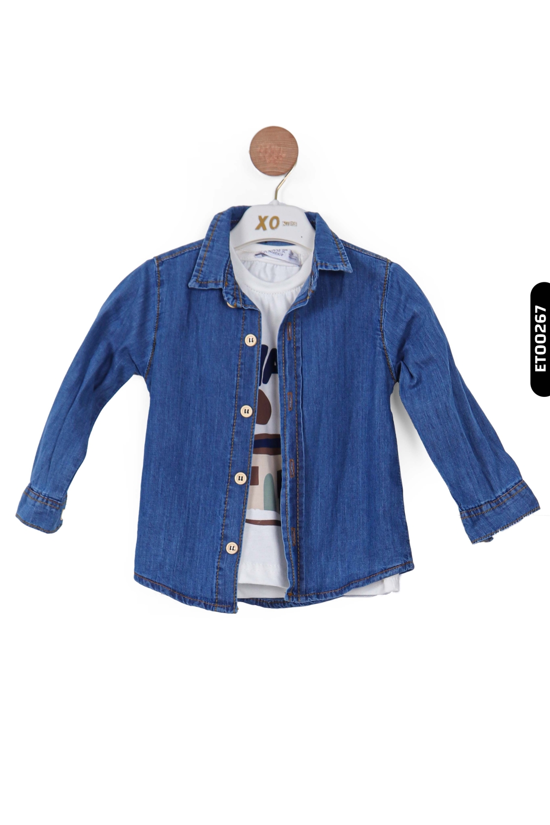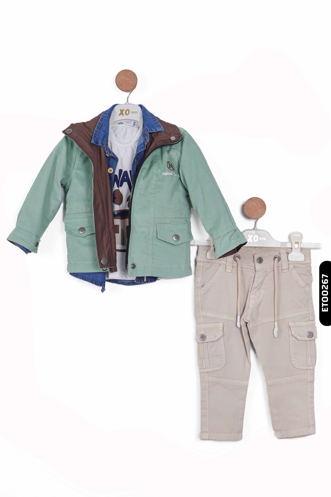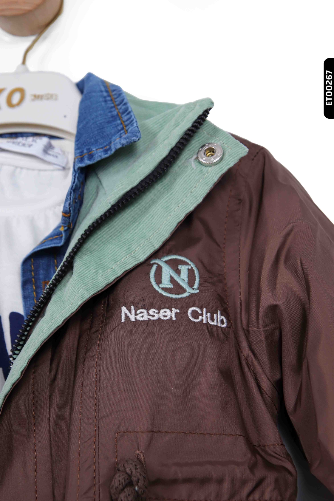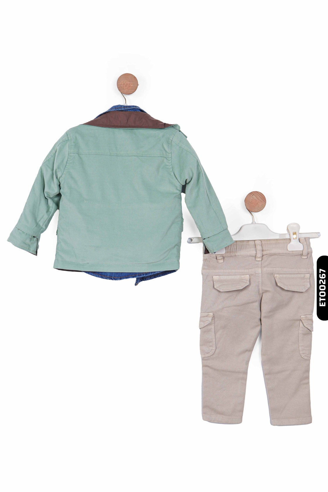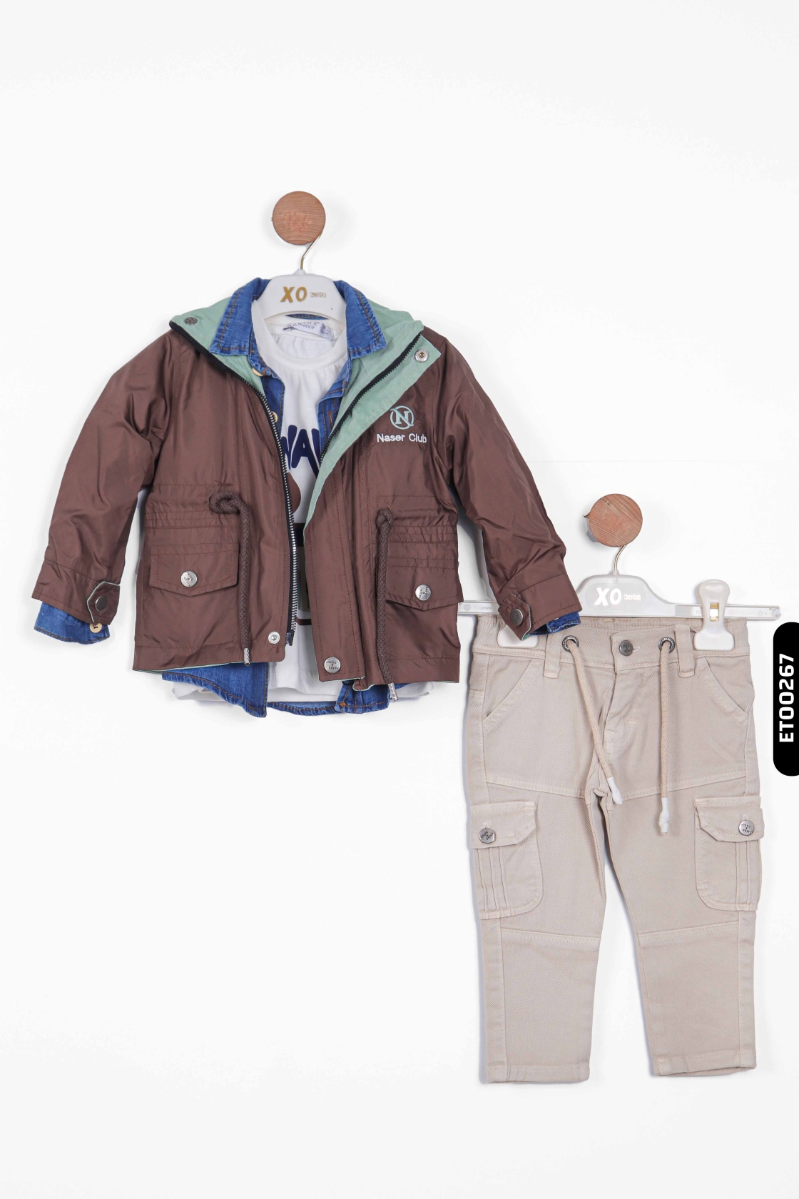 Bu erkek çocuk alt üst takımı, şık ve fonksiyonel detaylarıyla dikkat çekiyor. Üstte, iki farklı renk seçeneği sunan (kahverengi ve yeşil) kapüşonlu mont bulunur. Mont fermuarlı ve düğmeli kapama özelliğine sahiptir. Ayrıca bel kısmında kordon detayı ile ayarlanabilir yapısı vardır. İçinde kot görünümlü, uzun kollu ve düğmeli gömlek ile beyaz baskılı bir tişört bulunur. Alt ise cepli, düğmeli ve kordonlu pantolon olarak tasarlanmıştır. Takım, günlük kullanım için ideal, rahat ve sportif bir stil sunar.