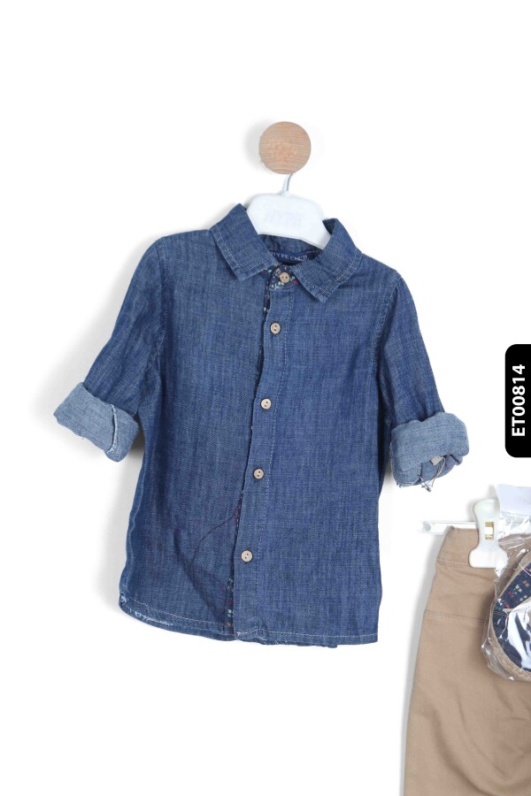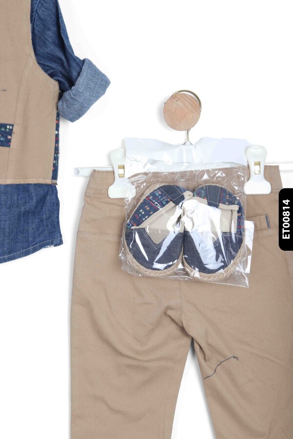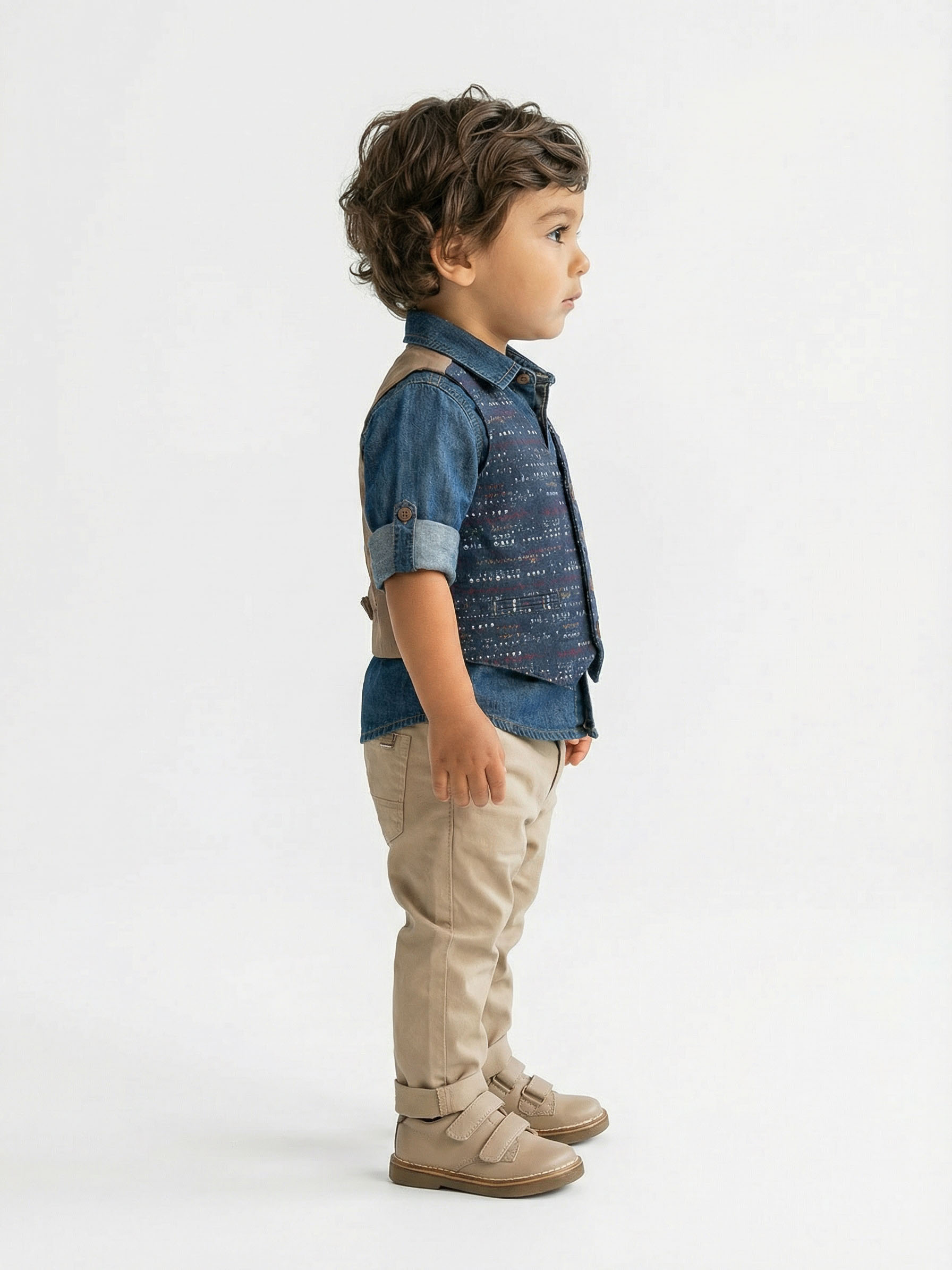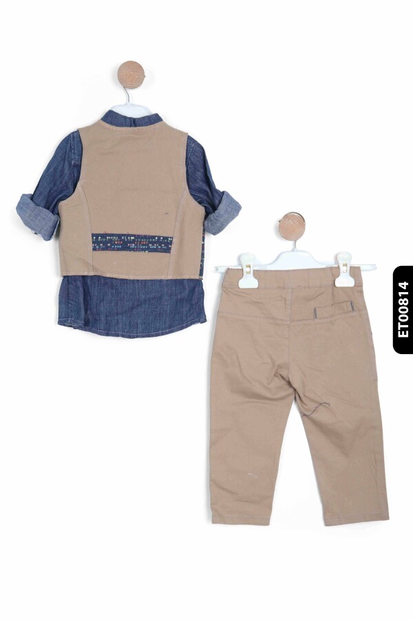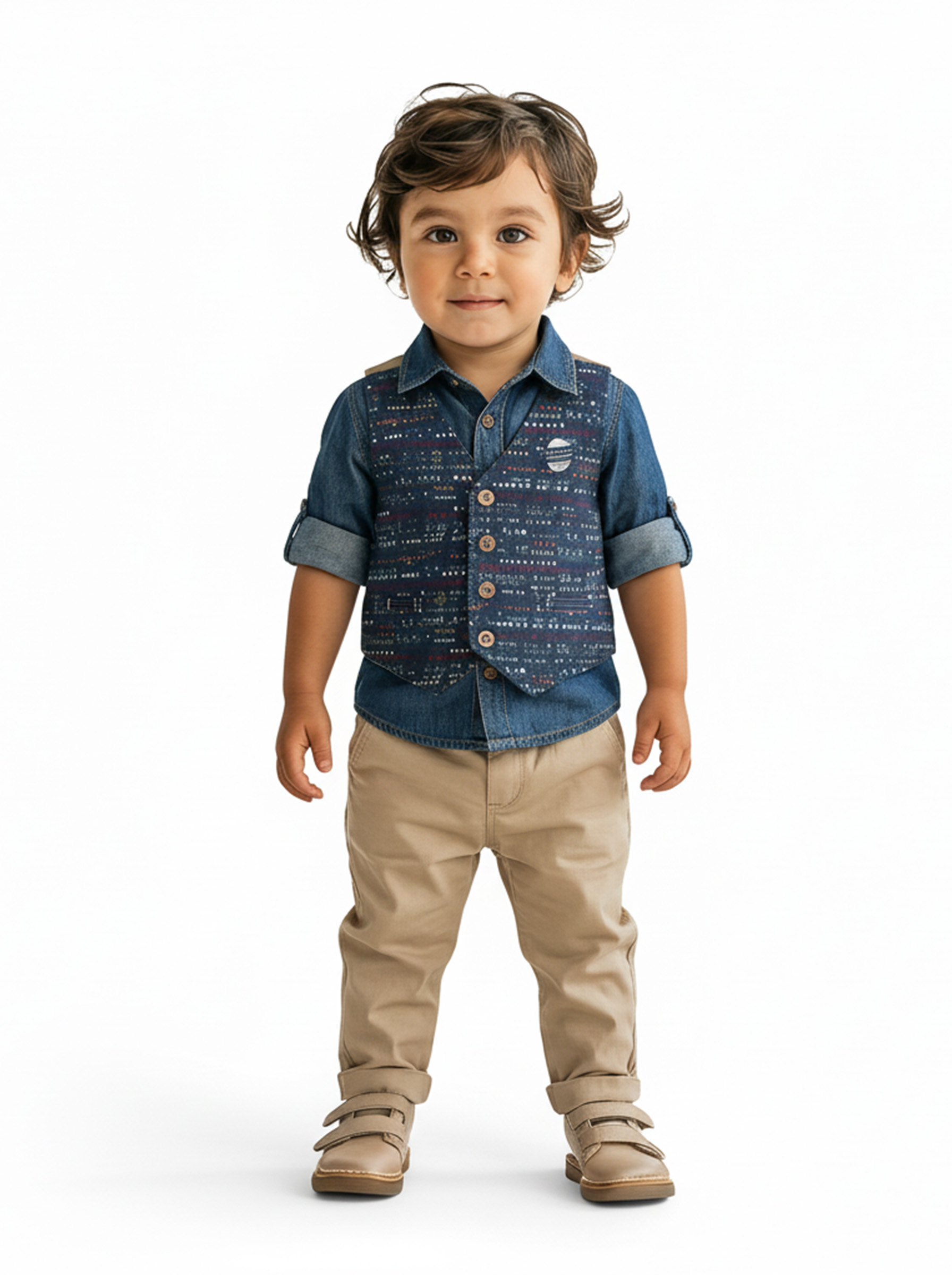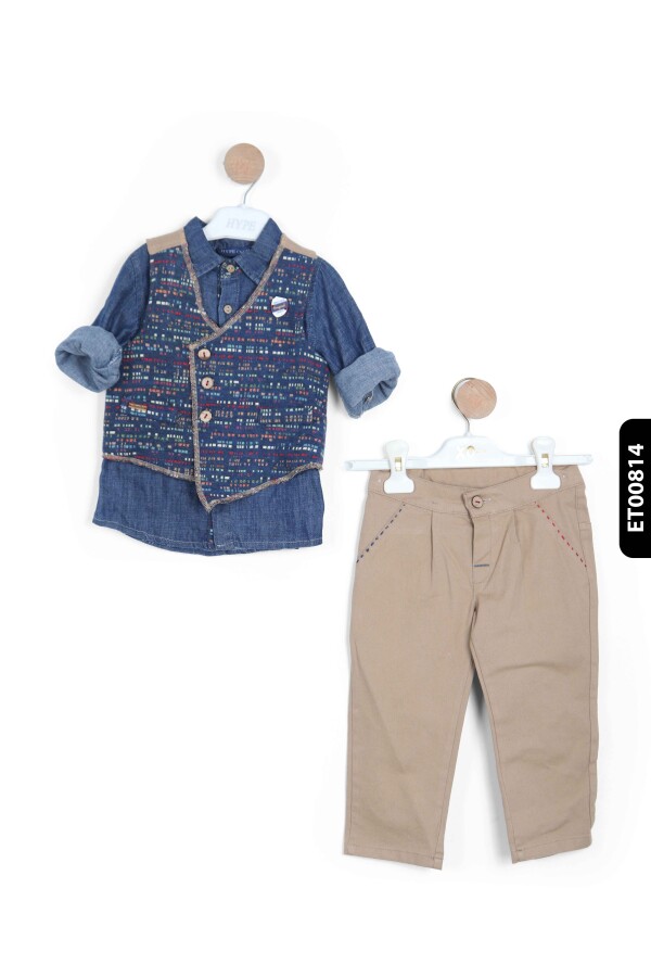 Çocuklarınız için mükemmel bir seçim! Bu şık pantolon takımı, hem rahat hem de şık bir görünüm sunuyor. Üst kısmında desenli bir yelek ile denim gömlek yer alıyor. Pantolon ise modern bir kesime sahip.