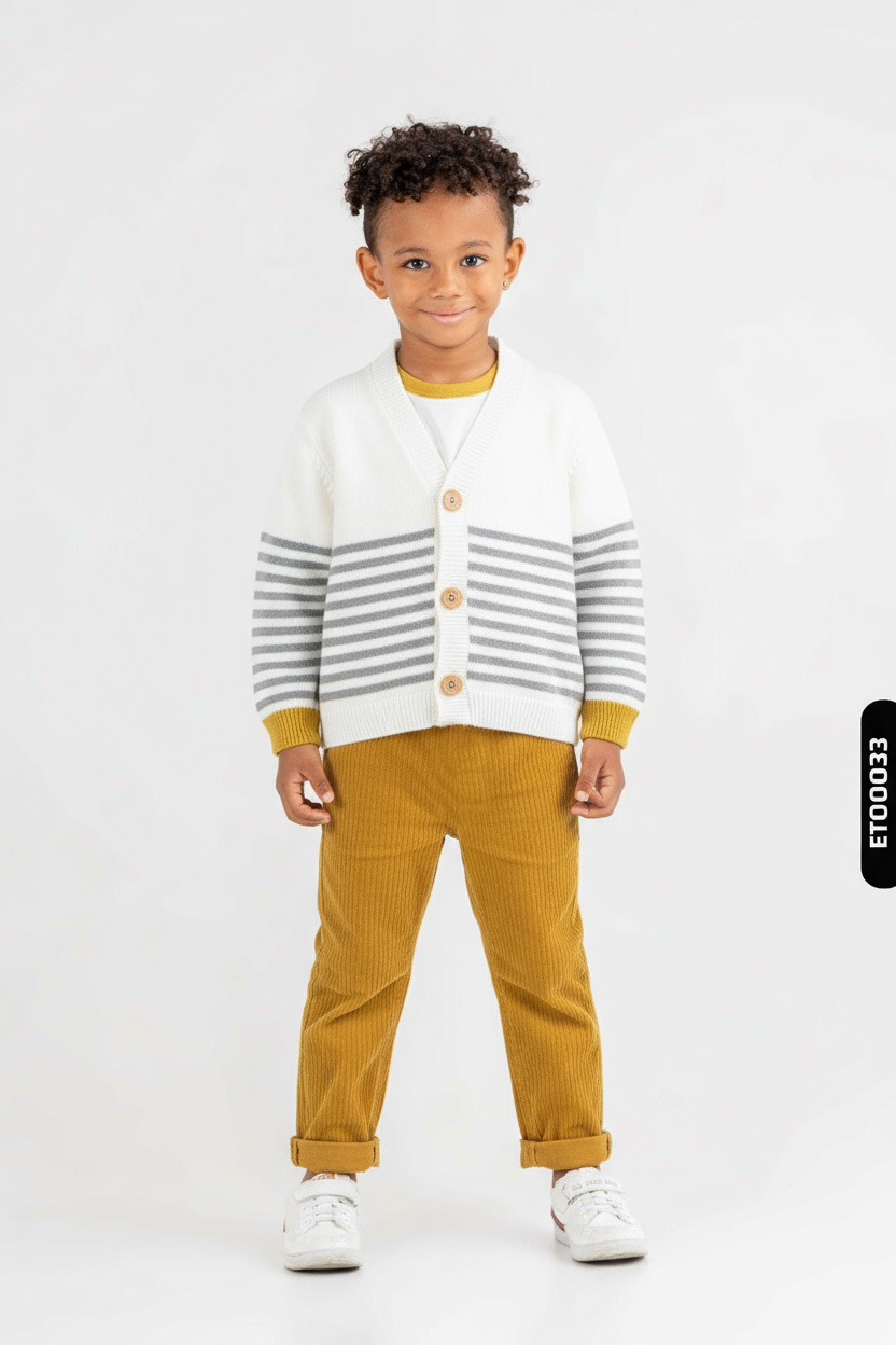 Bu Erkek Çocuk Alt Üst Takımı, kış sezonu için ideal sıcak ve şık bir seçenektir. Üst kısmında kapüşon bulunmayan, V yaka ve düğmeli bir hırka yer alır. Hırkanın üst bölümü beyaz, alt kısmı ise gri ince çizgilerle hareketlendirilmiş. Manşetler ise hardal renginde ribanalı yapıdadır. Alt takım ise hardal renkli, kadife dokulu ve paçaları kıvrık pantolondan oluşmaktadır. Rahat kesimi ve kaliteli malzemesi ile çocukların hareket özgürlüğünü kısıtlamadan gün boyu konfor sağlar.