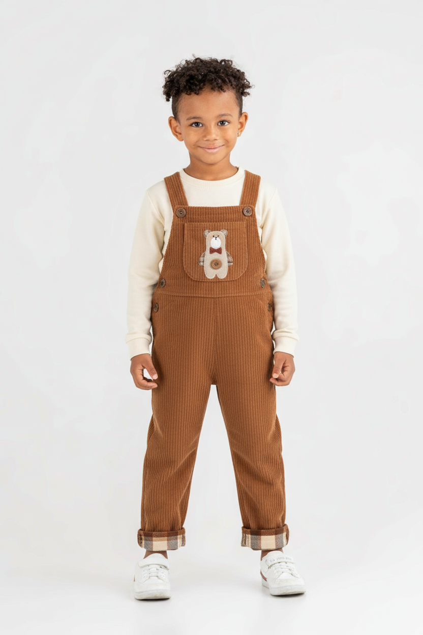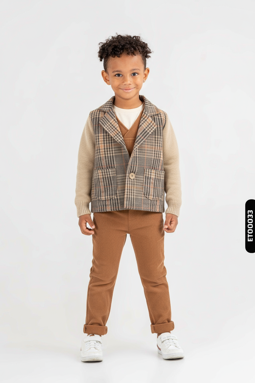 Bu erkek çocuk alt üst takımı, rahatlığı ve şıklığı bir arada sunuyor. Üst parça, kahverengi ve bej tonlarında, önü düğmeli ve cepli klasik bir tasarıma sahip. Kollarda ve arka bölümde düz bej renk hakimken, ön kısım kareli desenlerle hareketlendirilmiş. Pantolon ise kahverengi, fitilli kumaştan ve ayarlanabilir paçalarla dikkat çekiyor. Ön kısmında sevimli bir ayıcık figürü ile çocukların ilgisini çekecek detaylar bulunuyor. Takım, kış sezonu için uygun kalınlıkta ve uzun kollu olarak tasarlanmış, günlük kullanım için ideal bir seçimdir.
