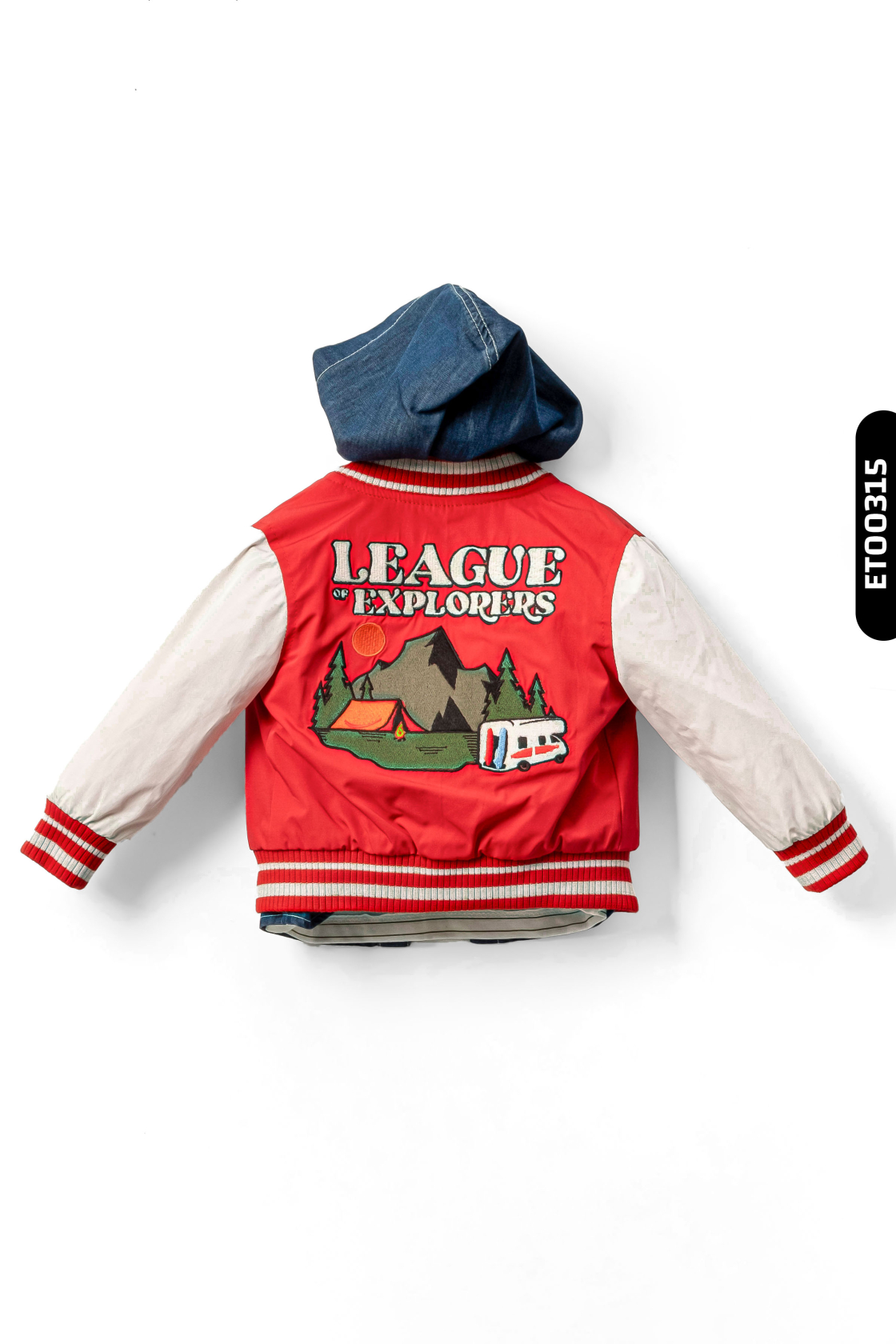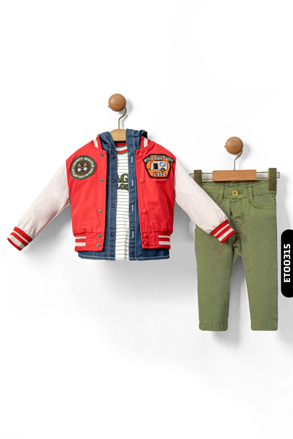 Bu erkek çocuk alt üst takımı, sportif ve rahat bir tarz sunar. Takım; içinde kapüşonlu, düğmeli kot görünümlü bir gömlek, üzerine giyilen kordonlu ve fermuarsız kırmızı ve krem renkli ceket ve haki renkli klasik kesim pantolondan oluşur. Ceket, ön ve arka yüzünde canlı nakış detayları ve patch’lerle süslenmiştir. Kolları krem rengi, gövdesi kırmızı olan ceket, ribana manşetleri ve beli ile ekstra konfor sağlar. Takım, çocukların günlük aktiviteleri için uygun uzun kollu ve rahat kesim parçalar içerir.