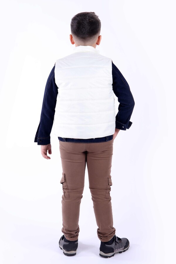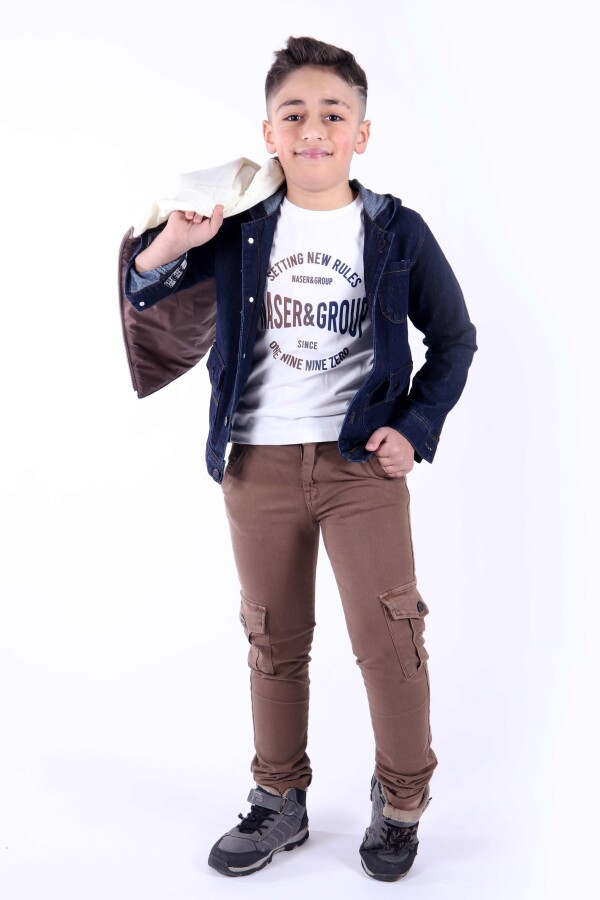 This stylish trouser set for kids offers both comfort and a chic look. The terracotta-colored vest stands out with its lightweight and warm qualities, perfectly complementing the blue long-sleeve shirt. Your children can move freely in this outfit!