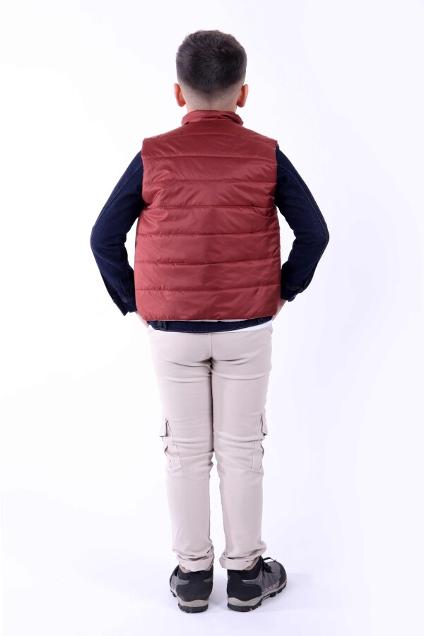 This stylish trouser set for kids offers both comfort and a chic look. The terracotta-colored vest stands out with its lightweight and warm qualities, perfectly complementing the blue long-sleeve shirt. Your children can move freely in this outfit!