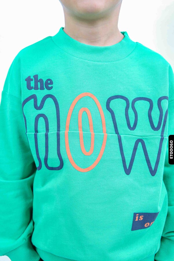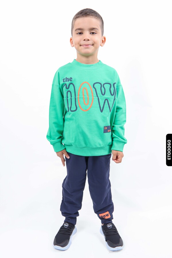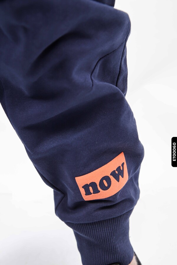 Gelince Haber VerBu Erkek Çocuk Eşofman Takımı, kış ayları için ideal, rahat ve şık bir seçenektir. Üst parça kapüşonsuz olup, bisiklet yaka olarak tasarlanmıştır. Fermuar veya düğme bulunmamakla birlikte, uzun kollu ve kol ile bel kısmında ribana manşetlere sahiptir. Üstte büyük, renkli "the NOW is on" yazısı dikkat çekmektedir. Alt eşofman lacivert renkte, bilek kısmı ribanalı ve paçalarda turuncu "now" baskısı vardır. Takım, cepsiz ve kordon detayına sahip değildir. Spor ve günlük kullanıma uygun, modern ve rahat bir stildir.