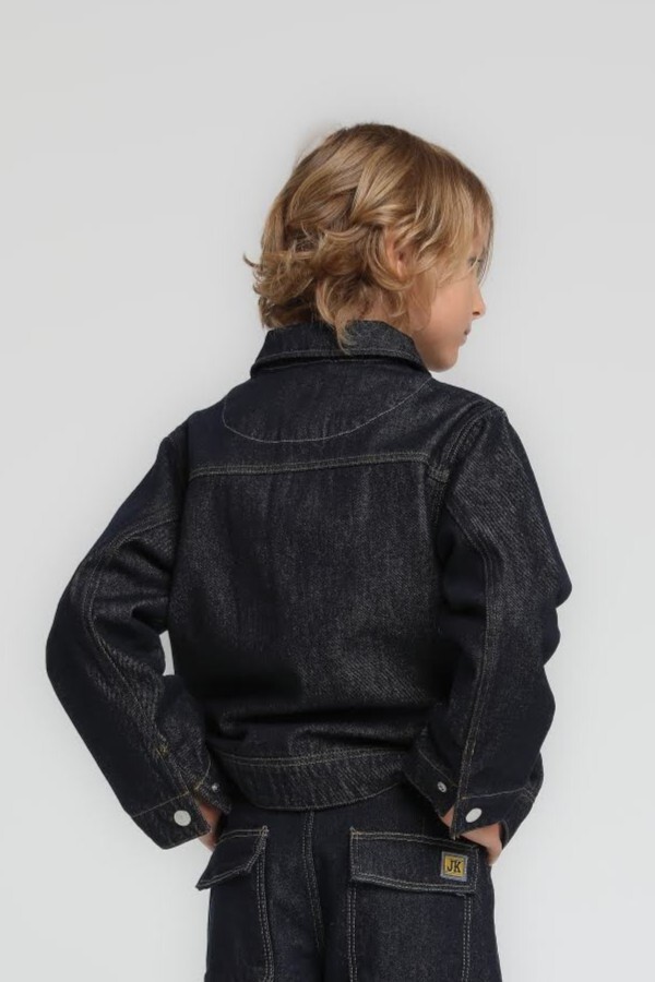 هذه السترة للأطفال من الذكور تتميز بتصميم بسيط وأنيق مناسب للاستخدام اليومي. تحتوي على ياقة كلاسيكية وسحاب للإغلاق لتسهيل الارتداء. مصنوعة من قماش الدنيم الأزرق الداكن، وهي ذات أكمام طويلة وقصة مستقيمة. تحتوي على جيوب كبيرة في الأمام وجيب على مستوى الصدر لإضافة التفاصيل. أكمامها مزودة بأزرار تسمح بضبط عرض الكم. هذه السترة مناسبة لفصل الشتاء بفضل متانتها ودفئها.