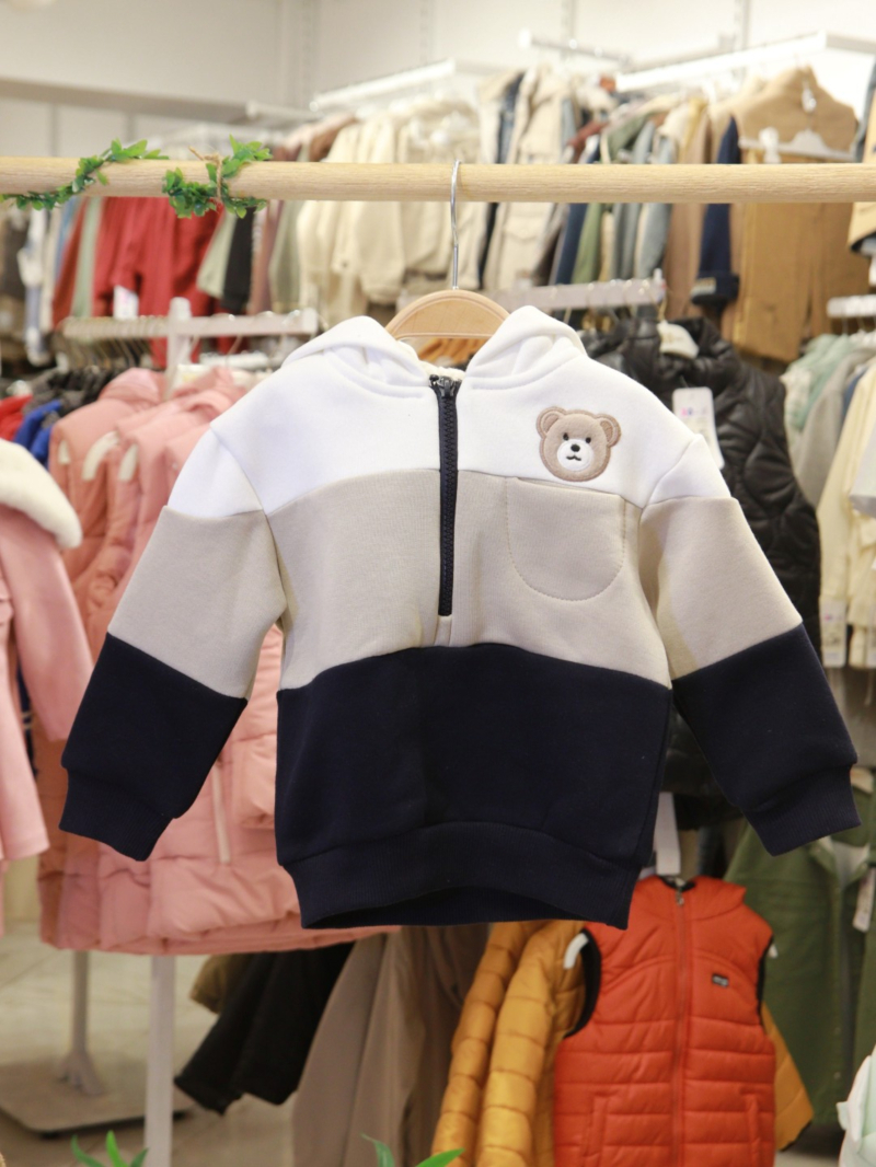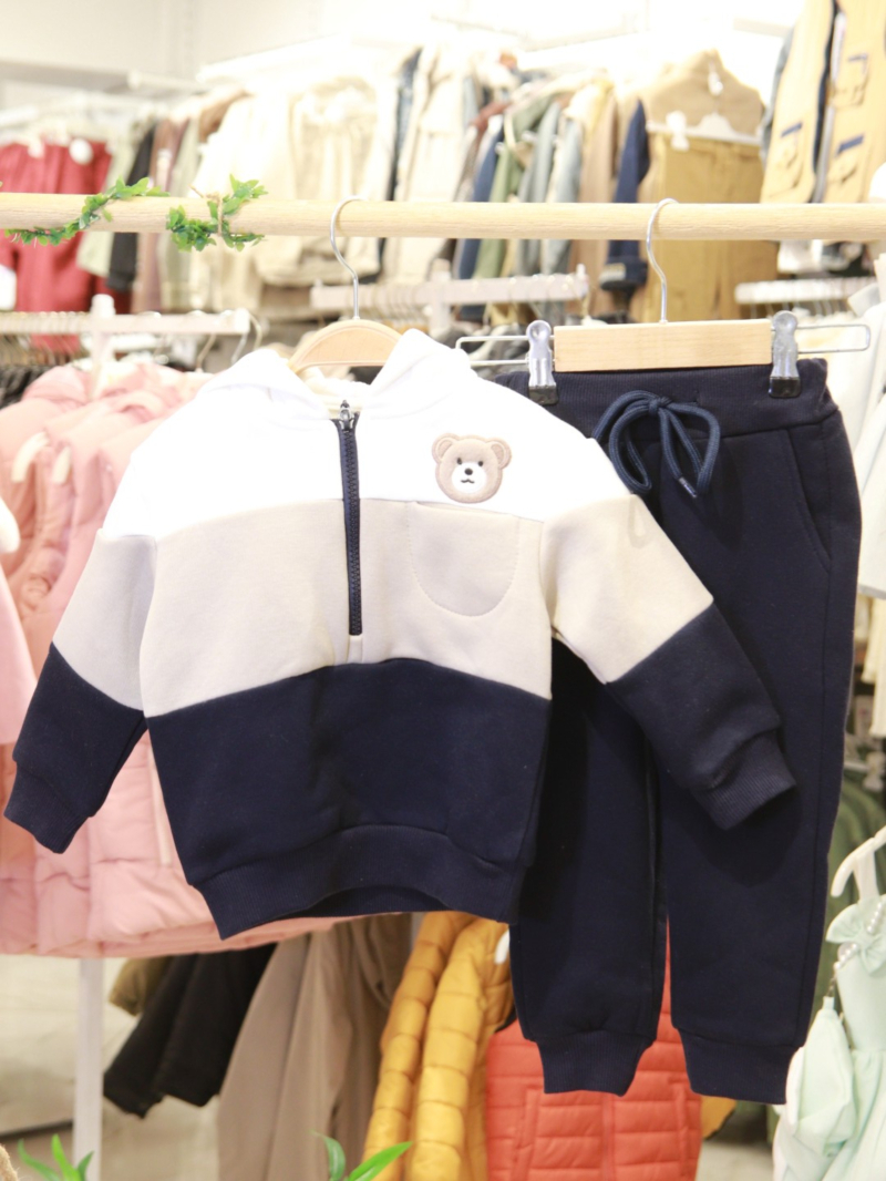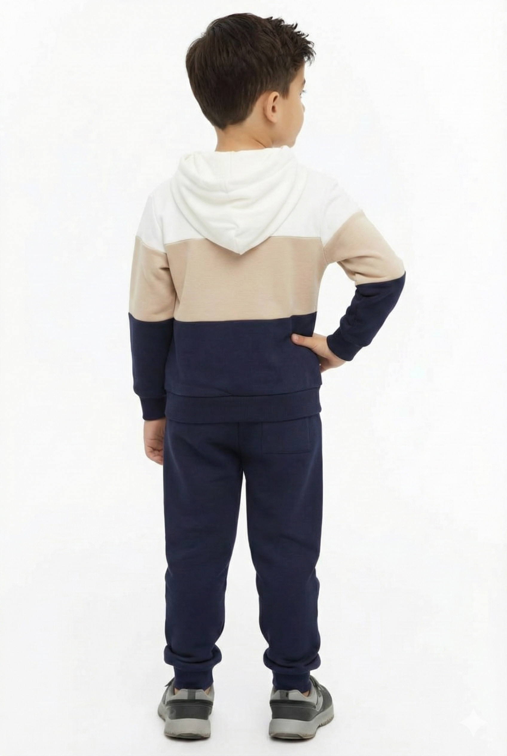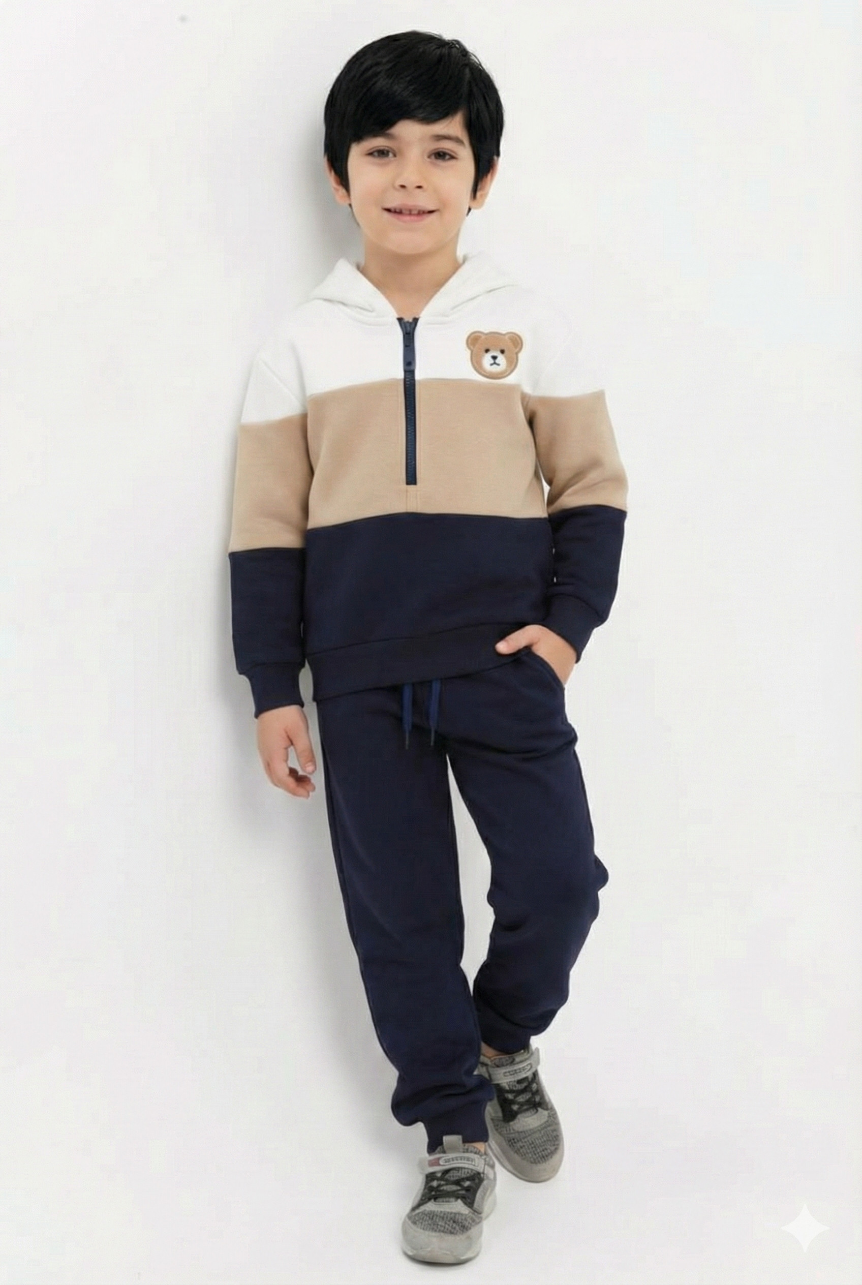 Bu erkek çocuk eşofman takımı, kış sezonu için ideal bir seçimdir. Kapüşonlu üst kısmında yarım fermuar yer alır, böylece giyip çıkarması kolaydır. Renk bloklu tasarımı lacivert, bej ve beyaz renklerin uyumuyla şık ve modern bir görünüm sunar. Üstte sevimli bir ayıcık figürü bulunur, çocukların ilgisini çeker. Alt kısmı ise cep detayına ve bağcıklı, lastikli paçalara sahiptir. Uzun kollu ve kapüşonlu yapısıyla sıcak tutar, spor ve rahat bir stil sağlar.