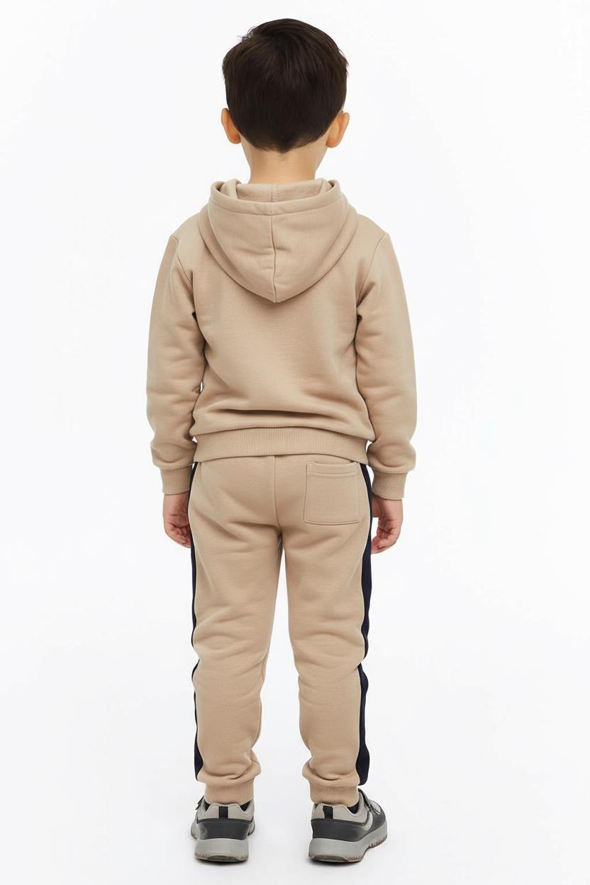 Bu erkek çocuk eşofman takımı, rahatlığı ve şıklığı bir arada sunar. Kapüşonlu üst kısmı ve fermuarlı yapısı sayesinde kullanımı oldukça pratiktir. Takımın bej rengi üzerine koyu yeşil fermuar detayı ve koyu lacivert yan şeritler sportif bir görünüm sağlar. Alt kısmında lastikli paça ve yan cep detayı bulunur. Uzun kollu ve kapüşonlu olan bu eşofman takımı, soğuk kış günleri için ideal olup çocukların hareket özgürlüğünü kısıtlamadan sıcak tutar.