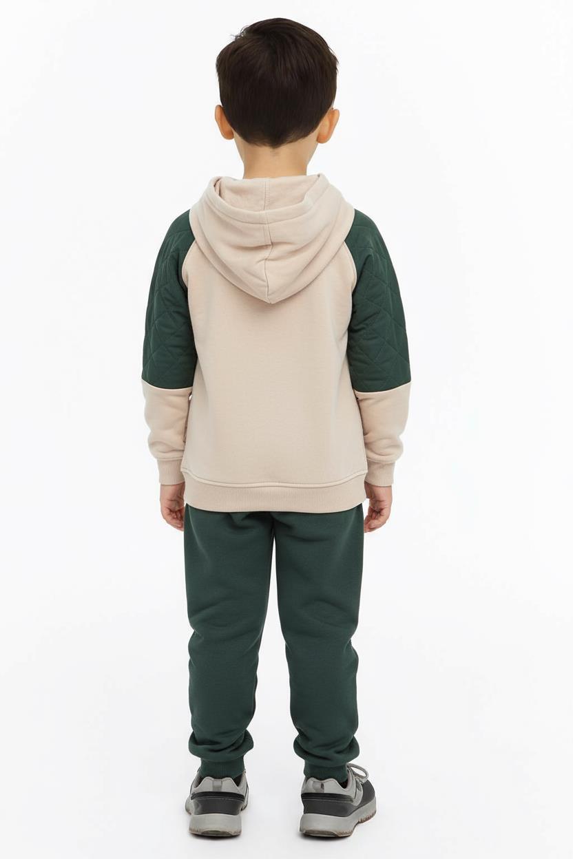 Bu erkek çocuk eşofman takımı, kış mevsimi için ideal sıcaklık sağlayan rahat ve şık bir seçenektir. Kapüşonlu üstü, bej renginde olup, koyu yeşil tonlarında kolları kaplamaktadır ve kollarında kareli kapitone dikiş detayı bulunmaktadır. Ön tarafında büyük kanguru cebine sahiptir. Alt kısmı koyu yeşil renkli, kordonlu ve cepli pantolondan oluşur. Takımın manşetleri ve paçaları lastik olup, hareket kolaylığı sağlar. Spor ve günlük kullanıma uygun modern bir tarza sahiptir.