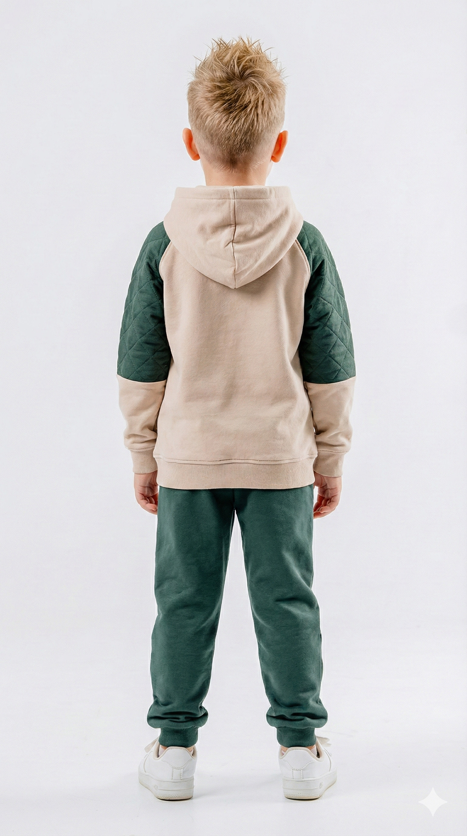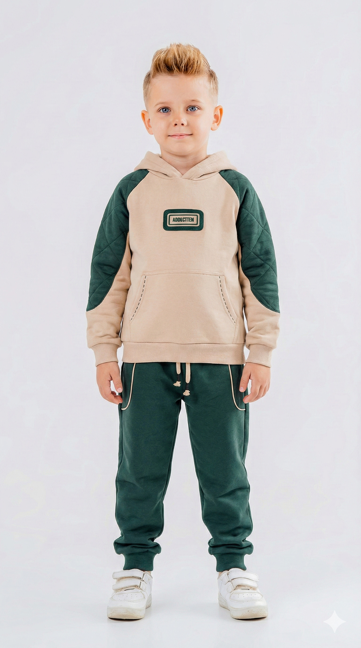 يعتبر هذا الطقم الرياضي للأطفال من الأولاد خيارًا مريحًا وأنيقًا، مثاليًا لموسم الشتاء. الجزء العلوي بقبعة (هودي) لونه بيج مع أكمام خضراء داكنة مطرزة بنمط ماسي. يحتوي على جيب كانغورو كبير في الأمام. البنطال بلون أخضر داكن مع رباط للخصر وجيوب جانبية، مزود بأساور مطاطية عند الأكمام والكاحلين لتوفير سهولة الحركة. الطقم يتميز بأسلوب رياضي وكاجوال مناسب للاستخدام اليومي.