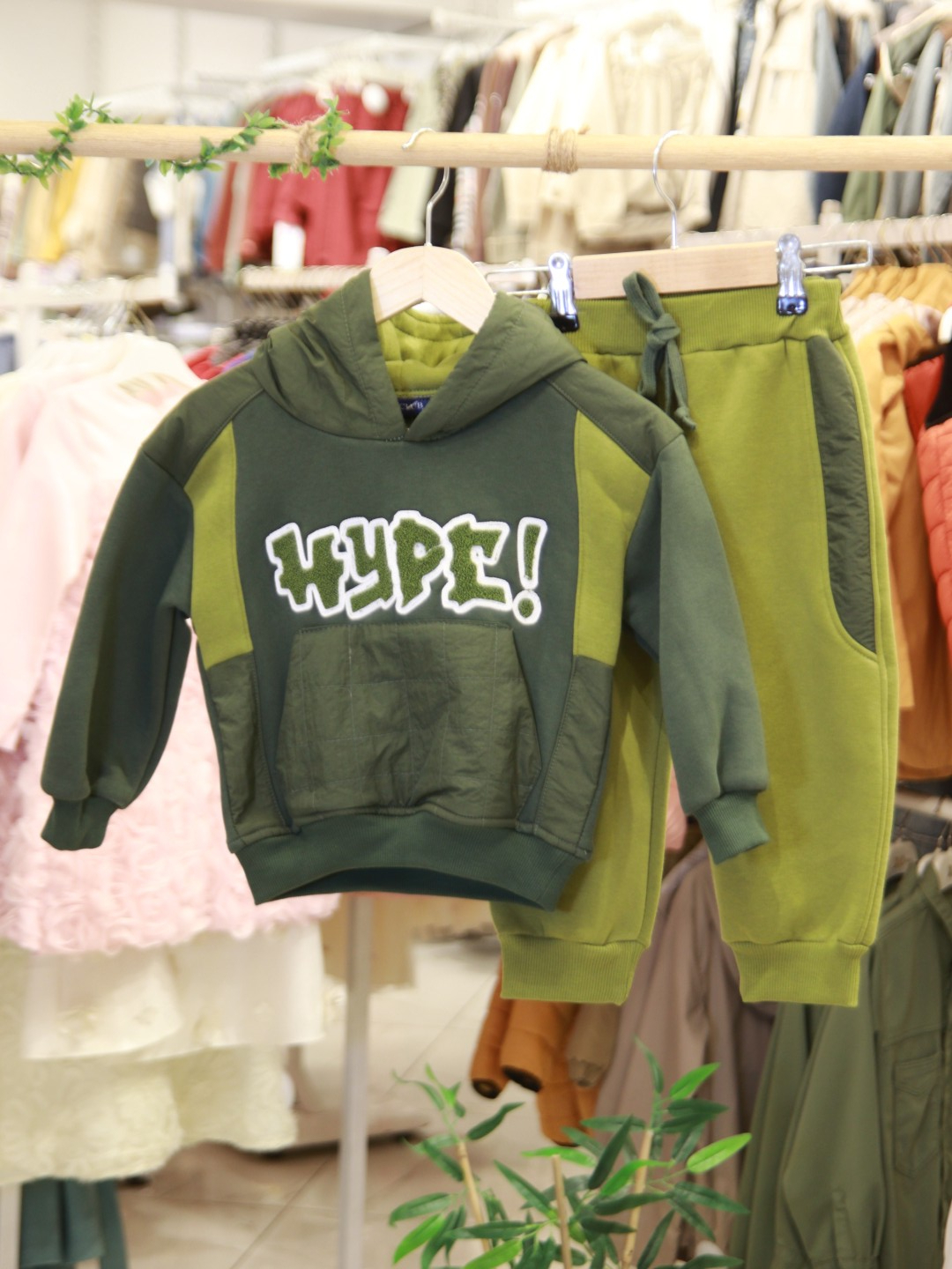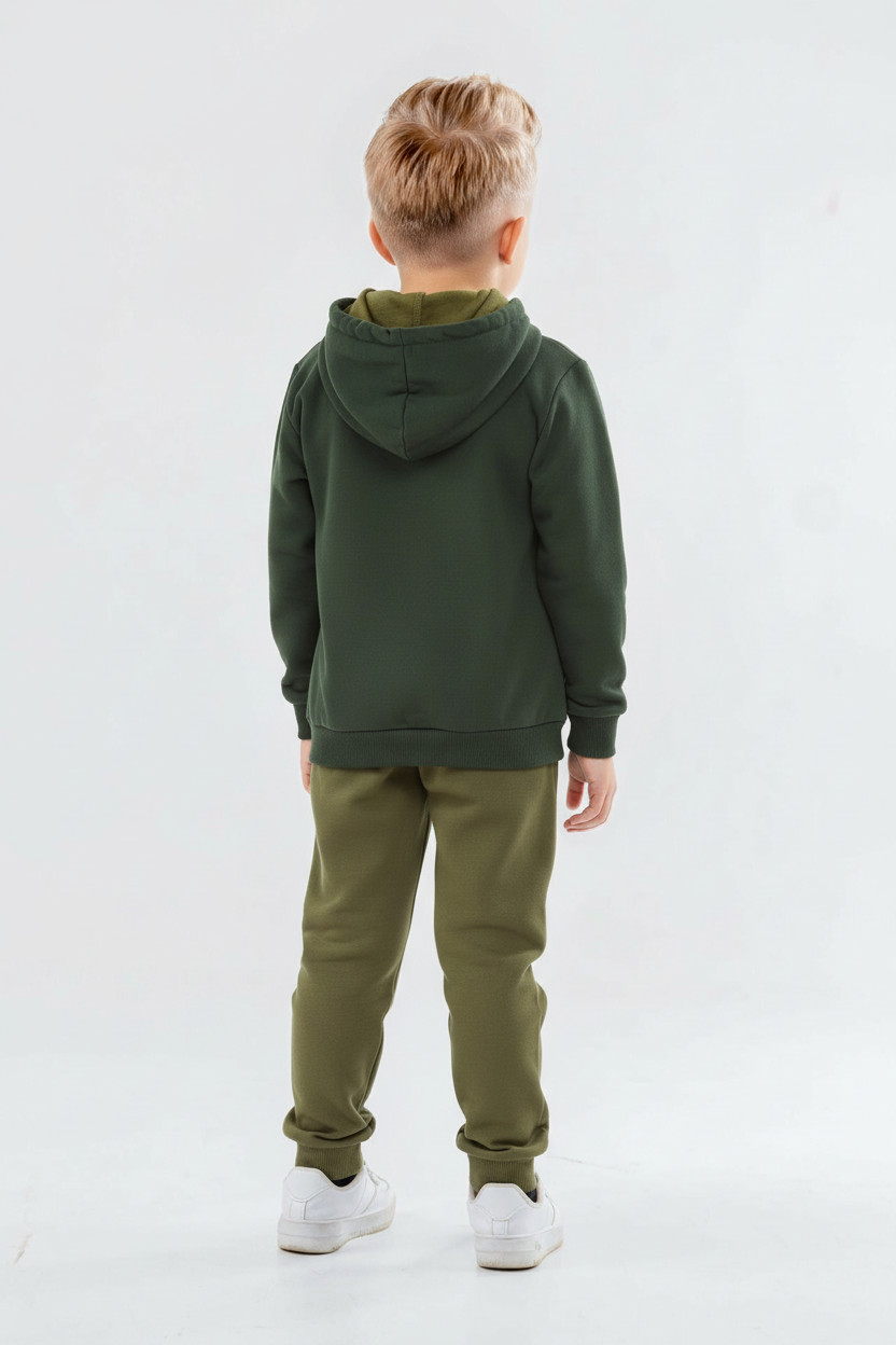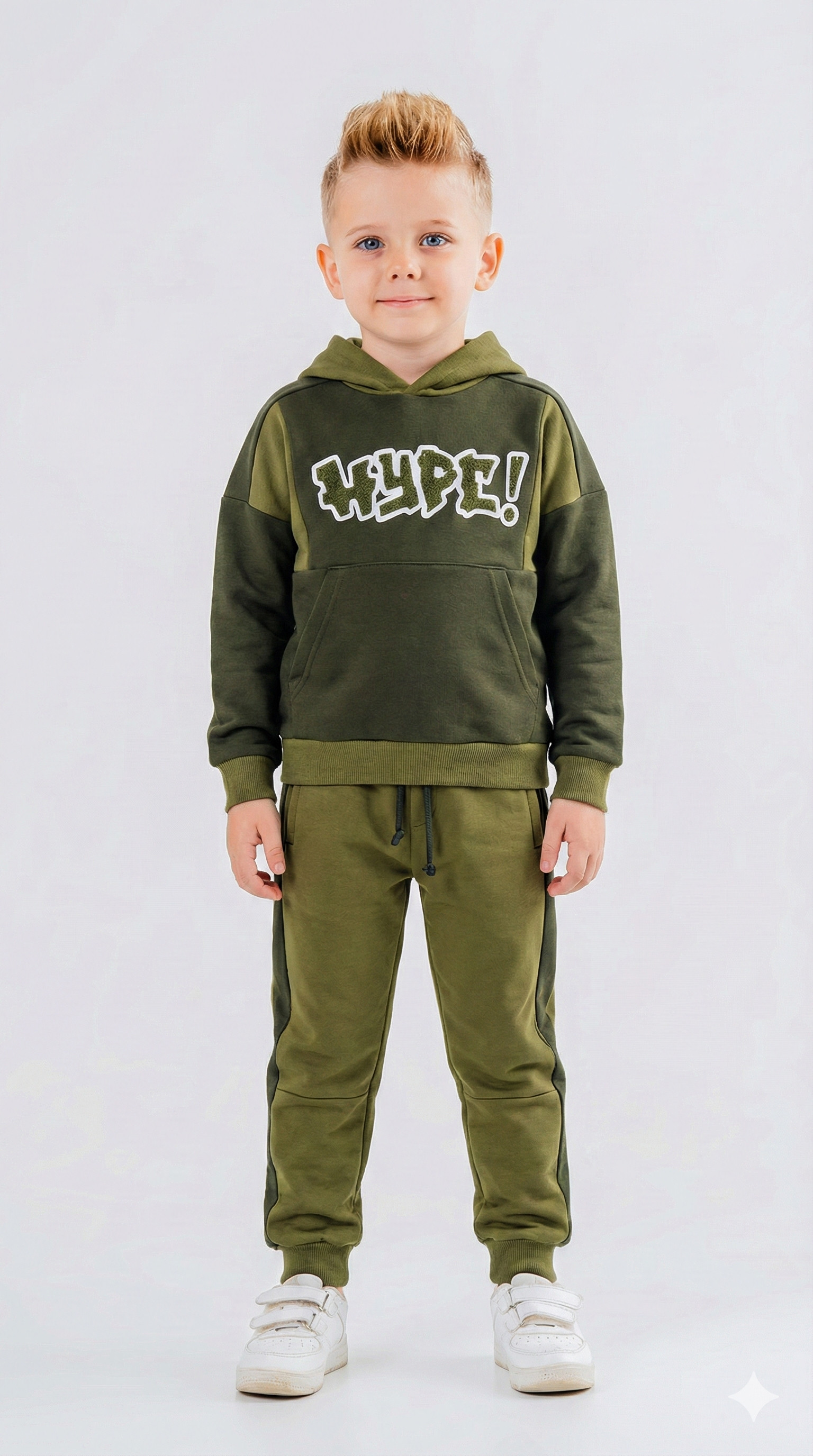 طقم رياضي للأولاد مثالي لفصل الشتاء، يوفر الدفء والراحة. الجزء العلوي مزود بغطاء للرأس (هودي) بدون سحاب، مع جيب أمامي لسهولة الاستخدام. الأكمام طويلة وياقة دائرية. البنطال مزود بحزام خصر مطاطي مع رباط لضبط المقاس، مما يتيح حرية الحركة. يأتي بلون زيتي بدرجات مختلفة، ليمنح مظهرًا عصريًا ورياضيًا. الطباعة الكبيرة "HYPE!" على الصدر تضيف لمسة مرحة ونشطة.