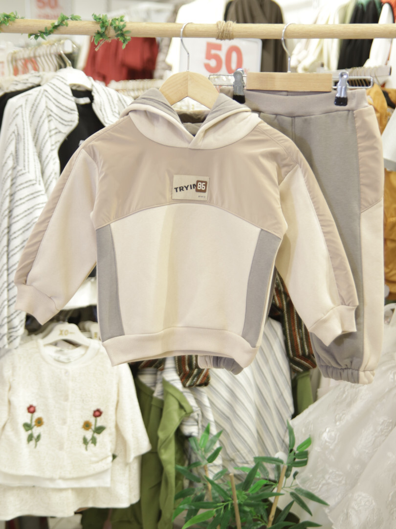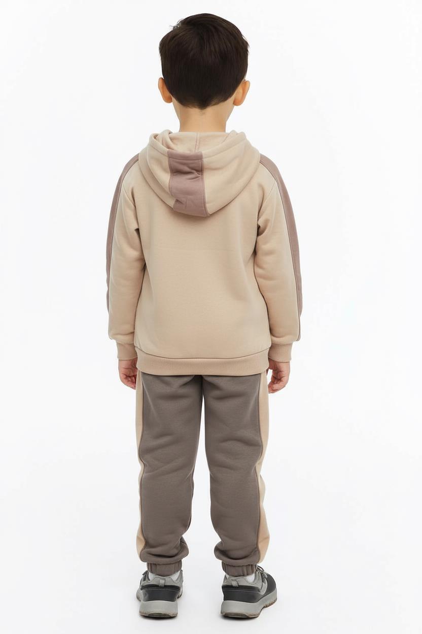 Bu erkek çocuk eşofman takımı, rahatlığı ve şıklığı bir arada sunar. Kapüşonlu üst kısmı soğuk kış günlerinde ekstra koruma sağlar. Fermuarsız ve kordonu olmayan bu tasarım, sade ve kullanışlıdır. Uzun kollu ve bisiklet yakalı üst, bej ve kahverengi tonlarında renk bloklarıyla modern bir görünüm yaratır. Alt kısmı ise yanları bej detaylı, paçaları lastikli, rahat kesim jogger pantolondan oluşur. Günlük kullanım ve spor aktiviteleri için ideal bir takımdır.