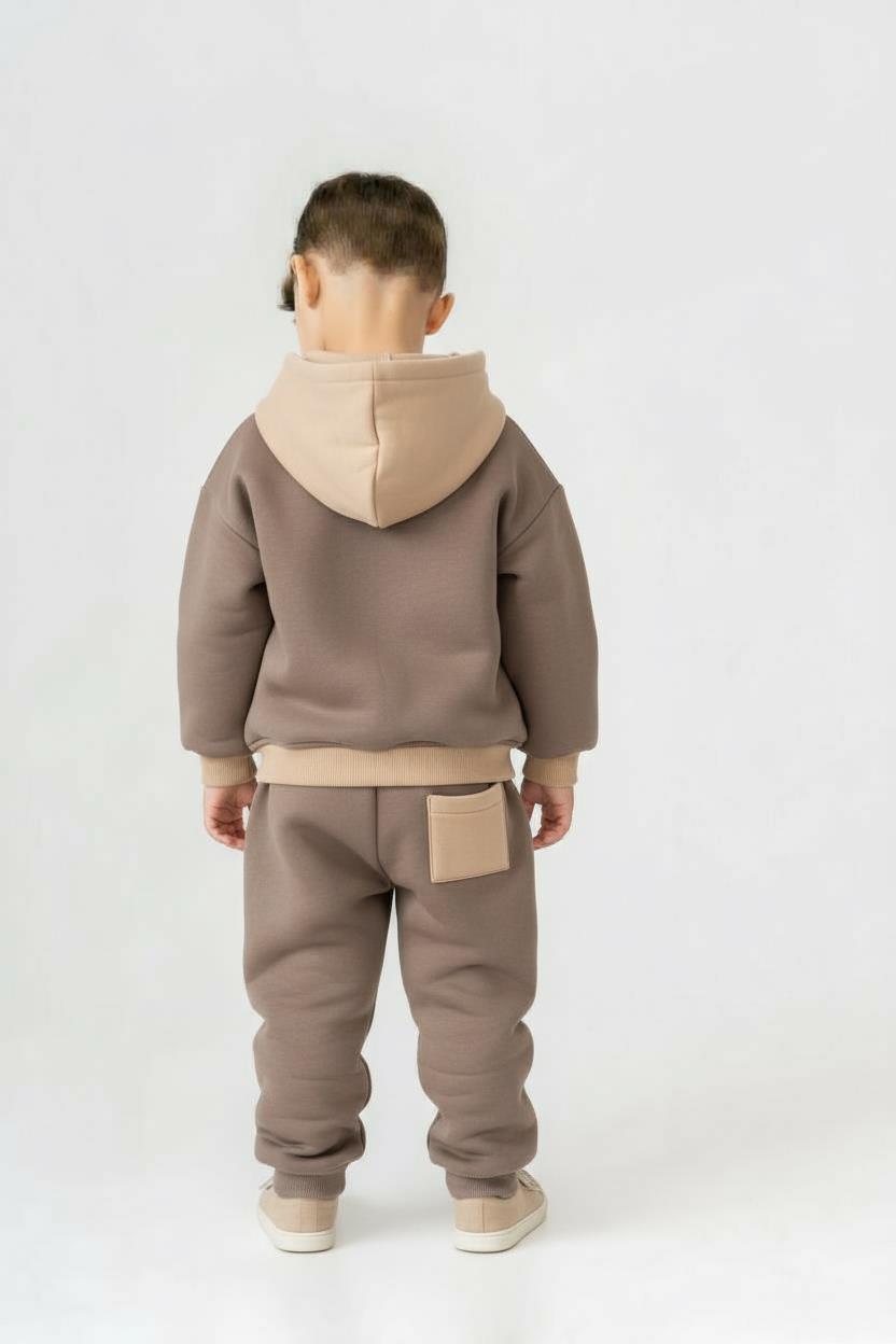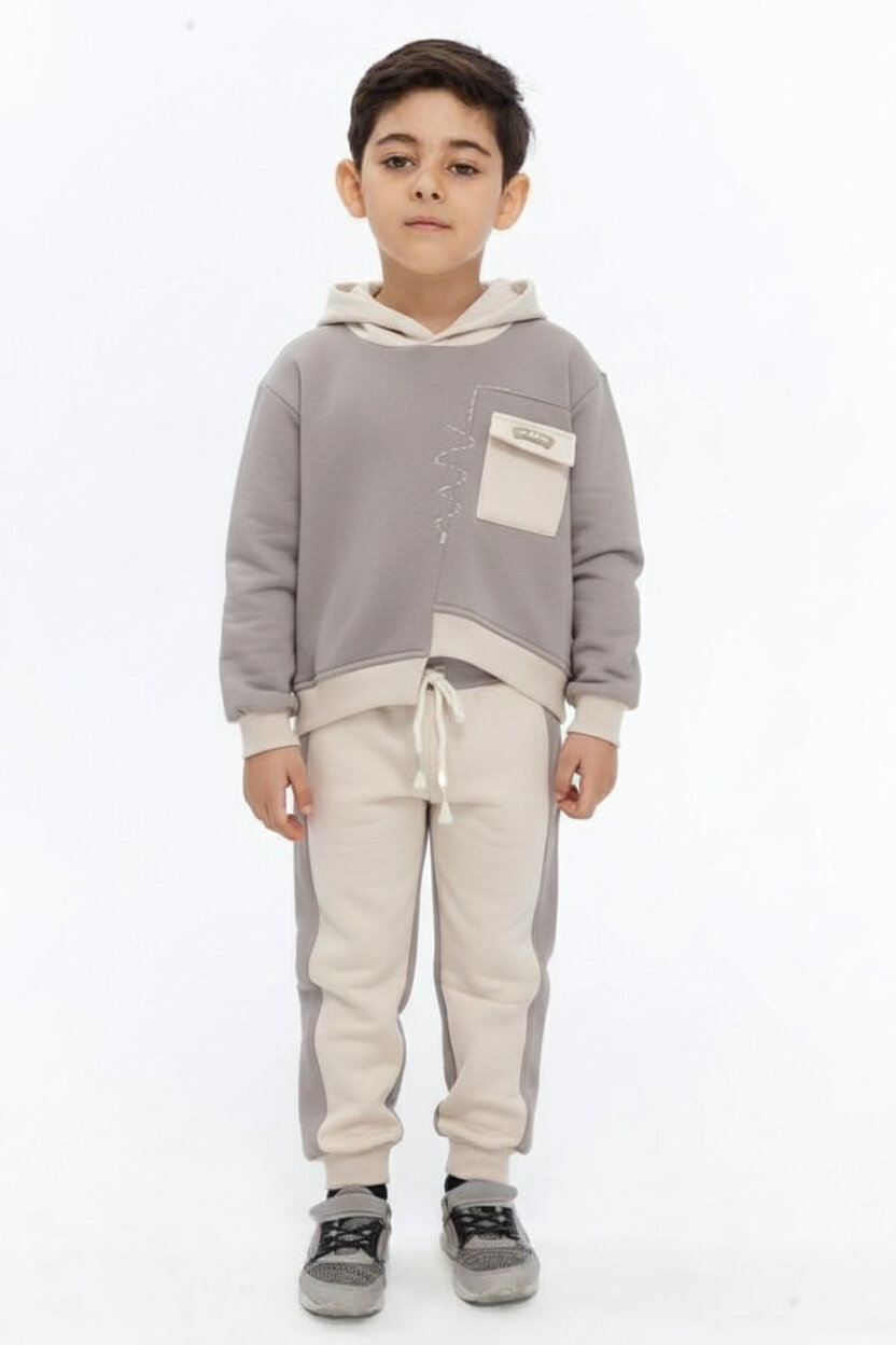 Bu erkek çocuk eşofman takımı, rahatlık ve şıklığı bir arada sunar. Kapüşonlu üstü fermuarsızdır ve önünde cepli, farklı renklerde dikkat çeken bir tasarıma sahiptir. Alt kısmı bağcıklı ve yanları kontrast renk detaylıdır. Takımın hem üstü hem de altı uzun kollu ve uzun paçalıdır, soğuk kış günleri için idealdir. Modern ve sportif bir tarz yakalamak isteyen çocuklar için uygundur.