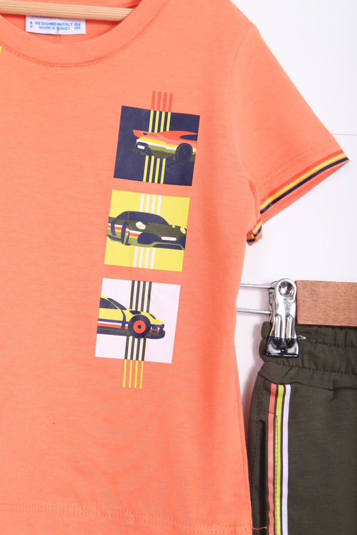Erkek çocuklar için tasarlanmış bu eşofman takımı, hem rahat hem de şık bir seçenek sunuyor. Üst kısmı turuncu renkte, kısa kollu ve bisiklet yaka tasarımıyla, "life is good" yazısıyla dikkat çekiyor. Pantolon ise haki yeşil renginde, yan tarafında çok renkli şeritler bulunan, esnek bel lastiği ile konfor sağlıyor.
