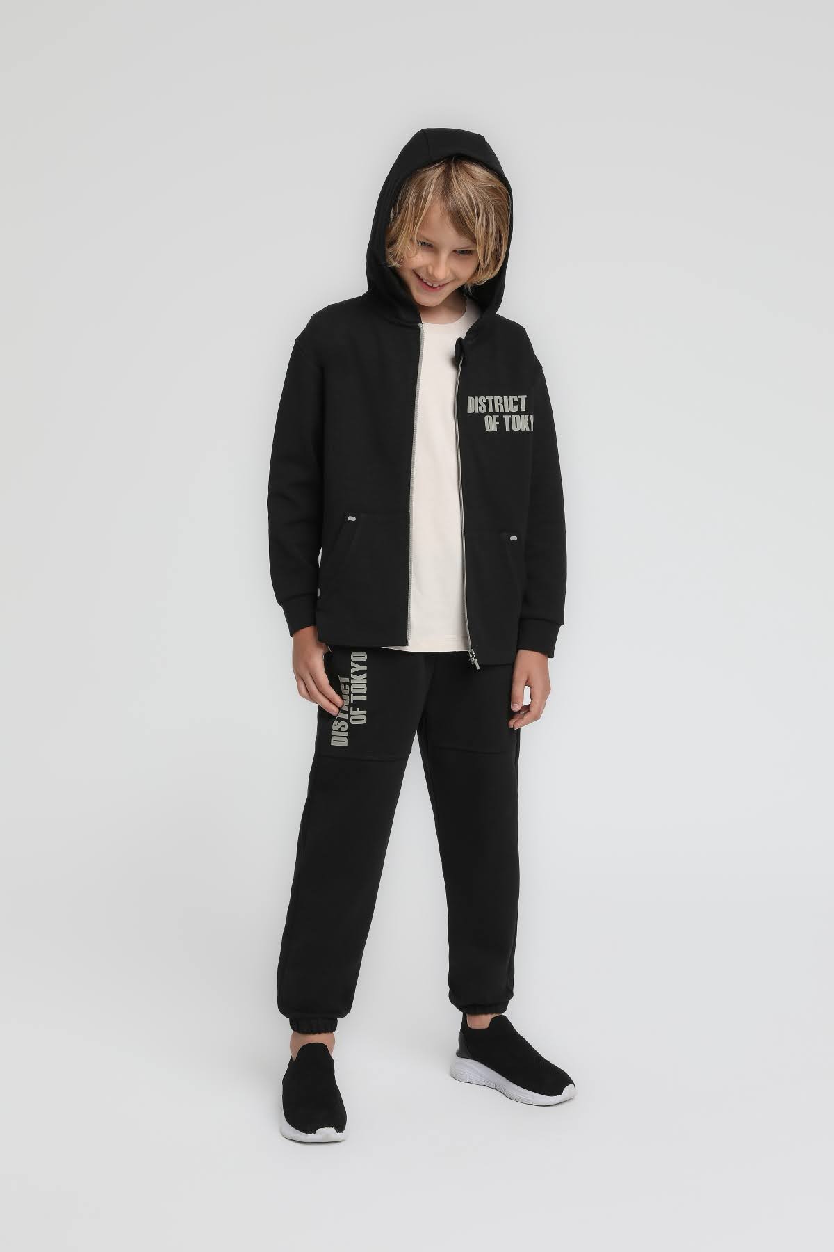 Çocuklar için modern ve şık bir eşofman takımı arıyorsanız, bu kapüşonlu ve fermuarlı tasarım tam size göre! Siyah rengiyle hem şık hem de spor bir görünüm sunar. Takımın alt kısmında cepler ve lastikli paçalar bulunmaktadır, bu da rahat hareket imkanı sağlar. Üst kısımda yer alan büyük baskılar, eşofmanın sporcu ruhunu yansıtır. Soğuk kış günlerinde sıcak kalmak için ideal bir seçenektir.