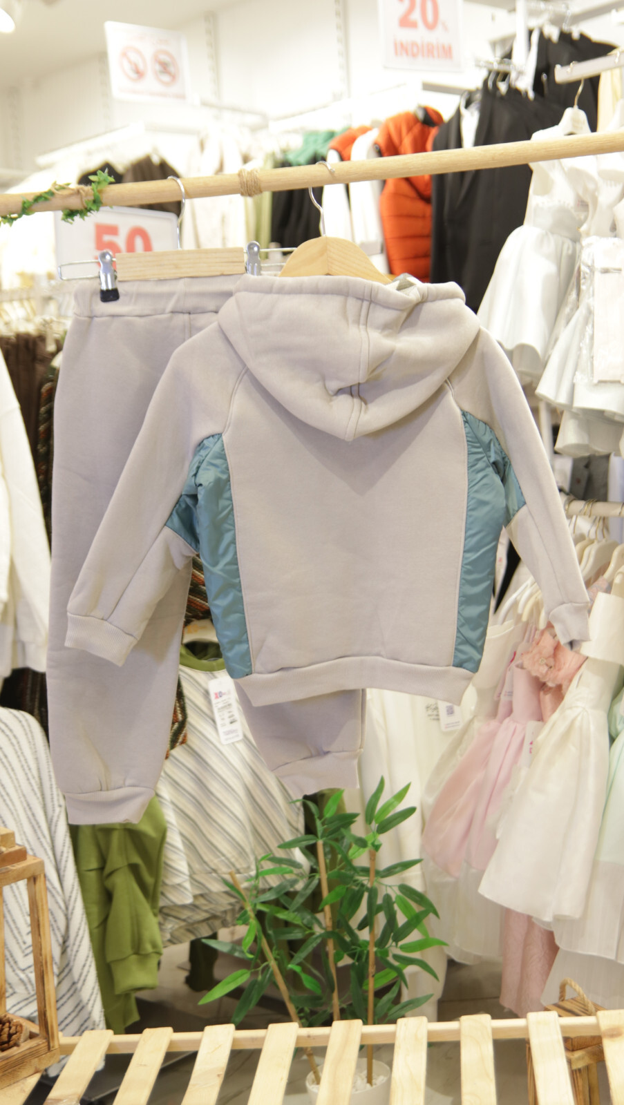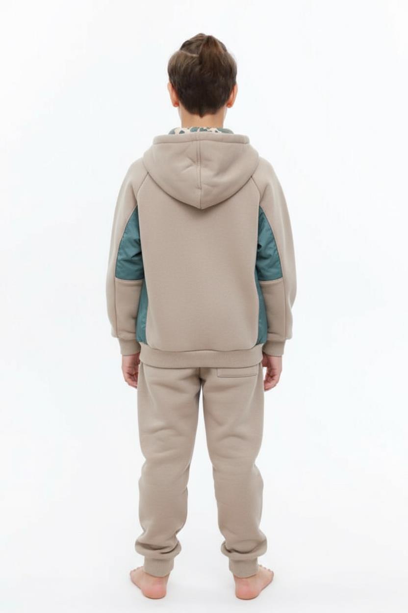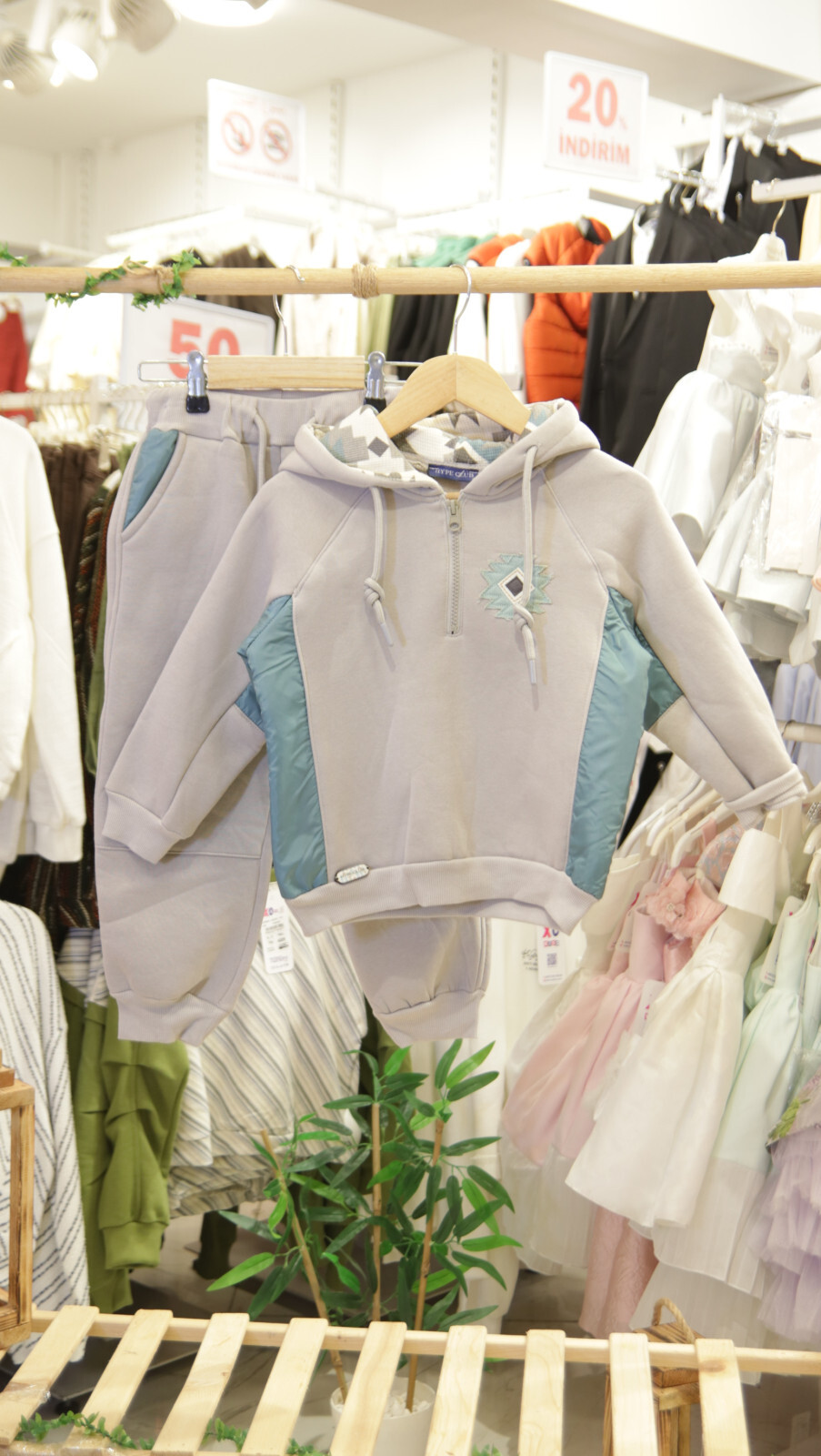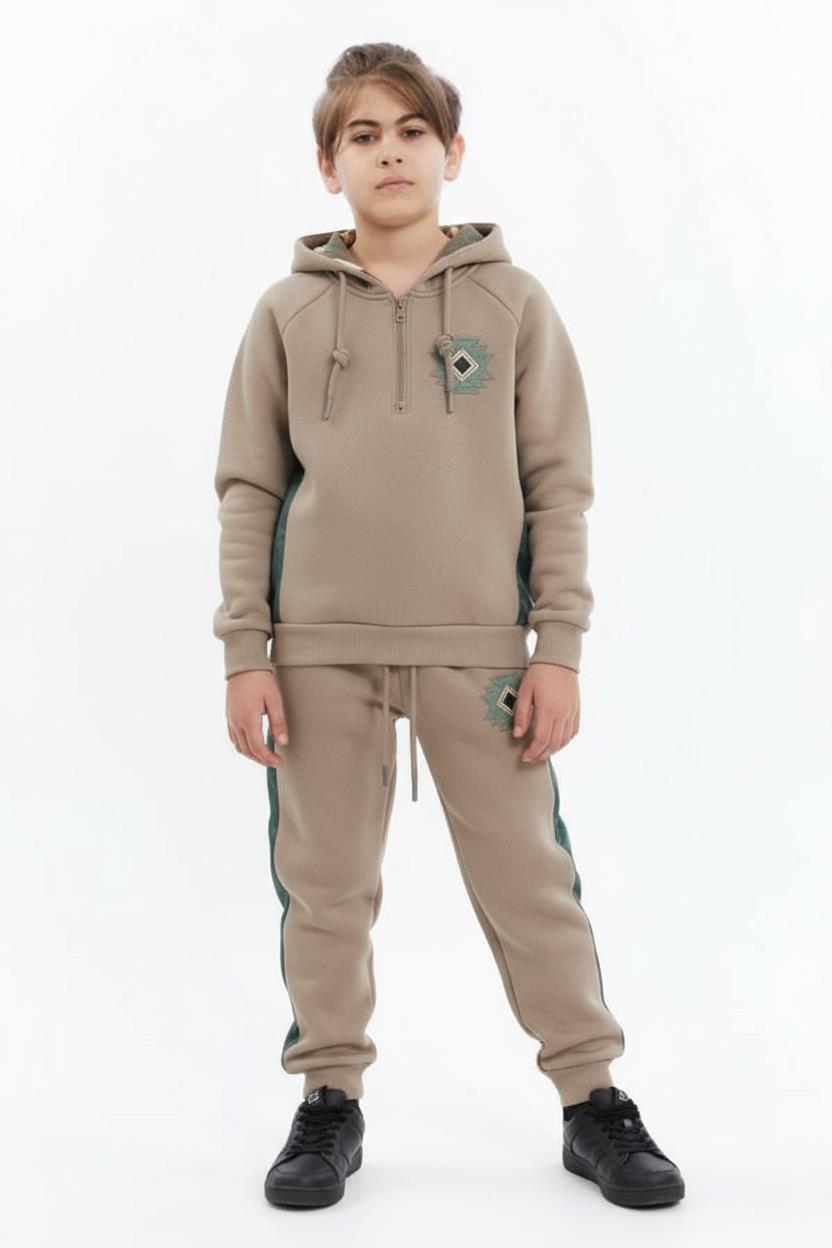 Bu erkek çocuk eşofman takımı, rahatlığı ve şıklığı bir arada sunar. Kapüşonlu üst kısmı, yarım fermuar detayı ve kordonlu yapısı ile kullanışlıdır. Yan ve kol altı bölümlerinde farklı dokuda kumaş panelleri bulunur, bu da tasarıma sportif bir hava katar. Alt kısmı, paçalarda lastikli ve kordonlu olup, rahat hareket etmeyi sağlar. Üst ve alt parçaların önünde geometrik desen işlemeleri yer alır, takıma özgünlük katar. Kış sezonu için ideal kalınlıkta ve uzun kolludur.