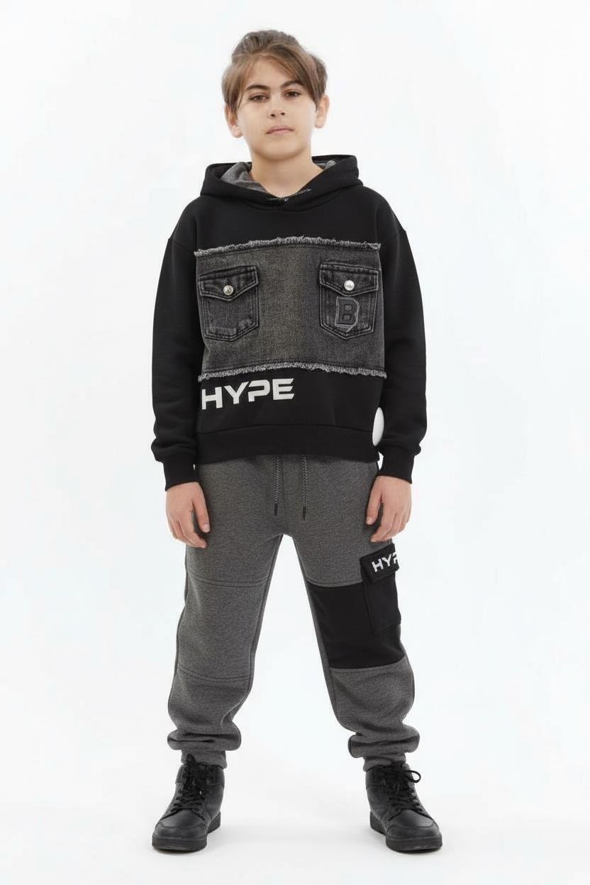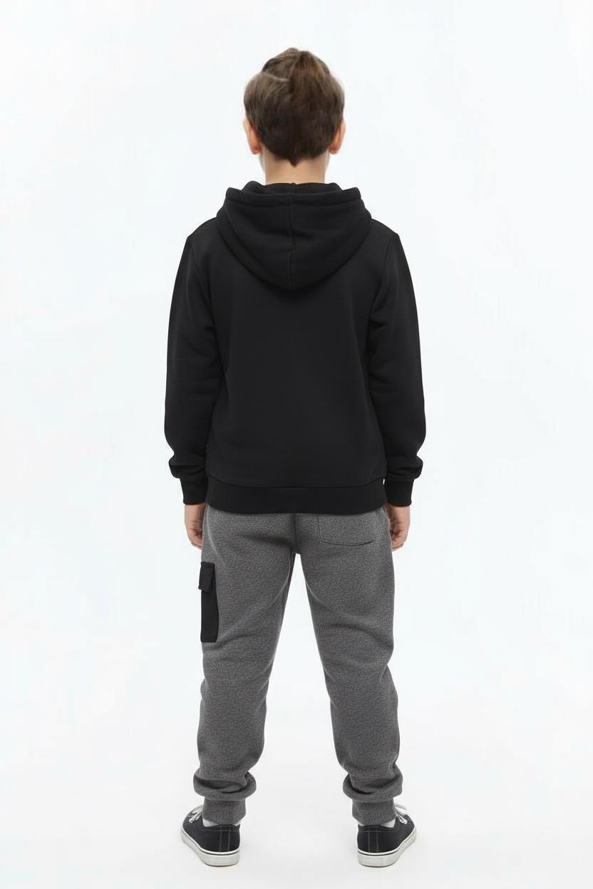 Bu erkek çocuk eşofman takımı, kış aylarında konfor ve şıklığı bir arada sunar. Kapüşonlu üst parça, ön yüzünde kot görünümlü detaylar ve düğmeli ceplerle dikkat çeker. Siyah ve gri tonlarının uyumu, modern ve sportif bir tarz yaratır. Alt kısım ise rahat kesimli, bağcıklı ve cep detaylıdır. Takım, günlük kullanım için ideal olup çocukların hareket özgürlüğünü kısıtlamaz.