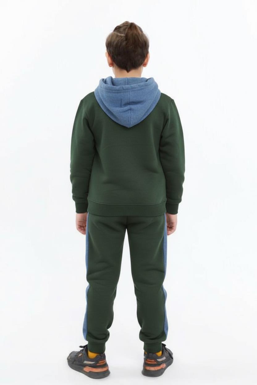 هذه الطقم الرياضي للأولاد مصمم لموسم الشتاء، يجمع بين الراحة والأناقة. الجزء العلوي مزود بغطاء رأس بلون أزرق مع أربطة قابلة للتعديل وجيب كبير أمامي بتصميم يشبه الجينز. البنطال يحتوي على شرائط جانبية بنفس تصميم الجينز مع أساور مطاطية عند الكاحلين لضمان ملاءمة مريحة. الطقم بأكمام طويلة، بدون سحّاب، مثالي للاستخدام اليومي والأنشطة الرياضية.