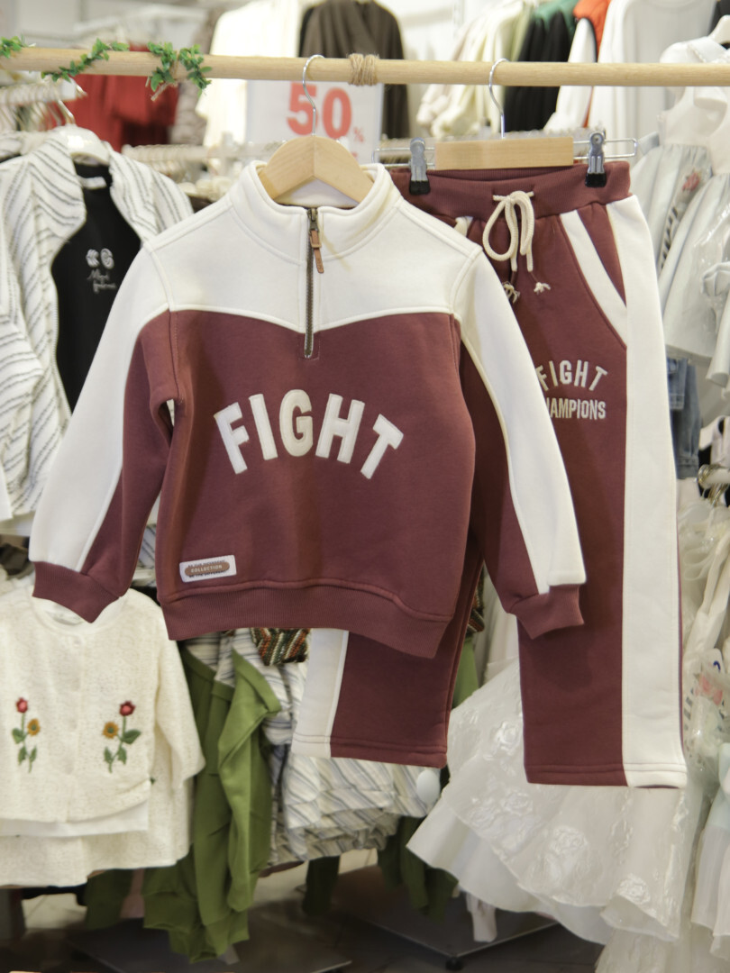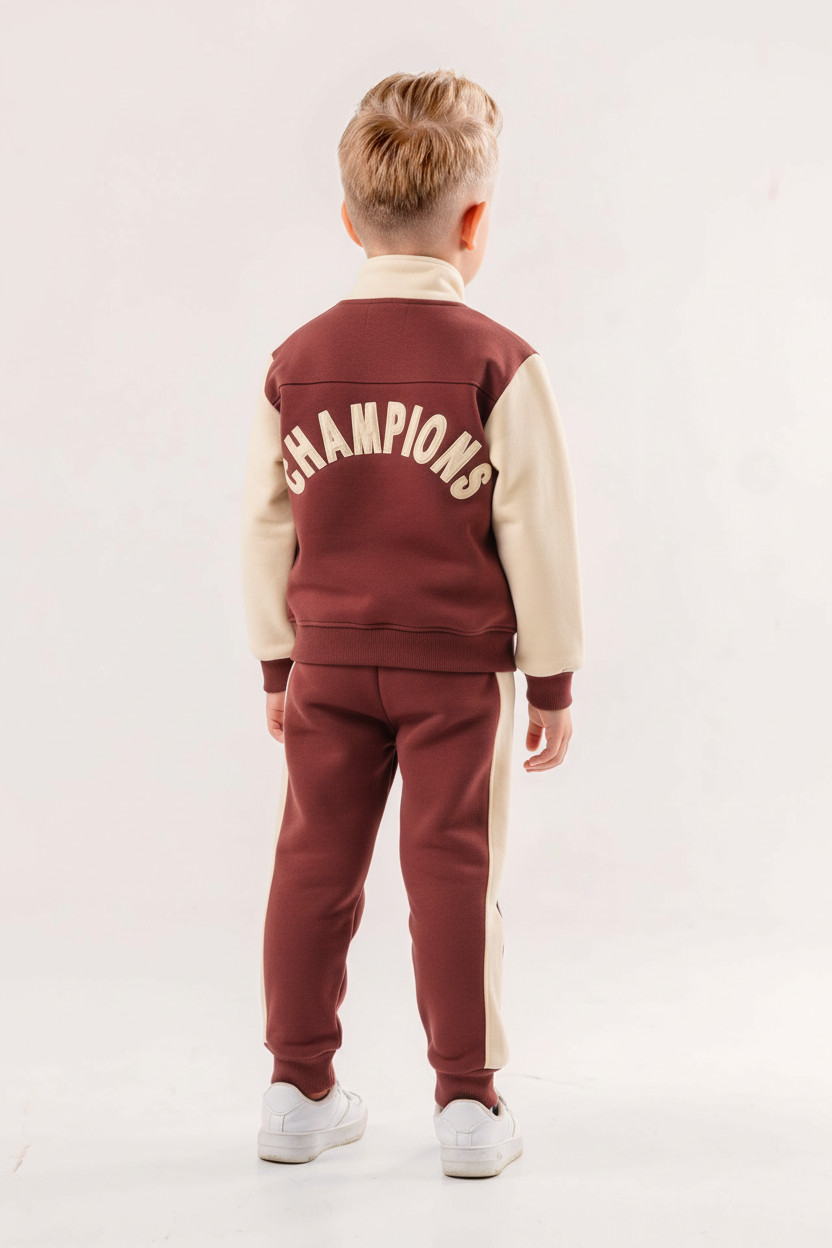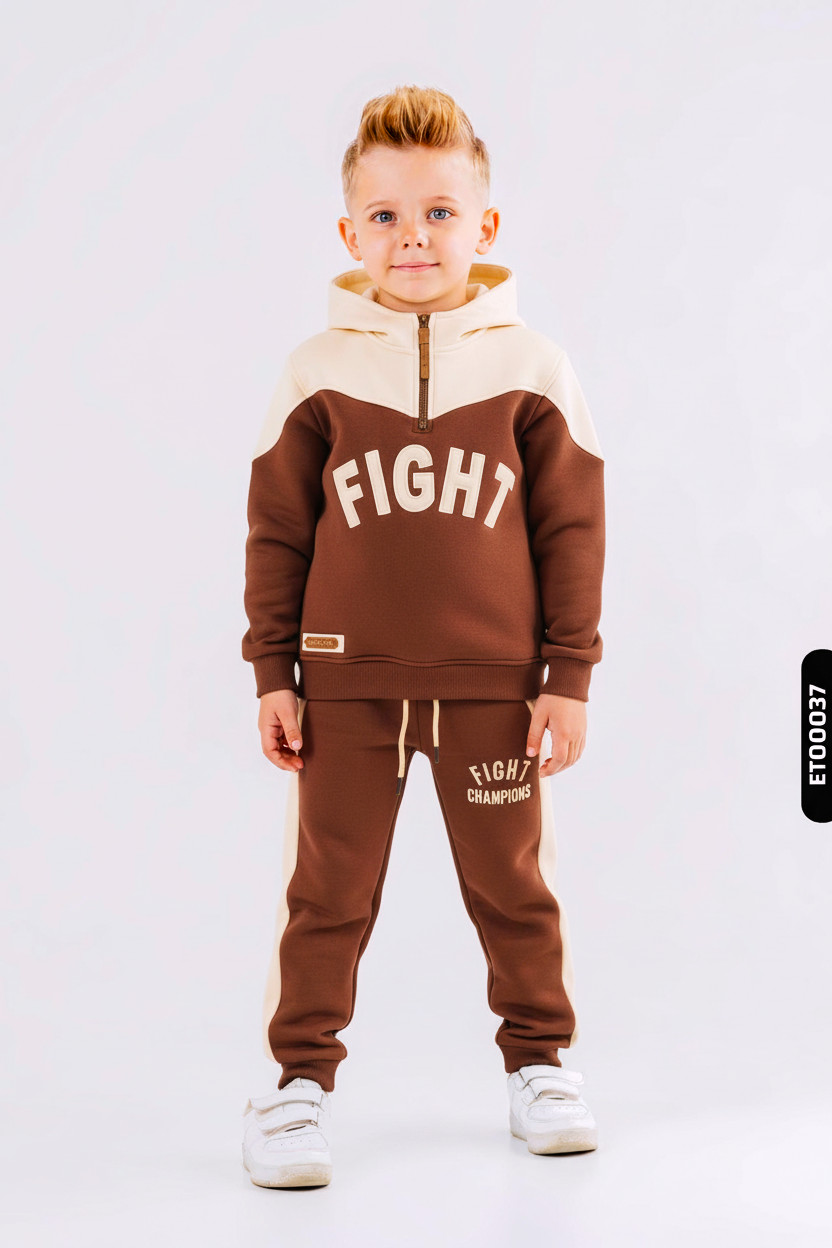 Bu erkek çocuk eşofman takımı, modern ve sportif tasarımıyla kış mevsimi için idealdir. Kapüşonlu üst kısmı, kısa fermuarlı detayla kolay giyilip çıkarılabilir. Bordo ve krem renklerin uyumuyla şık bir görünüm sunar. Üstte ve altta yer alan "FIGHT" ve "CHAMPIONS" baskıları takıma dinamik bir hava katar. Alt eşofman, yanlarda krem renk şerit detayına sahiptir ve bel kısmında kordon bulunur. Uzun kollu ve rahat kesimiyle çocukların hareket özgürlüğünü destekler, kış aylarında sıcak kalmasını sağlar.