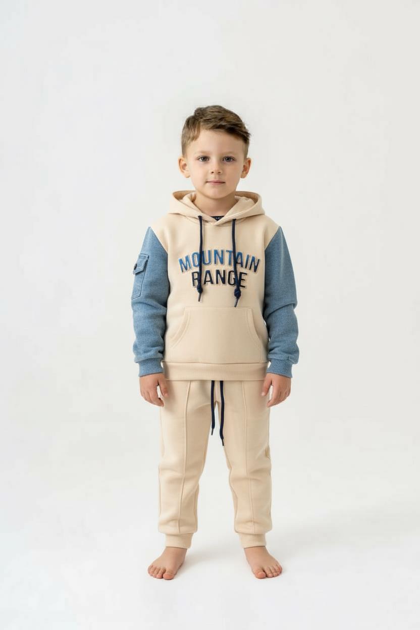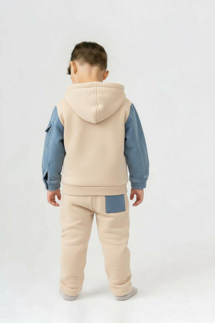 Bu erkek çocuk eşofman takımı, konfor ve şıklığı bir araya getiriyor. Bej renk hakimiyetindeki takımın kolları denim görünümlü mavi renkte olup, kapüşonlu tasarımı ile soğuk havalarda sıcak tutar. Üst parça kanguru cepli, kordonlu kapüşonlu ve uzun kolludur. Ayrıca kol kısmında cep detayı bulunmaktadır. Alt parça ise rahat kesimli, bilek kısmı ribanalı ve arkada mavi renkli bir cep aksesuarı ile dikkat çekmektedir. Takım, çocukların hareket özgürlüğünü kısıtlamadan günlük kullanıma uygundur.