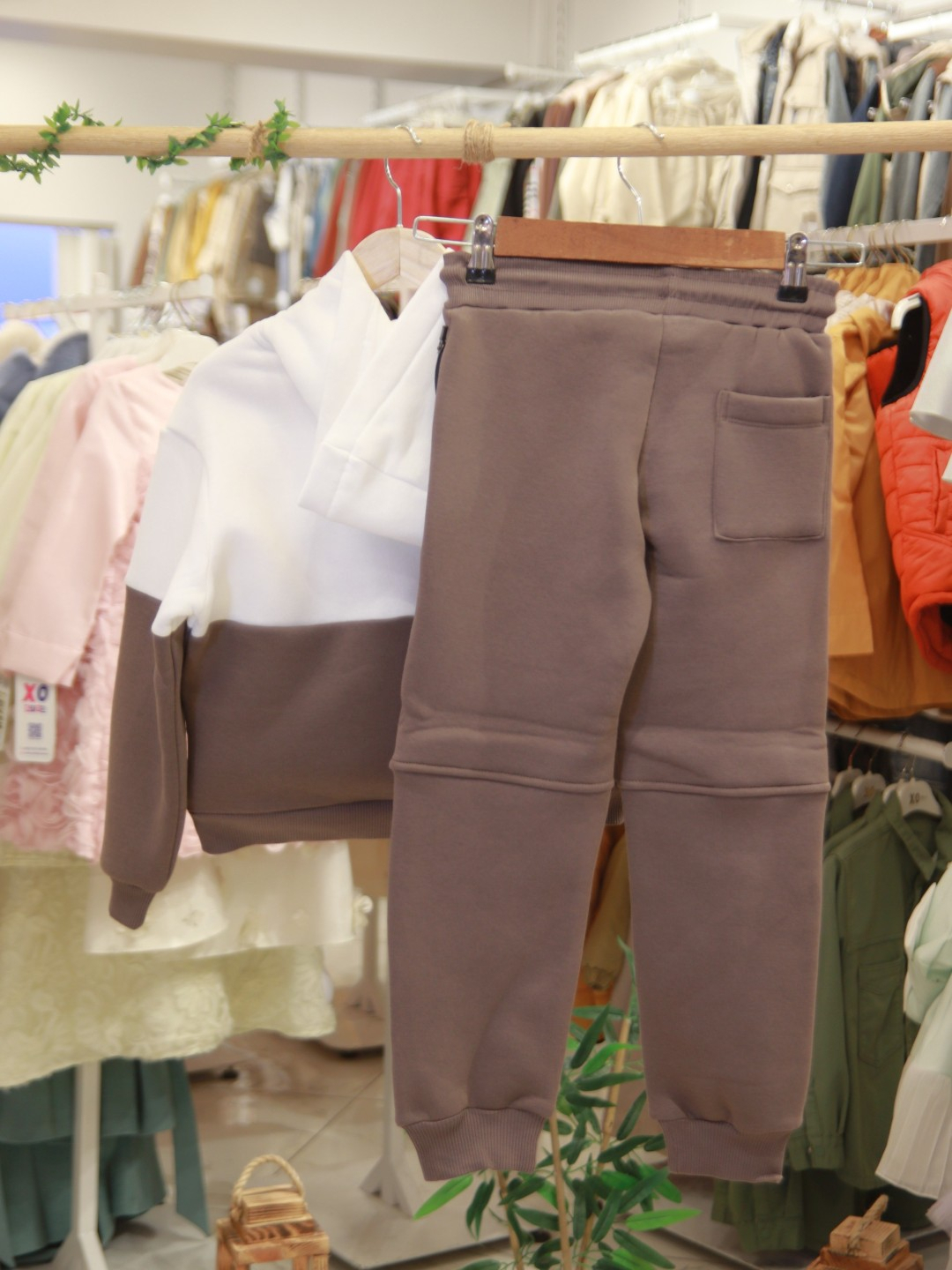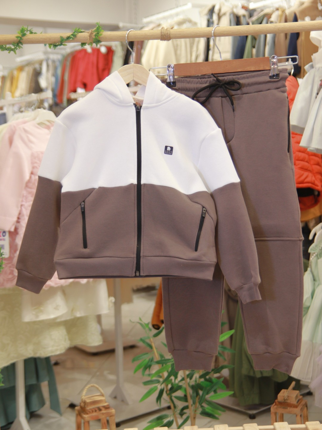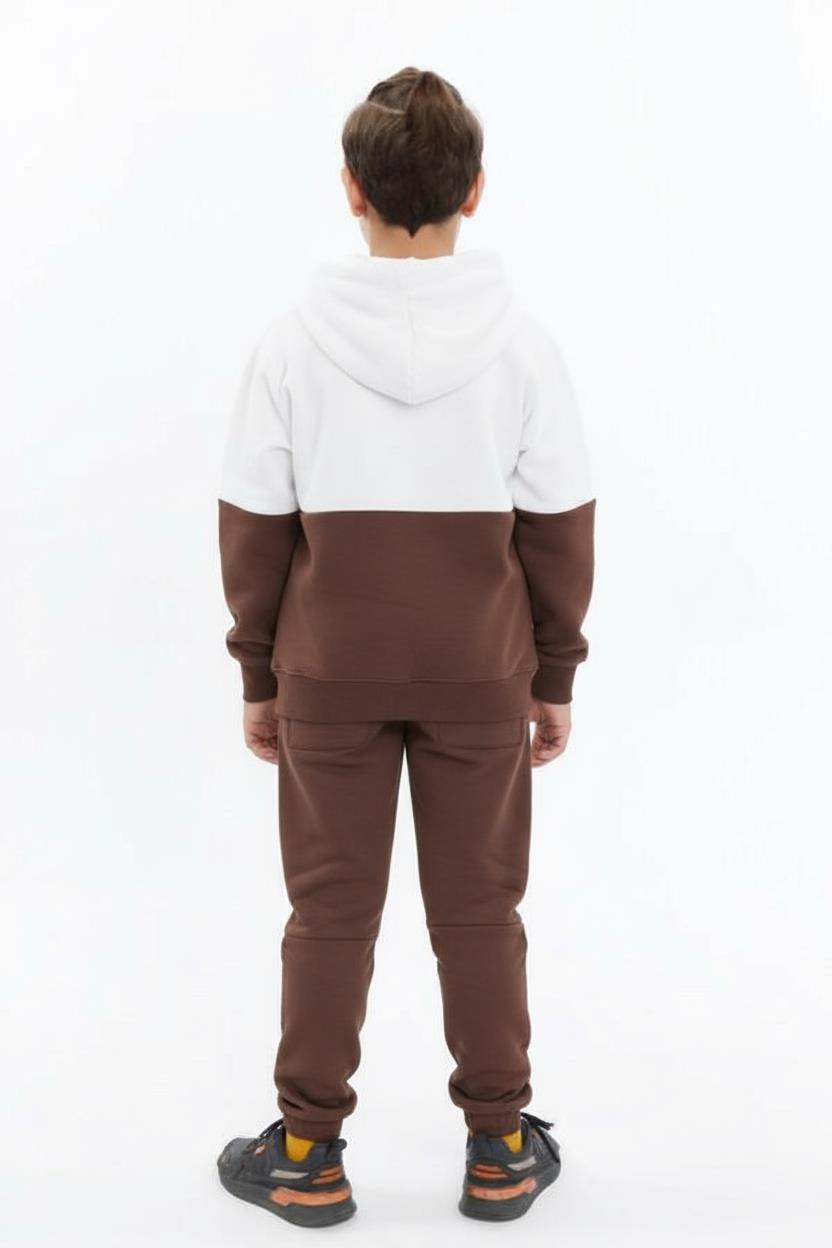 Bu erkek çocuk eşofman takımı, kış aylarında sıcak ve rahat bir giyim deneyimi sunmak için tasarlanmıştır. Kapüşonlu üst kısmı ve fermuarlı önü ile kullanımı oldukça pratiktir. Kahverengi ve beyaz renklerin şık uyumuyla dikkat çeken takım, uzun kollu ve cepli yapısıyla hem fonksiyonel hem de modern bir görünüm sağlar. Alt kısmı bağcıklı ve lastikli paçalarla konforlu bir oturuş sunar. Spor ve günlük kullanım için ideal olan bu takım, çocukların hareket özgürlüğünü kısıtlamadan stil sahibi olmalarını sağlar.