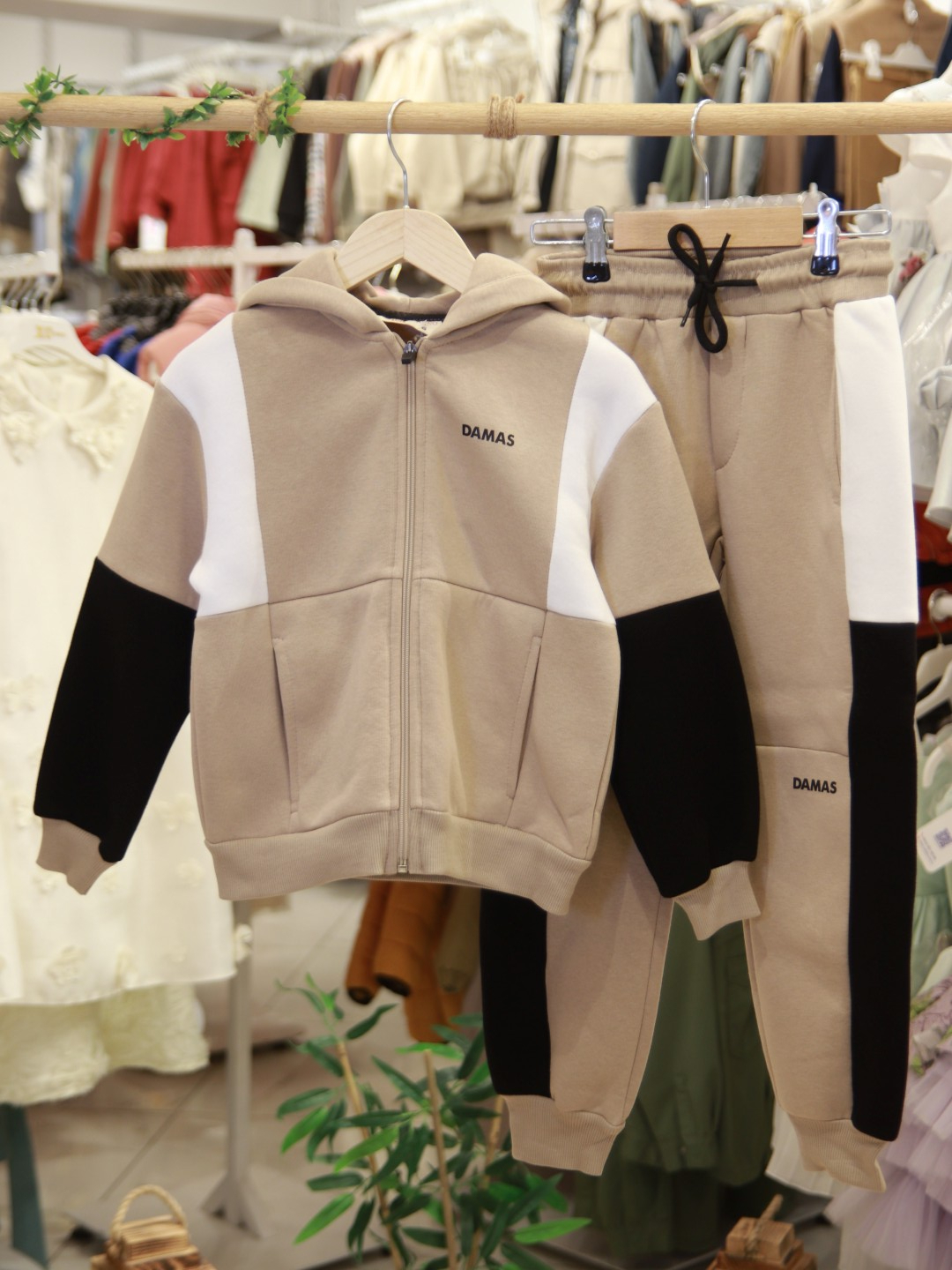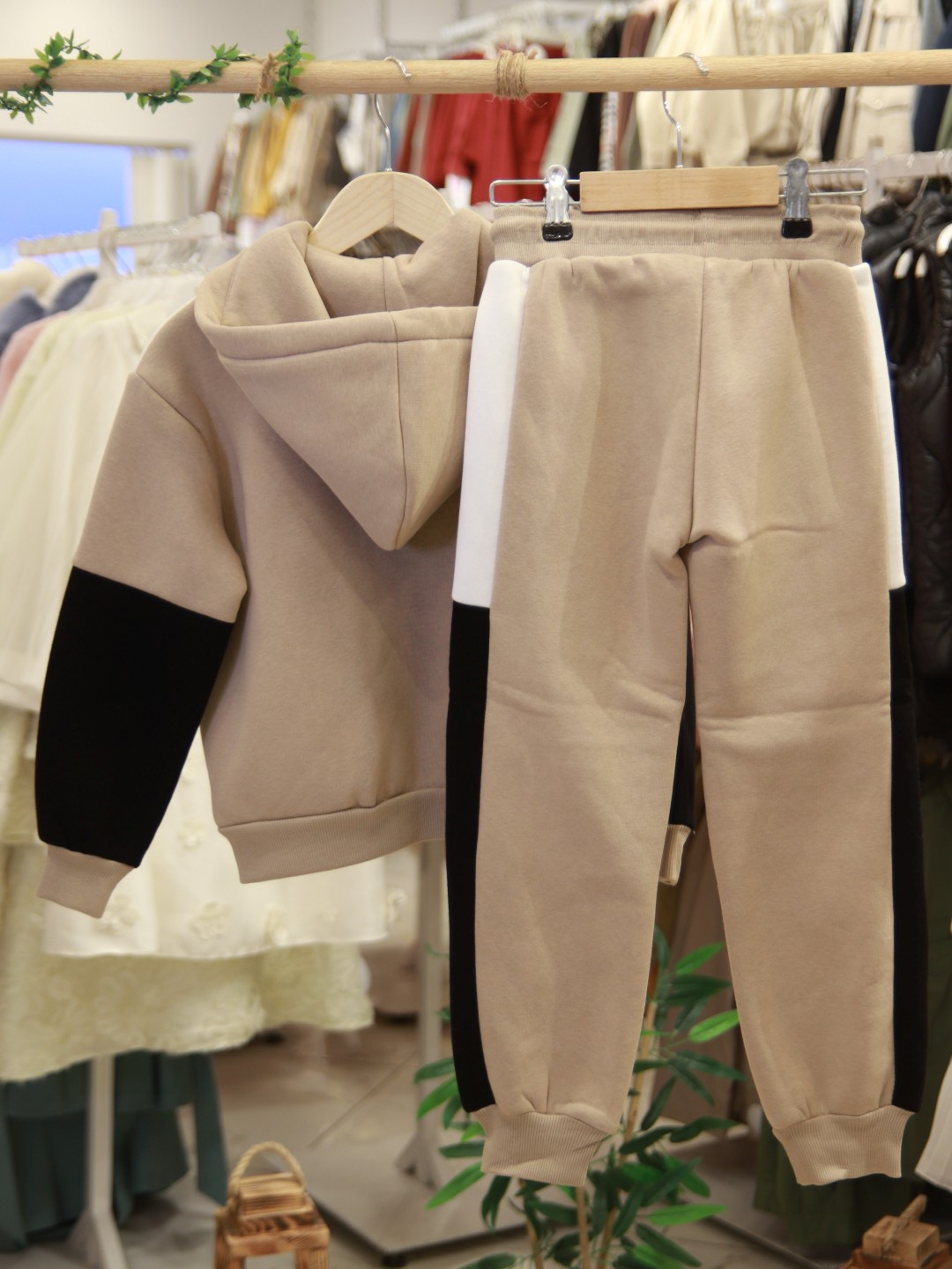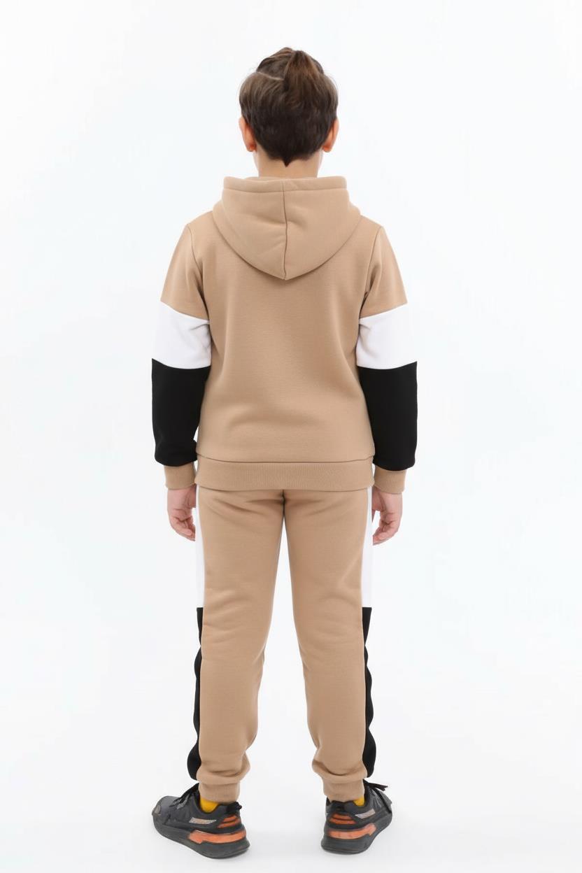 Bu erkek çocuk eşofman takımı, kış ayları için ideal sıcak ve rahat bir seçenektir. Kapüşonlu üstü fermuarlı olup, renk bloklu tasarımıyla dikkat çeker. Siyah ana renk üzerine bej ve beyaz renk blokları, modern ve sportif bir görünüm sunar. Üstte ve altta rahat hareket imkanı sağlayan ribana manşetler bulunur. Alt eşofman paçalarında lastikli bitiş ve kordon detayı vardır. Günlük kullanıma ve spor aktivitelerine uygun, şık ve fonksiyonel bir takımdır.
