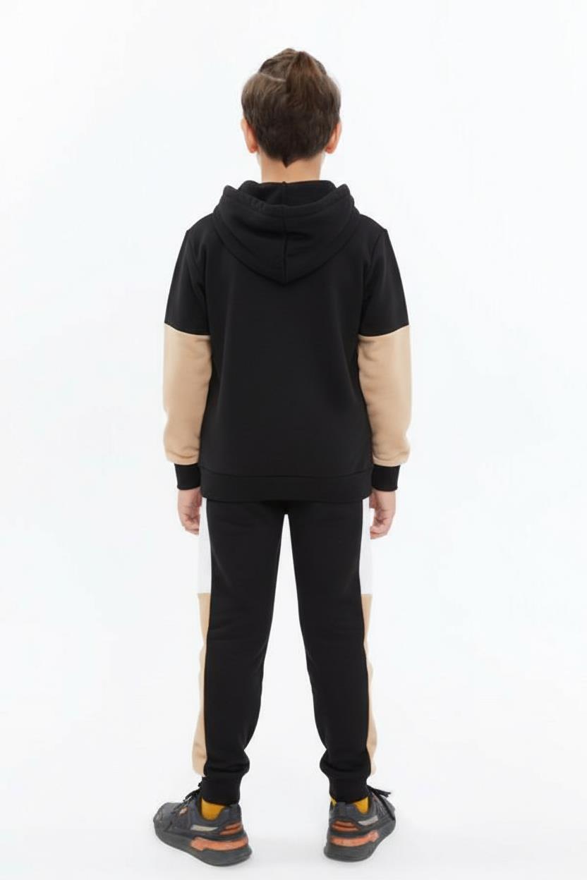 Bu erkek çocuk eşofman takımı, kış ayları için ideal sıcak ve rahat bir seçenektir. Kapüşonlu üstü fermuarlı olup, renk bloklu tasarımıyla dikkat çeker. Siyah ana renk üzerine bej ve beyaz renk blokları, modern ve sportif bir görünüm sunar. Üstte ve altta rahat hareket imkanı sağlayan ribana manşetler bulunur. Alt eşofman paçalarında lastikli bitiş ve kordon detayı vardır. Günlük kullanıma ve spor aktivitelerine uygun, şık ve fonksiyonel bir takımdır.