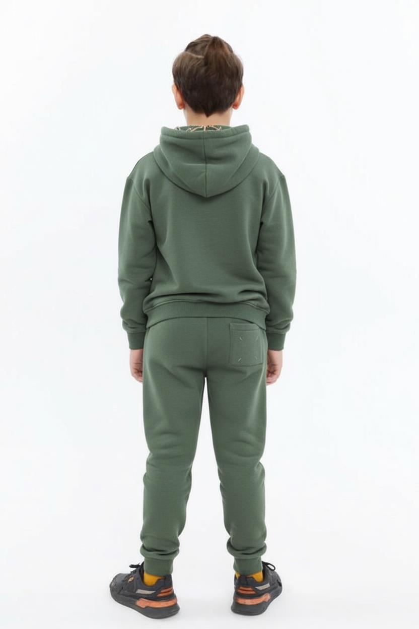 Bu Erkek Çocuk Eşofman Takımı, kış sezonu için özel olarak tasarlanmış şık ve rahat bir set. Kapüşonlu üst kısmı, kapüşonun iç kısmında desenli detaylarla zenginleştirilmiş. Fermuar bulunmayan bu takım, kanguru cepli ve uzun kollu olarak tasarlanmış. Alt pantolon ise bel kısmında ayarlanabilir bağcıklarla desteklenmiş, yanlarda desenli şerit detayları ve arkada tek cep mevcut. Eşofmanın bilekleri lastikli, böylece hem rahat hem de sıcak tutan bir kullanım sağlıyor. Spor ve günlük kullanım için ideal, mint yeşili tonlarında sade ama dikkat çekici bir görünüm sunuyor.