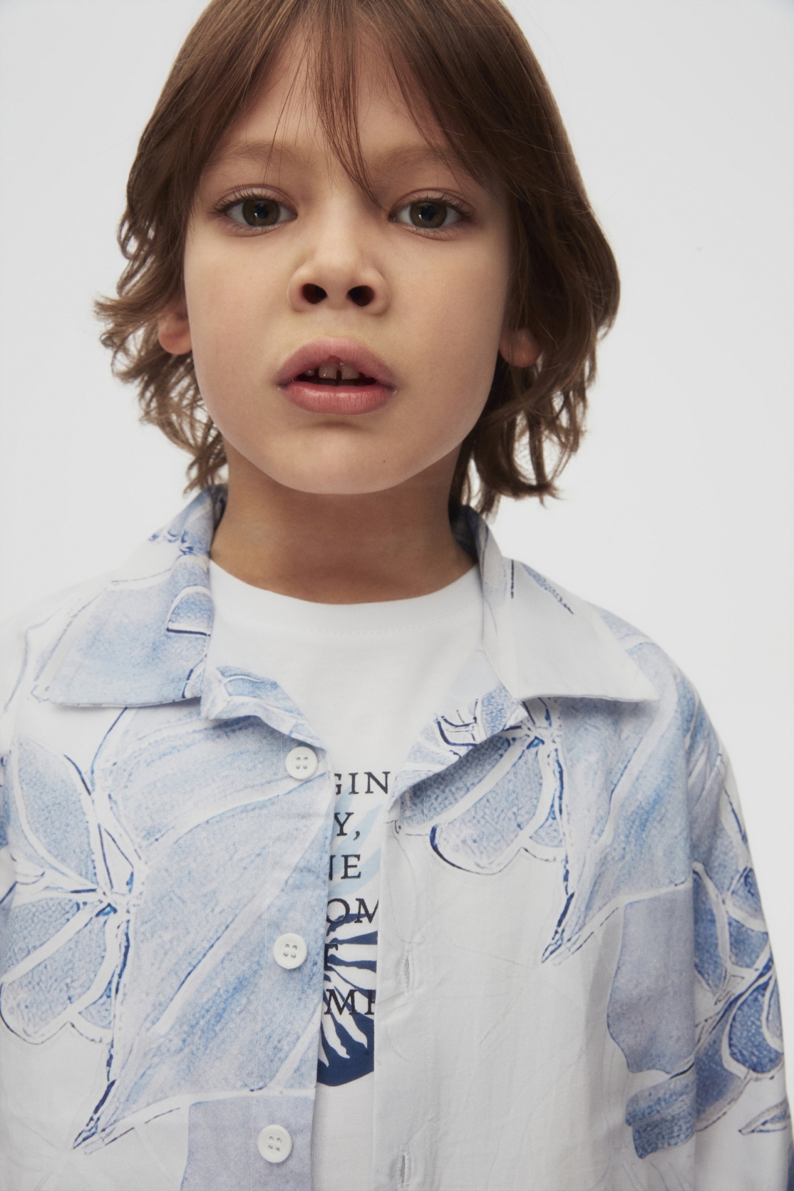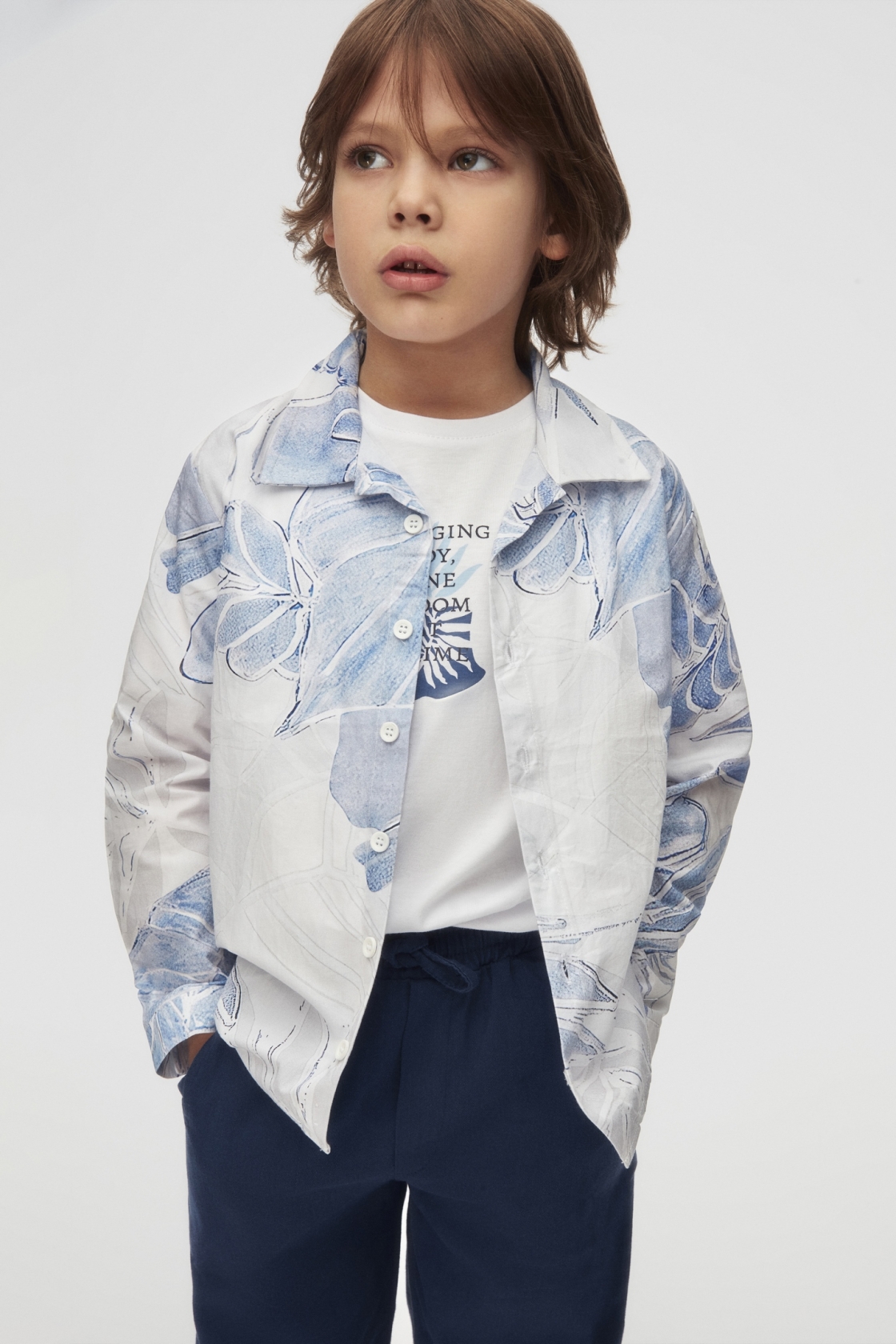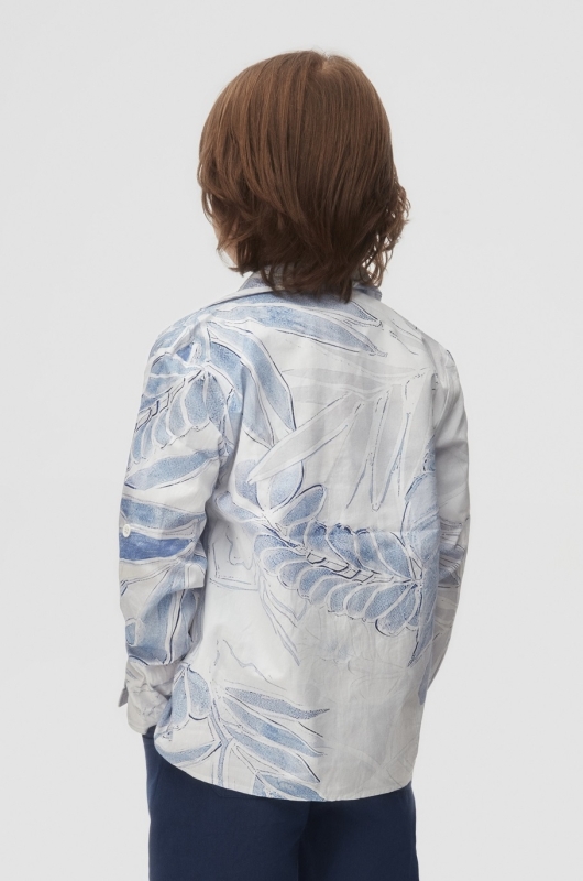 Bu erkek çocuk gömleği, hafif ve rahat dokusuyla günlük kullanıma uygundur. Kapüşon bulunmayan gömlek, klasik düğmeli ön kapamaya sahiptir. Uzun kollu ve standart kol manşetlerine sahip olan gömlek, bisiklet yaka yerine klasik yaka detayına sahiptir. Gömleğin üzerinde mavi tonlarda büyük yaprak desenleri bulunmaktadır, bu da ürüne modern ve canlı bir görünüm kazandırır. Spor ve casual tarzları seven çocuklar için ideal bir seçimdir.