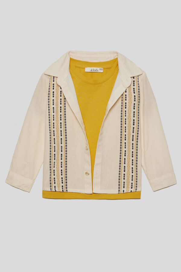 Bu şık erkek çocuk gömleği, rahat ve şık bir görünüm sunuyor. Krem rengi, her türlü kombinle uyum sağlarken, ön kısmındaki detaylı desenler ile dikkat çekiyor. Düğmeli yapısı, şıklığı artırırken, uzun kolları ile hem yaz hem de bahar aylarında kullanılabilir.