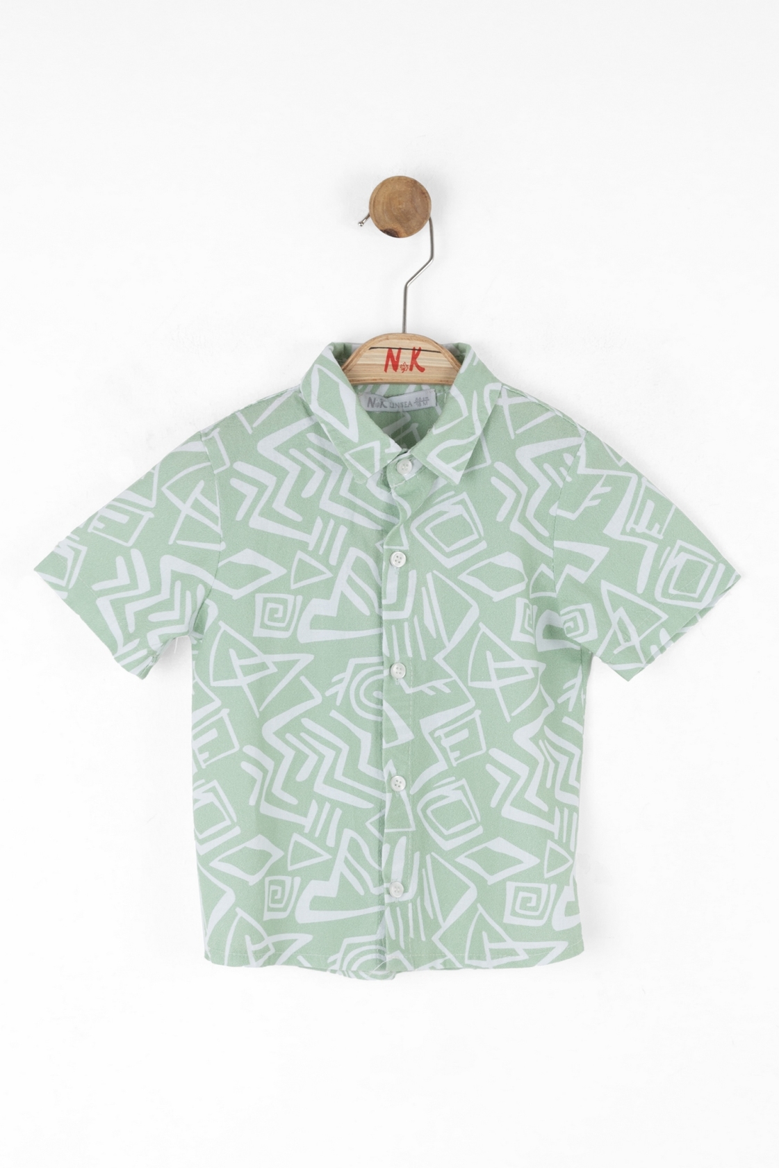 This boys' shirt is perfect for summer with its short sleeves providing comfort and breathability. Featuring a green base with white abstract geometric patterns, it offers a modern and playful look. The classic collar and front button closure make it suitable for both casual and special occasions. Its lightweight fabric ensures freedom of movement for active kids.