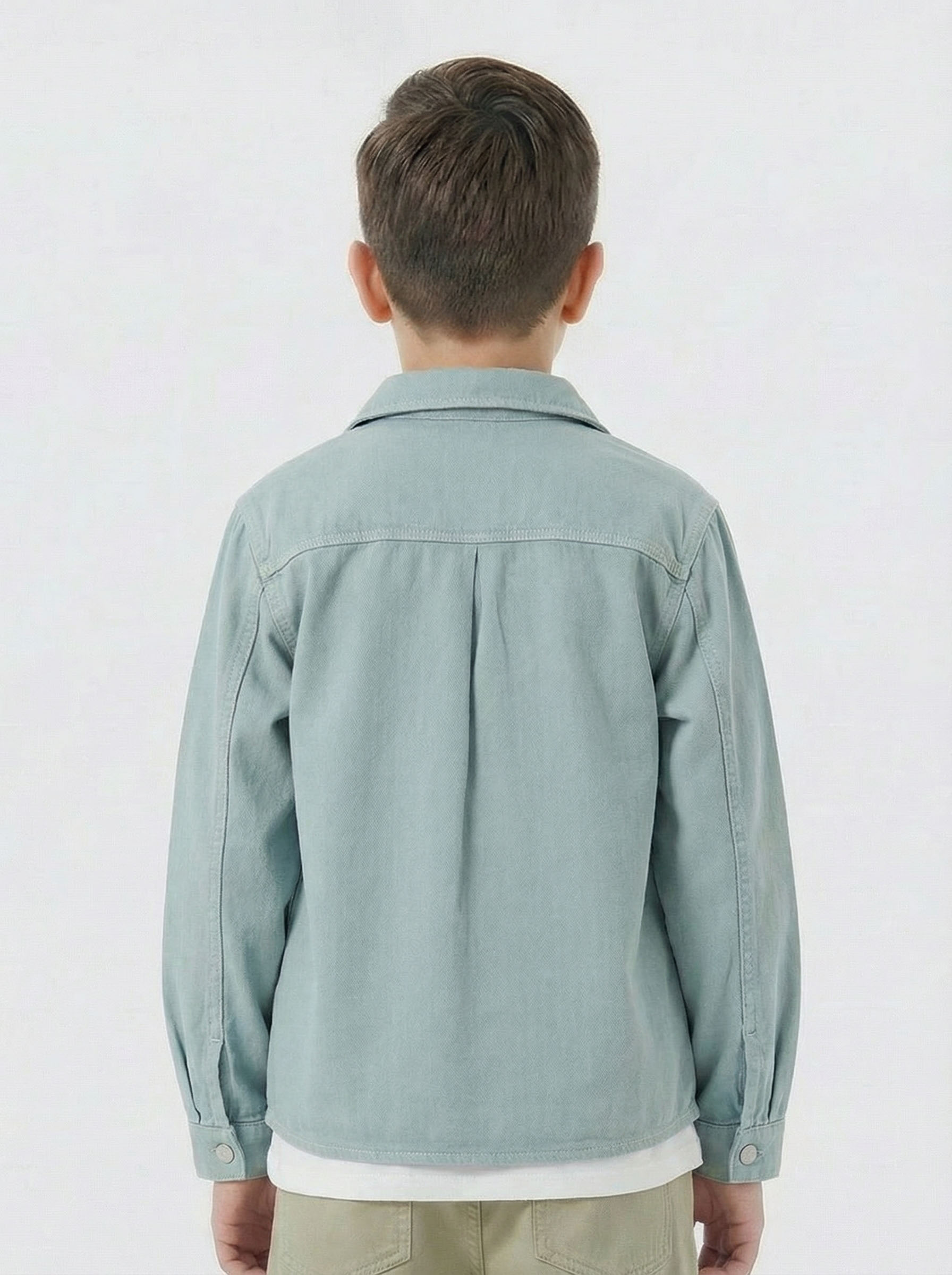 This boys' shirt features a comfortable and stylish design in a soft blue shade. It has long sleeves and a classic collar. The front closure is hidden with buttons, offering a clean and neat appearance. There are two chest pockets that add a functional detail. On the lower left side, a small palm tree patch adds a unique decorative touch. The visible stitching details give it a sporty vibe. Ideal for daily wear, this lightweight and comfortable shirt is perfect for active kids looking for casual style.