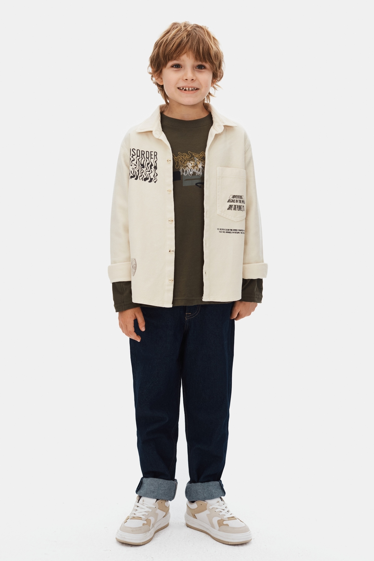 This olive green shirt is designed for boys, offering a comfortable and stylish look. It features a button-up front without a hood and long sleeves with rolled cuffs. The shirt includes printed text and graphic details on the left chest pocket and front, adding a trendy touch. Perfect for casual and sporty wear, it is an ideal outer layer for transitional seasons.