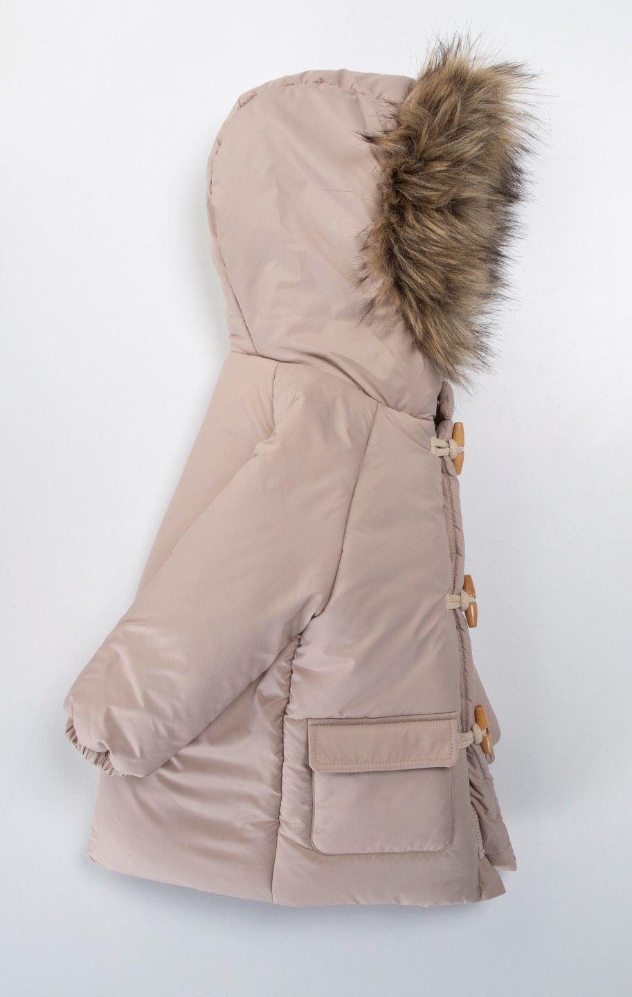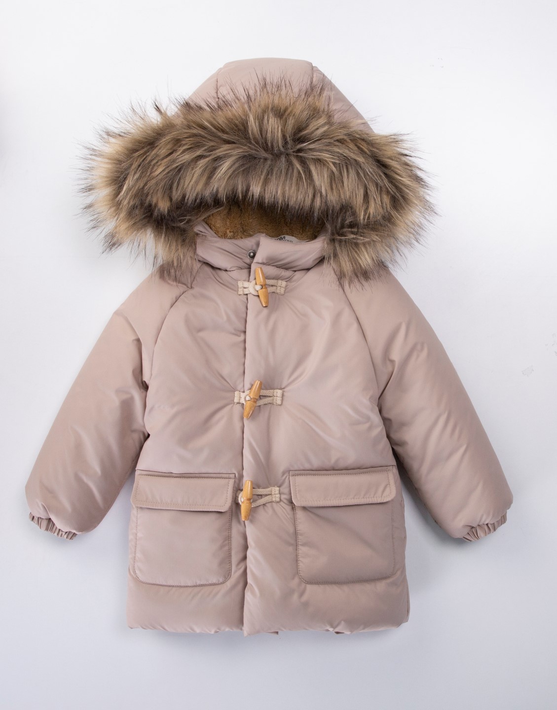 Bu erkek çocuk montu, soğuk kış günlerinde sıcak tutmak için tasarlanmıştır. Kapüşonlu yapısı ve kapüşon etrafındaki doğal görünümlü tüylü detayları sayesinde hem şık hem de koruyucu bir dış giyim ürünüdür. Fermuarlı yerine ahşap tokalı çıtçıtlar kullanılmış, bu da montun klasik ve samimi bir havası olmasını sağlar. Montun önü cepli olup, ceplerin kapaklı olması küçük eşyaların güvenle taşınmasına olanak verir. Uzun kollu ve bilek kısmı lastikli yapısıyla rüzgar geçirmez, böylece çocuklar rahatça hareket edebilir.