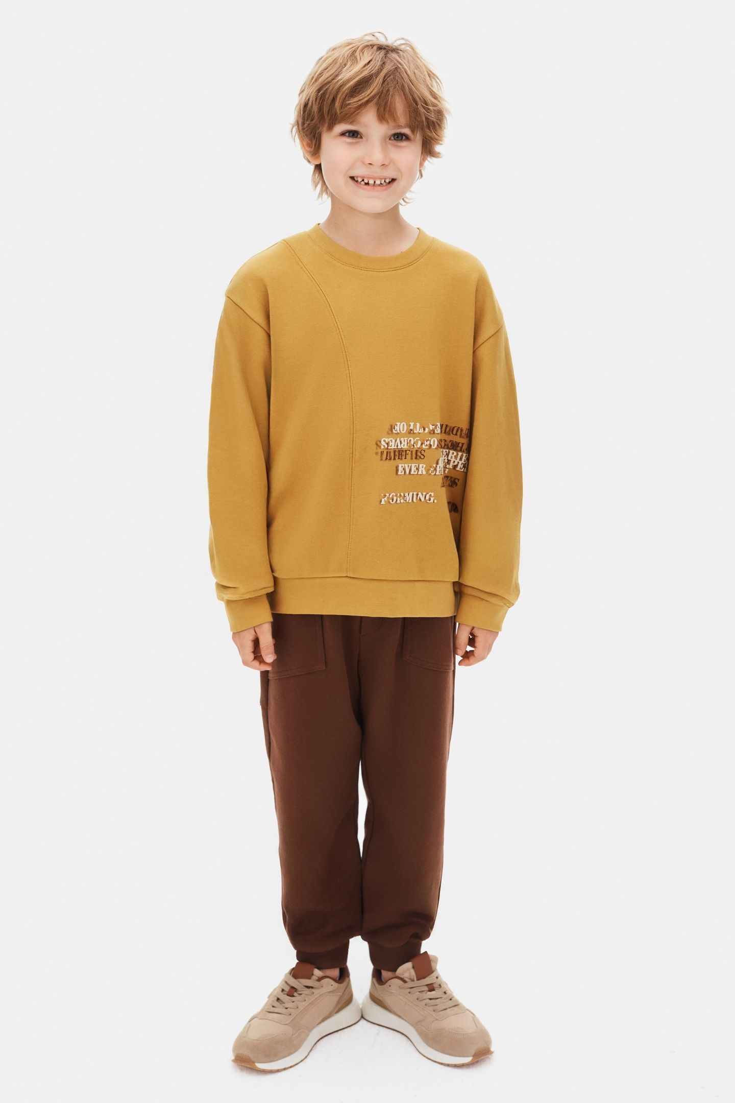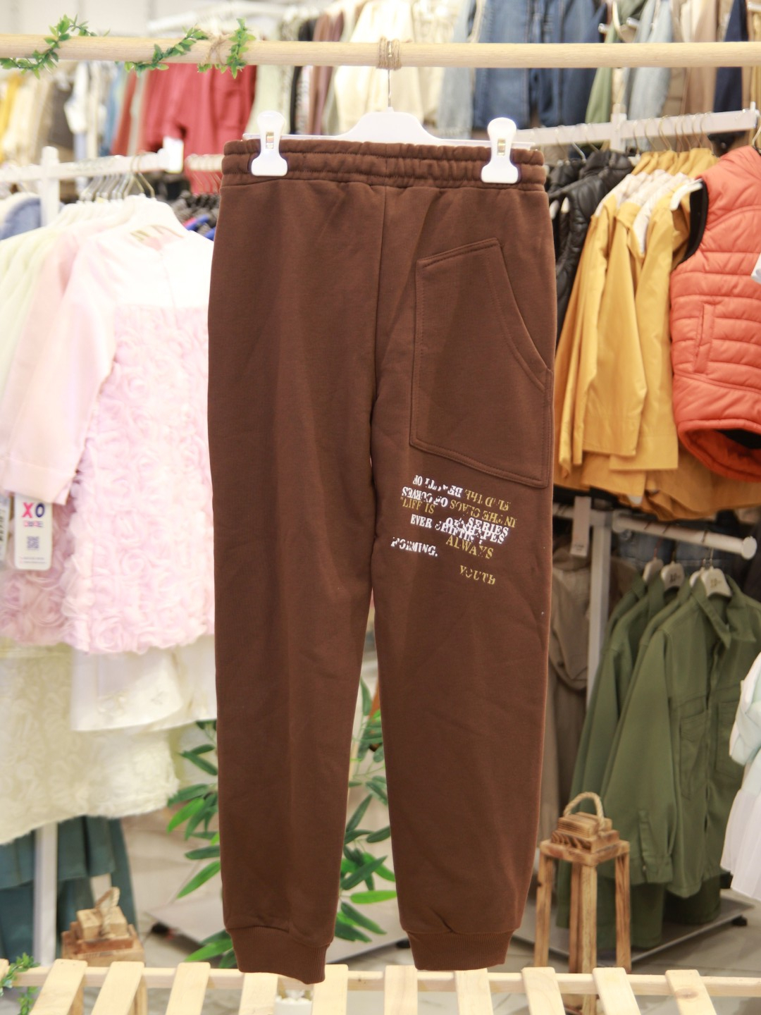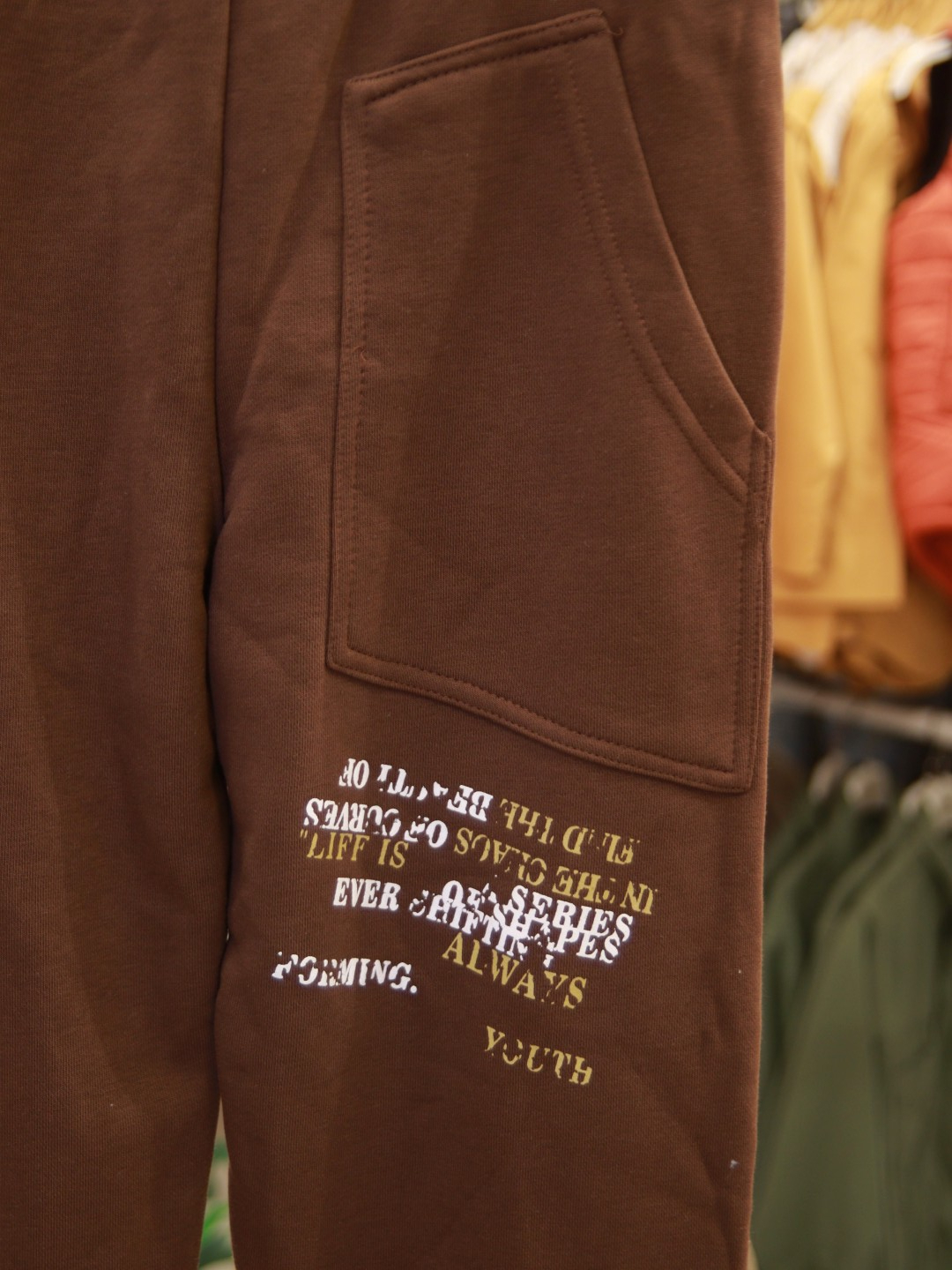 تتميز هذه البنطلونات للأطفال من الذكور بأنها اختيار مثالي لموسم الشتاء، حيث تجمع بين الراحة والأناقة. البنطلون بلون بني غني، مصنوع من قماش سميك ومرن. يحتوي على تفاصيل مطاطية عند الخصر والكاحلين للحفاظ على الدفء وتوفير سهولة الحركة. كما يحتوي على جيوب جانبية عملية. يوجد على الساق اليمنى طباعة نصية باللونين الأصفر والأبيض تضفي مظهراً رياضياً وعصرياً. تصميم واسع ومرن يضمن راحة الطفل أثناء النشاط اليومي.
