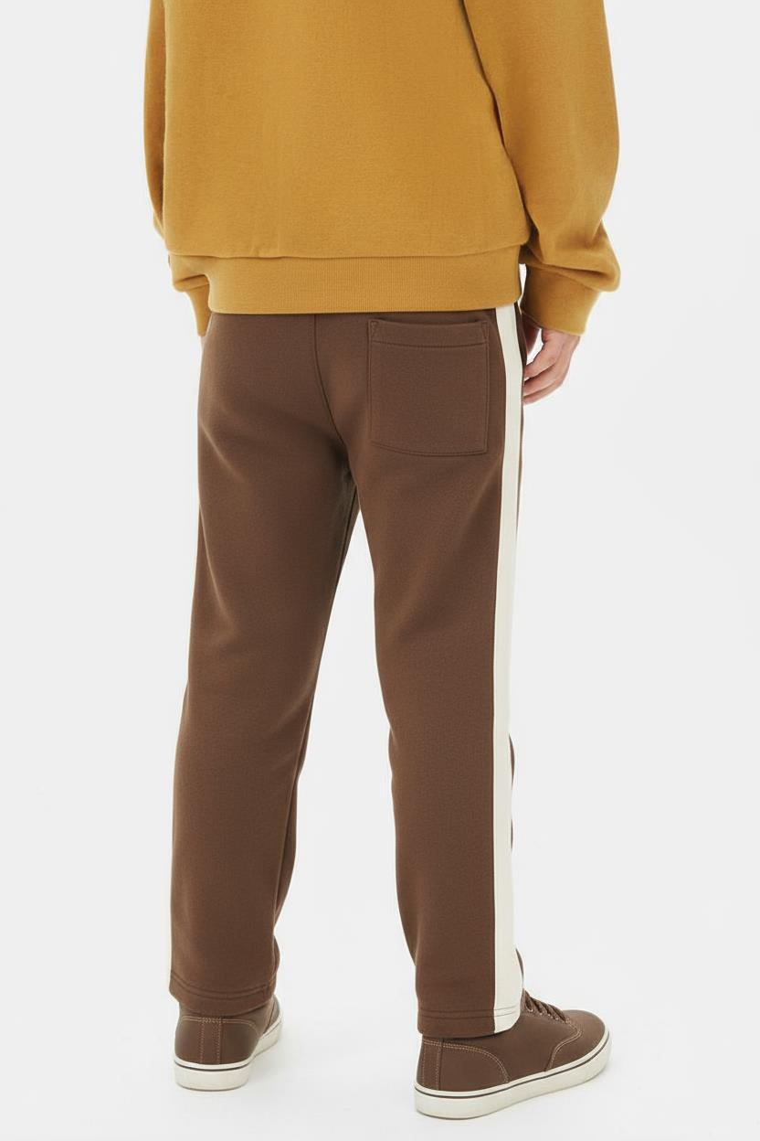 Bu kahverengi erkek çocuk pantolonu, kış sezonu için ideal bir tercih. Rahat ve spor bir tasarıma sahip olan pantolon, belinde ayarlanabilir beyaz kordon detayıyla kullanışlılık sunar. Yanlarda beyaz şeritler bulunmakta, bu da hareketli ve dinamik bir görünüm kazandırmaktadır. Pantolonun paçaları kısa kesim olup, rahat hareket imkanı sağlar. Ayrıca hem yanlarda hem de arkada cepler bulunur, böylece küçük eşyaların taşınması kolaylaşır. Yumuşak ve kalın kumaşı ile soğuk havalarda ekstra konfor sağlar.