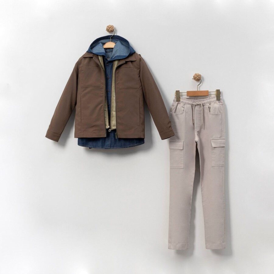 Erkek çocuklar için tasarlanmış bu pantolon takımı, hem şık hem de rahat bir görünüm sunmaktadır. Haki renkteki pantolon ve denim gömlek, günlük kullanım için idealdir. Havanın değişken olduğu günlerde, kapüşonlu gömlek sayesinde çocuklar soğuktan korunurken, şıklıklarından ödün vermezler.
