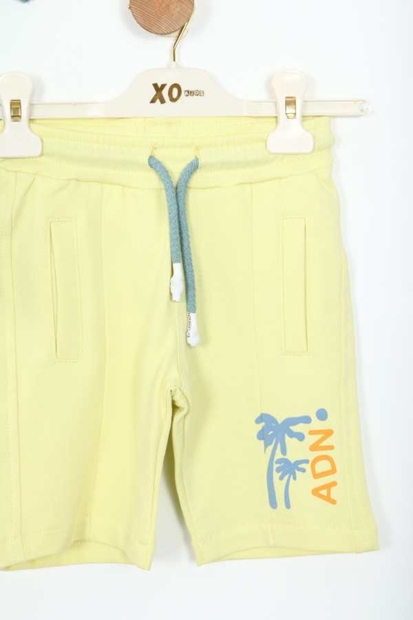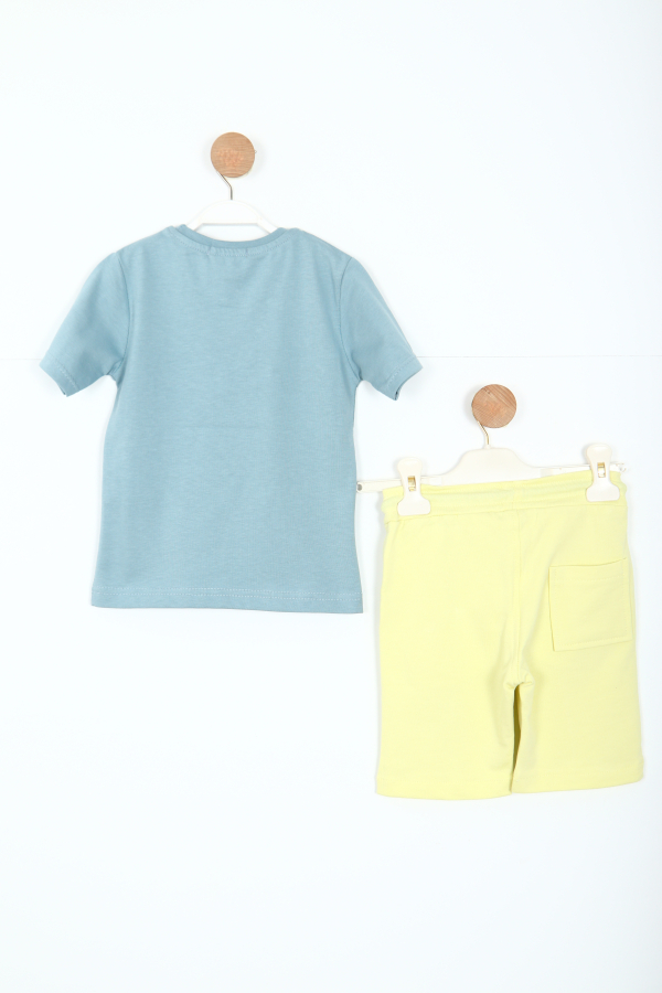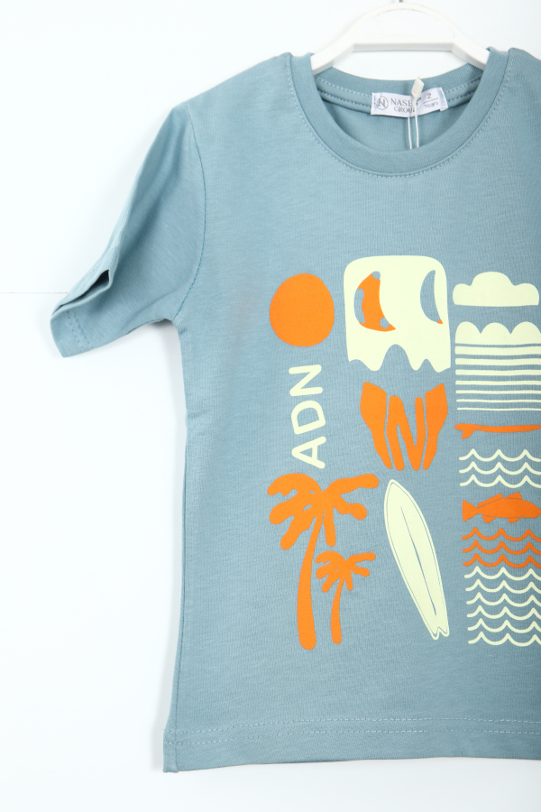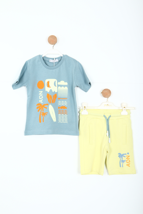 Bu erkek çocuk alt üst takımı, yaz ayları için ideal bir seçimdir. Mavi renkteki kısa kollu tişört, canlı turuncu ve krem rengi baskılarla süslenmiştir. Bisiklet yakalı tişört, rahat kesimi ve yumuşak kumaşıyla çocukların hareket özgürlüğünü destekler. Açık sarı renkteki şort ise belinde ayarlanabilir kordonlu yapısı ve cepleriyle pratik kullanım sunar. Şortun üzerinde tişörtle uyumlu palmiyeli ve "ADN" yazılı baskılar bulunmaktadır. Hem şık hem de spor tarzıyla günlük kullanıma uygundur.