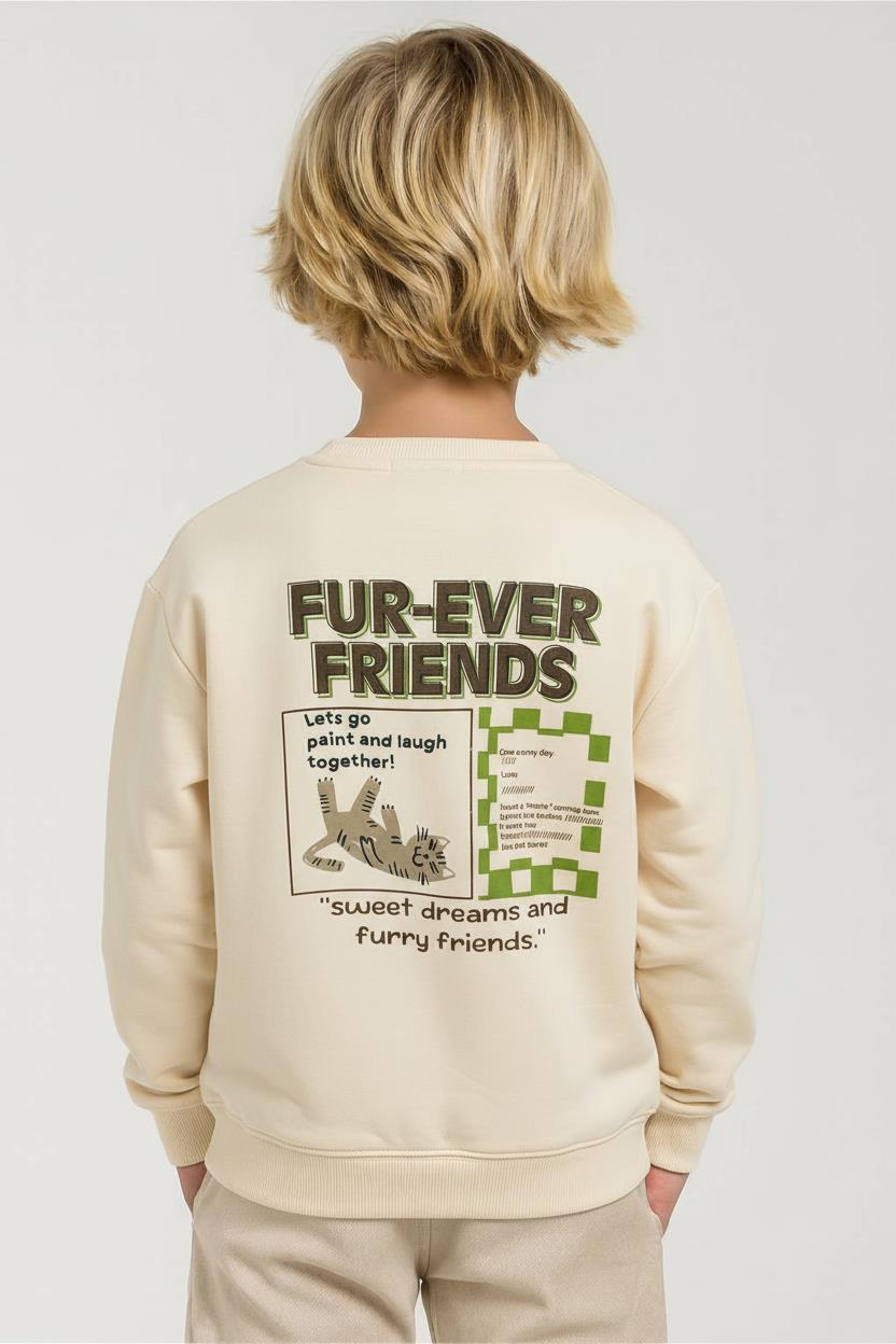 Bu erkek çocuk sweatshirtü, kış mevsimi için ideal, sıcak tutan ve rahat bir tasarıma sahiptir. Krem rengindeki model, sade ve şık görünümünü küçük detaylarla zenginleştiriyor. Sıfır yakalı, uzun kollu ve kapüşonsuz yapısıyla günlük kullanıma uygundur. Ön kısmında kanguru cepli ve arka tarafında eğlenceli, çizgi film tarzında "Fur-Ever Friends" baskısı yer alır. Yumuşak ve konforlu kumaşı sayesinde çocukların hareket özgürlüğünü kısıtlamadan sıcak kalmalarını sağlar.