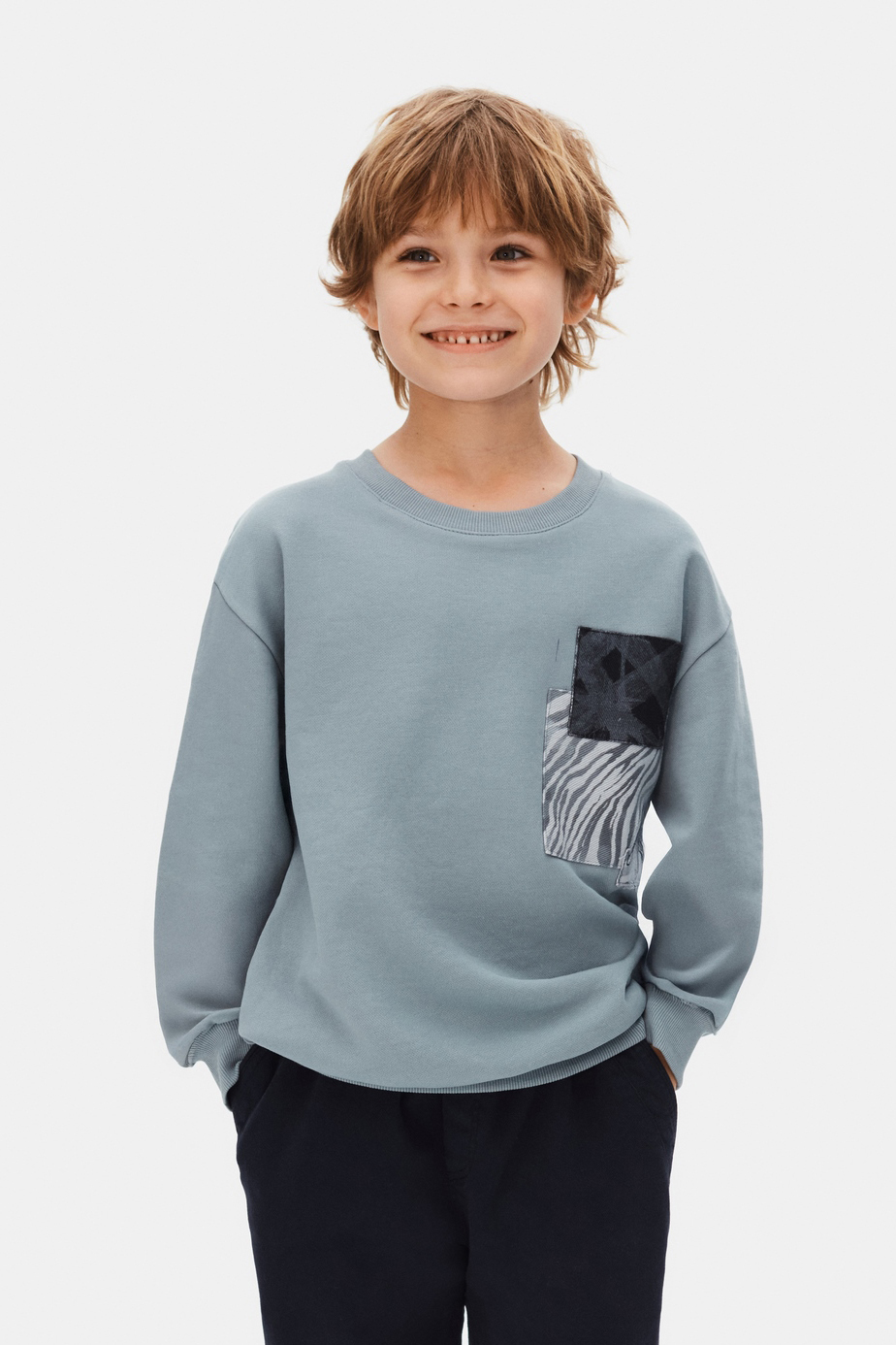 تقدم هذه السترة الصبيانية خيارًا مريحًا وأنيقًا للارتداء اليومي. بتصميم بدون غطاء رأس وأكمام طويلة وياقة دائرية، توفر مظهرًا بسيطًا ونظيفًا. تأتي السترة باللون الأزرق الناعم مع جيوب أمامية ذات نقشين مميزين، مما يضيف لمسة رياضية وعصرية. توفر الأساور والحافة المضلعة ارتداءً مريحًا. مناسبة للأطفال من عمر 9 إلى 14 عامًا.