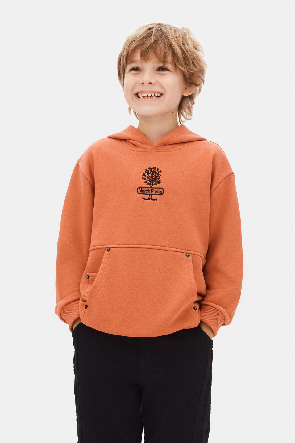 Bu kiremit renkli erkek çocuk sweatshirtü, rahat ve şık tasarımıyla çocukların günlük giyiminde ideal bir tercih sunar. Kapüşonlu yapısı sayesinde soğuk havalarda ekstra koruma sağlar. Fermuar yerine sade bir tasarım kullanılmıştır ve ön kısmında cepli kanguru cebi bulunur. Cep detaylarında küçük siyah düğmeler mevcuttur. Uzun kollu ve bisiklet yaka olmayan, kapüşonlu bir modeldir. Sweatshirt, sade ve doğal bir ağaç temalı işleme ile süslenmiş olup, sportif ve casual tarzları seven çocuklar için uygundur.
